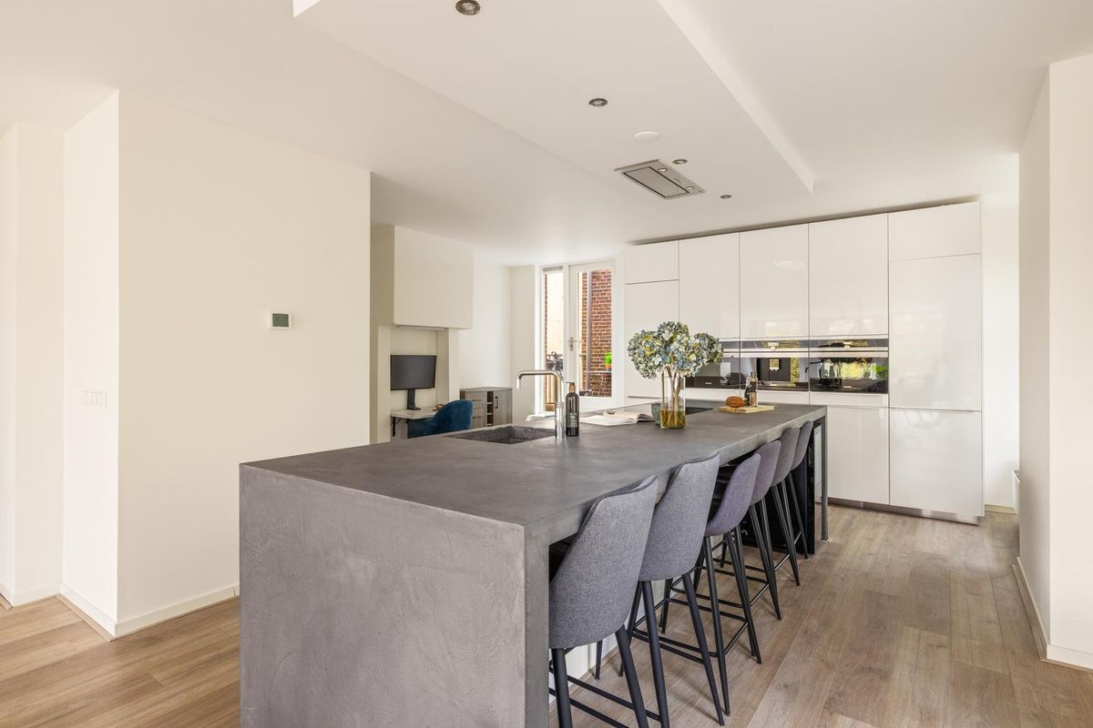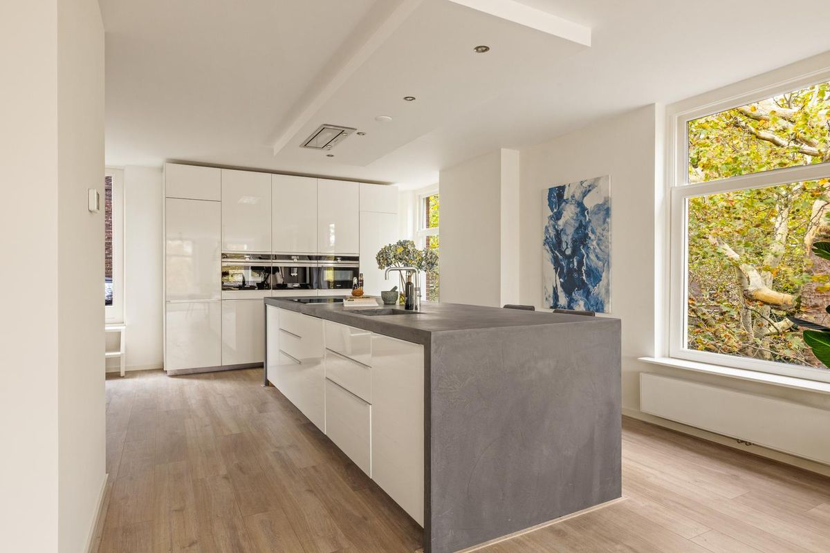 De derde verdieping vormt het sociale hart van het huis. Hier vindt u een lichte, open living met grote ramen aan drie zijden. Aan de voorzijde kijkt u uit over de gracht, aan de zijkant op een park en aan de achterzijde vangt het balkon op het zuidwesten de middagzon. De strakke witte keuken is elegant en praktisch, met een royaal eiland en barzit voor zes. De keuken is volledig uitgerust met Siemens-apparatuur, waaronder twee ovens, een ingebouwd koffiezetapparaat, een inductiekookplaat, een Quooker, een vaatwasser en een koelvriescombinatie. Een MOA-wijnklimaatkast en veel bergruimte geven de ruimte een verzorgde en gastvrije uitstraling. Op deze verdieping is ook een gasten-wc met fonteintje.