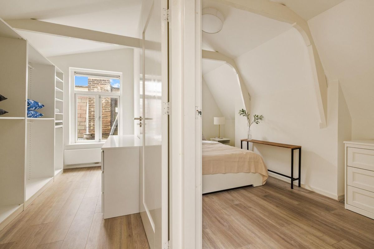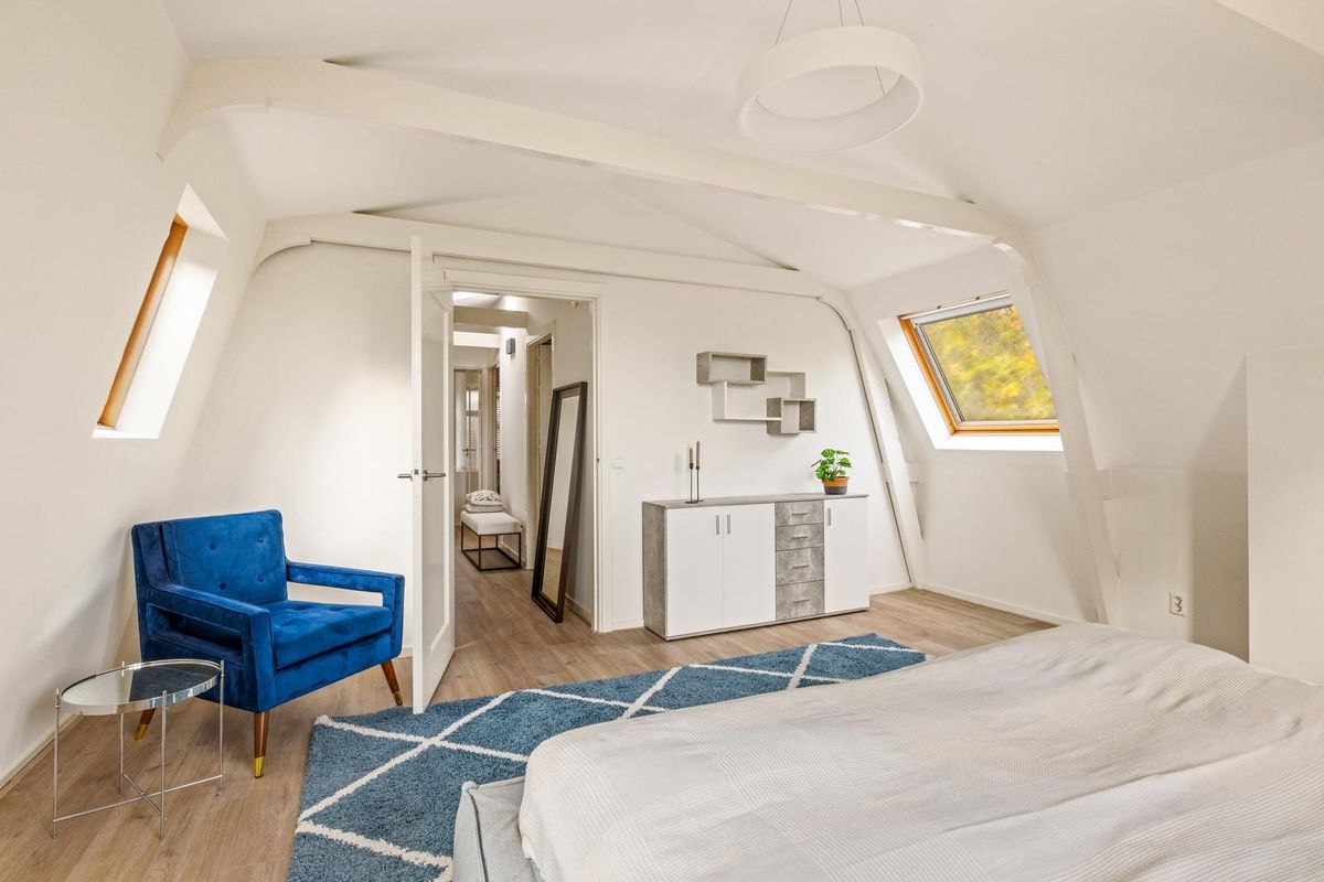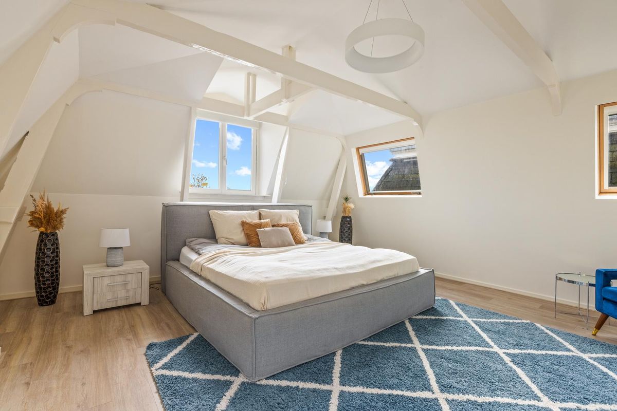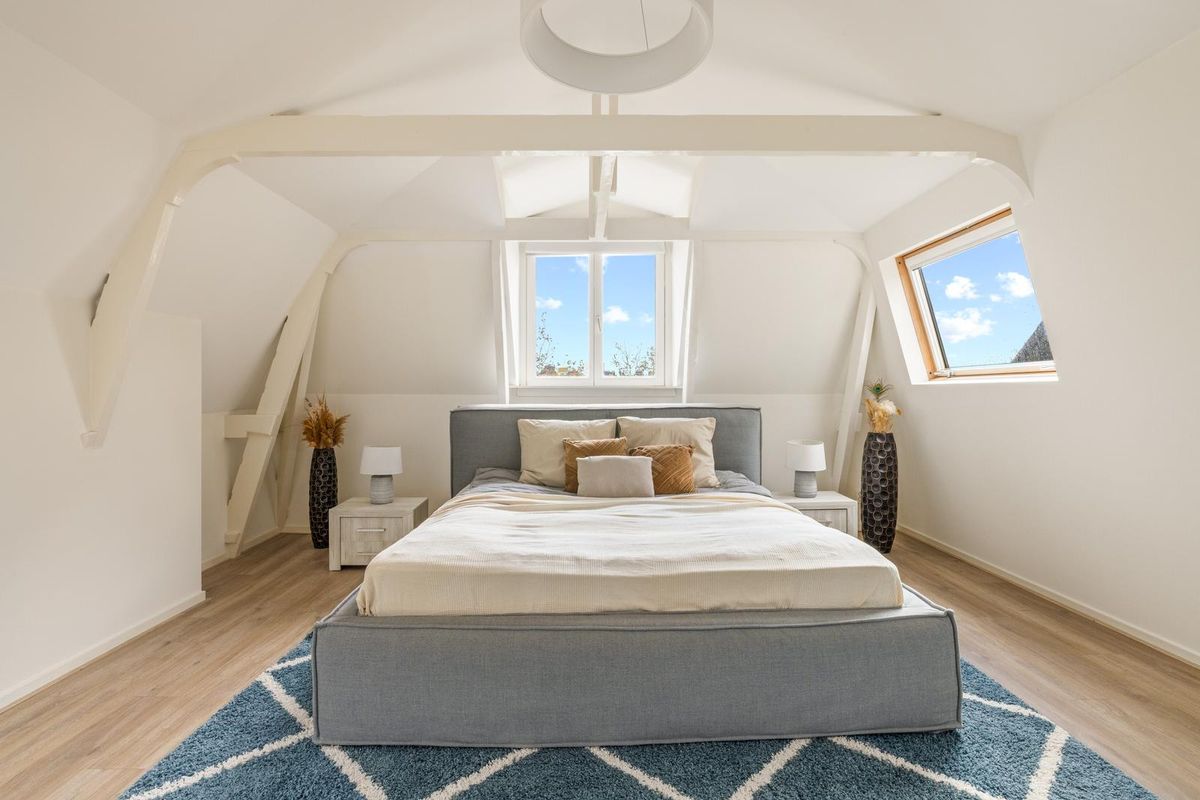 Een trap met klassieke spijlen leidt naar de bovenste verdieping, waar veel daglicht binnenvalt via twee grote ramen en een dakraam. Hier bevinden zich drie comfortabele slaapkamers, een waskast met aansluitingen voor wasmachine en droger en de cv-installatie. De master bedroom heeft fraaie zichtbare balken en ramen aan drie zijden, wat zorgt voor een lichte en serene sfeer. De twee slaapkamers aan de achterzijde zijn rustig en knus, waarvan er één momenteel is ingericht als inloopkast.