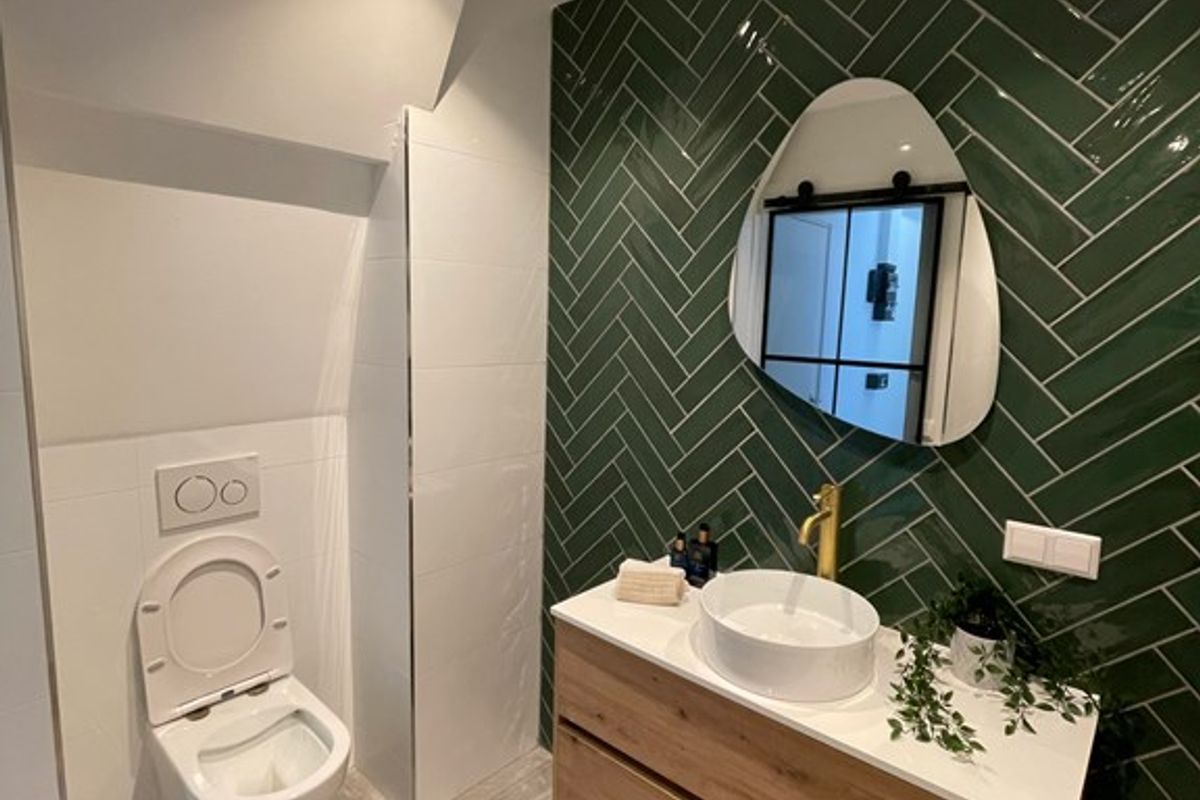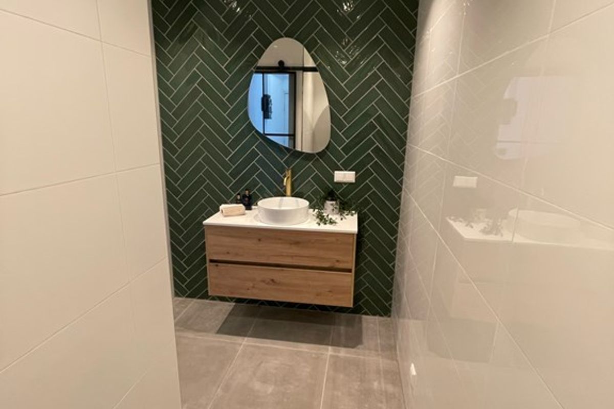 • Moderne badkamer voorzien van ruime inloopdouche, wastafel inclusief wastafelmeubel en toilet.