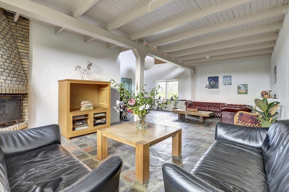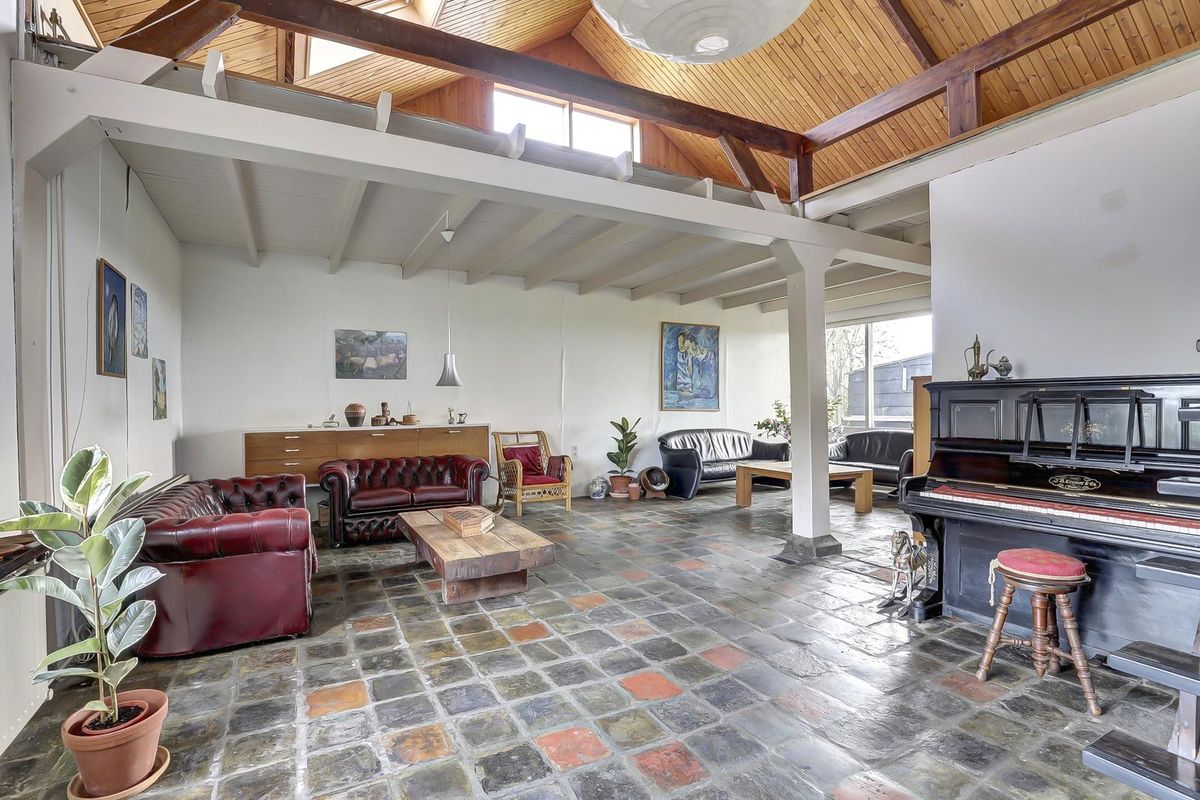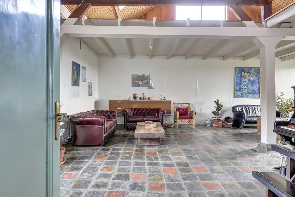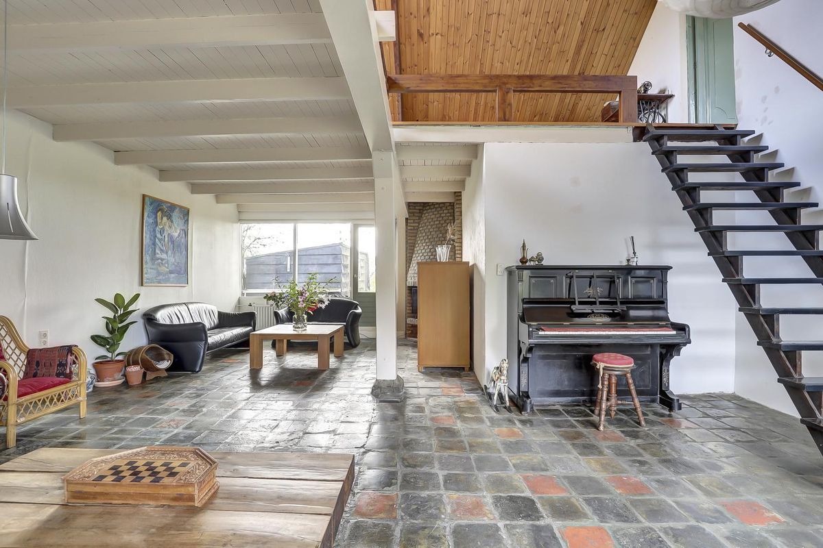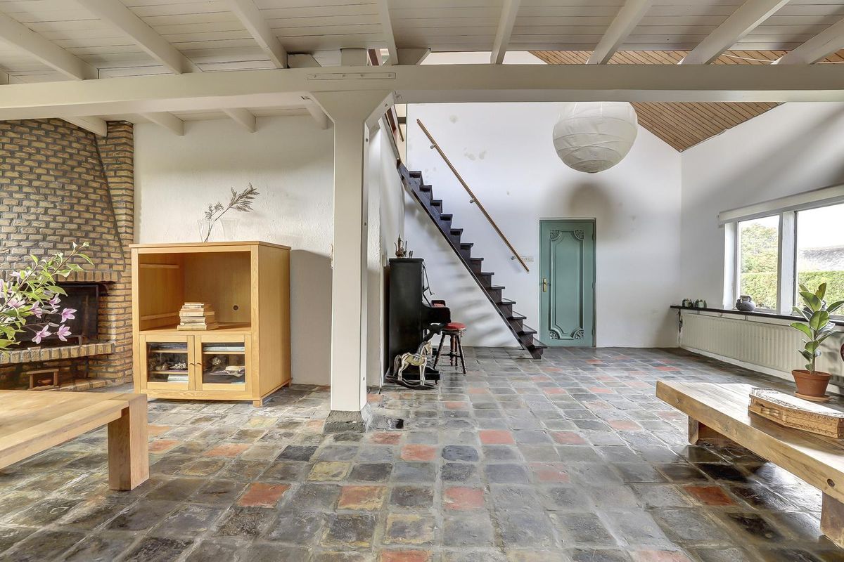 U komt binnen via de entree in de hal met garderobe en toegang tot alle vertrekken. Vanuit de hal stapt u de ruime woonkamer in, een sereen licht vertrek met witgeschilderde balken, grote raampartijen en de prachtige estriken vloer in grijs-antraciet met hier en daar warme roodoranje accenten. De gemetselde schouw vormt een sfeerpunt in het zitgedeelte. De vide en de open trap geven extra hoogte en een loftgevoel. Deze ruimte leent zich perfect om te transformeren tot een stijlvolle woonboerderij met moderne landelijke uitstraling. Denk aan een open leefkeuken in warme tinten met natuurstenen blad, zwarte accenten en houten balken in het zicht. De woonkamer zou prachtig zijn met lichte gietvloer of eikenhouten delen, gecombineerd met stalen deuren richting de hal en grote raampartijen naar de tuin. De vide kan worden ingericht als bibliotheek of werkruimte, met een glazen balustrade voor extra lichtinval.