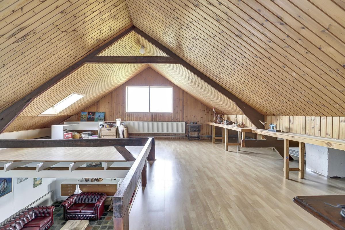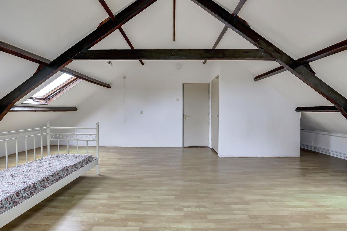 Via de open trap bereikt u een ruime zolderverdieping met meerdere gebruiksmogelijkheden. Direct bovenaan de trap is een royale overloop/atelierruimte met houten betimmering (plafond en wanden in warm naaldhout) en laminaatvloer, ideaal als werkplek of hobbyruimte met zicht op de vide. Aan de andere zijde is een zeer riante slaapkamer met witte wanden, donkere zichtbare spanten, drie dakvensters en een laminaatvloer. De centrale gevel heeft een groot raam met weids uitzicht. Op deze verdieping is bovendien een separaat toilet aanwezig. Door de maatvoering is het eenvoudig om extra kamers te creëren naar eigen wens en inzicht. Achter de knieschotten is bergruimte.