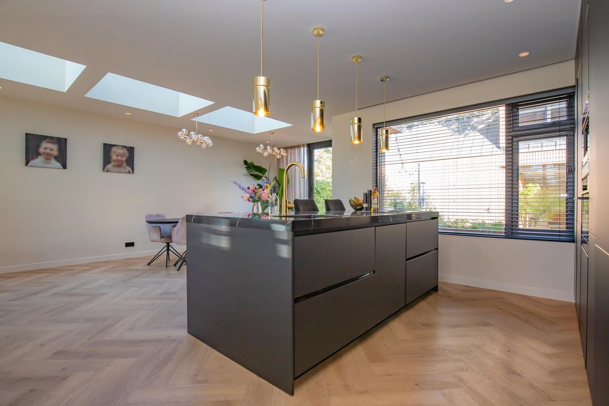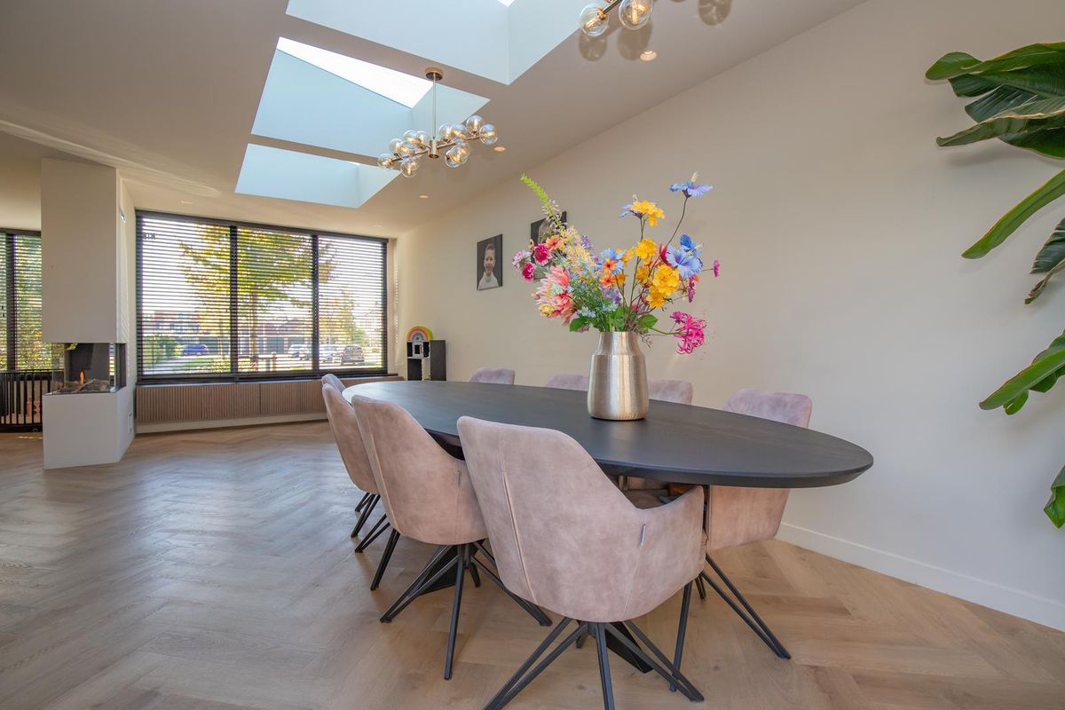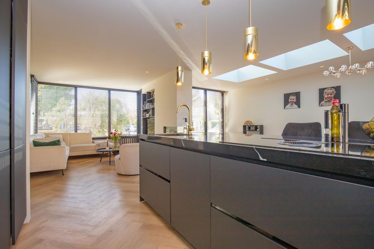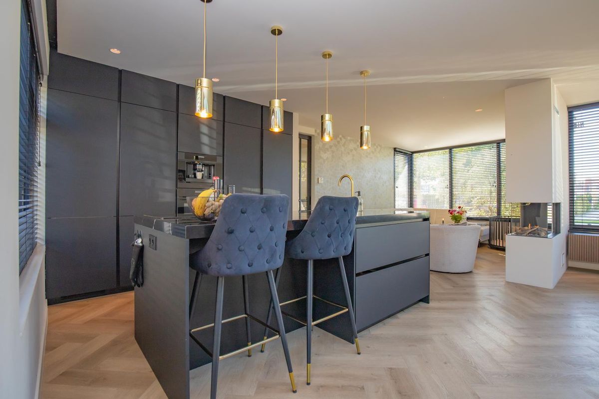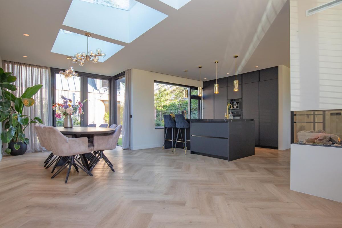 Bij binnenkomst valt direct de hoogwaardige afwerking op. De hal met modern toilet en trapkast leidt naar de gezellige woonkamer, voorzien van vloerverwarming en een luxe visgraat PVC-vloer. De grote erker aan de voorzijde zorgt voor veel lichtinval, terwijl de sfeervolle doorkijk-gashaard een natuurlijke verbinding vormt met de royale eetkamer (maar liefst 24m²!), inclusief maatwerkkasten en een prachtige lichtstraat. De open woonkeuken aan de achterzijde is een ware eyecatcher. Met een stijlvol kook- en spoeleiland, hoogwaardige inbouwapparatuur waaronder: koffiemachine, inductiekookplaat met geïntegreerde afzuiging, een apparatenwand en openslaande deuren naar de tuin is dit dé plek voor gezellige diners en ontspannen kookmomenten.