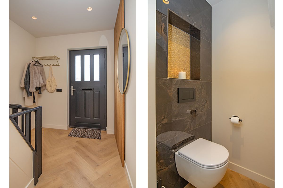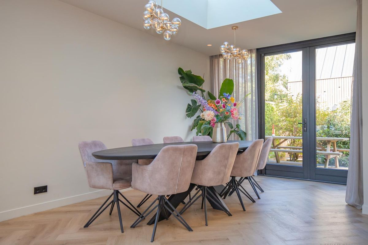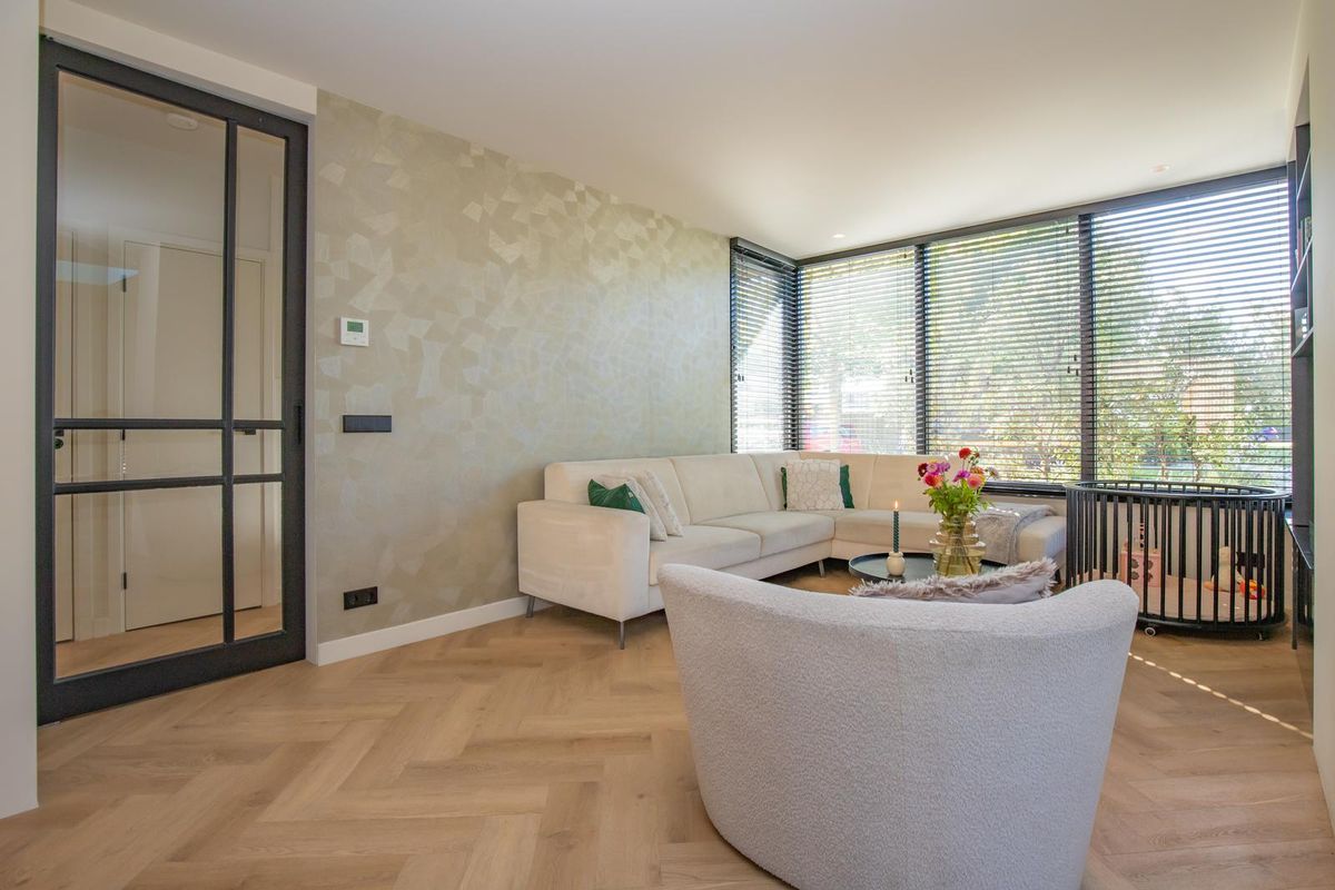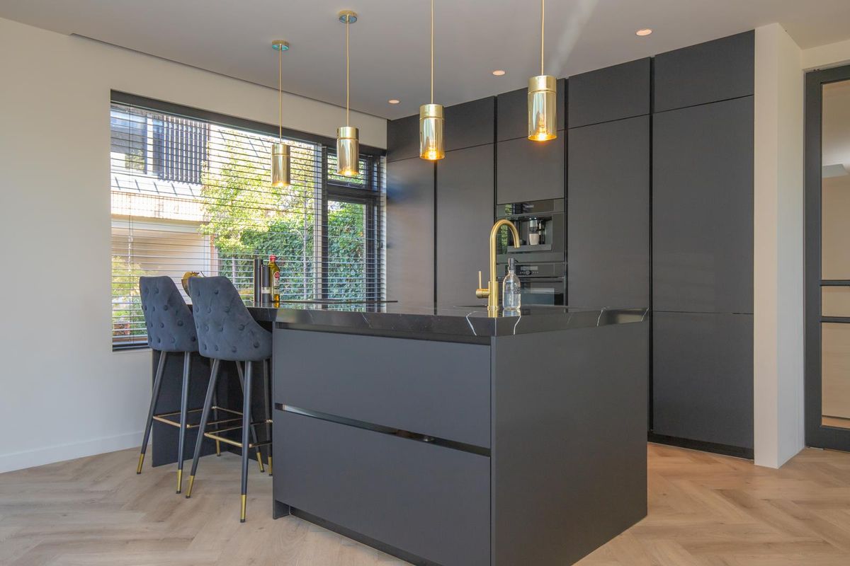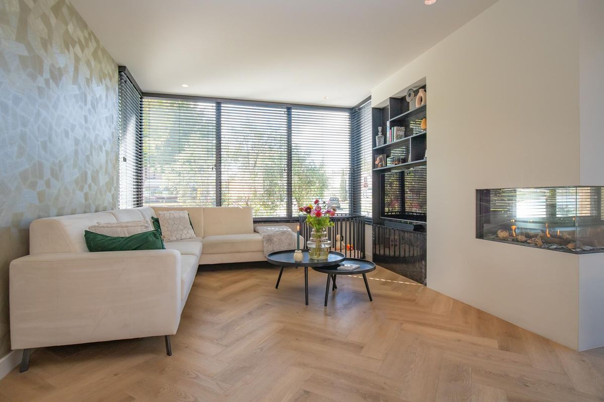 Bij binnenkomst valt direct de hoogwaardige afwerking op. De hal met modern toilet en trapkast leidt naar de gezellige woonkamer, voorzien van vloerverwarming en een luxe visgraat PVC-vloer. De grote erker aan de voorzijde zorgt voor veel lichtinval, terwijl de sfeervolle doorkijk-gashaard een natuurlijke verbinding vormt met de royale eetkamer (maar liefst 24m²!), inclusief maatwerkkasten en een prachtige lichtstraat. De open woonkeuken aan de achterzijde is een ware eyecatcher. Met een stijlvol kook- en spoeleiland, hoogwaardige inbouwapparatuur waaronder: koffiemachine, inductiekookplaat met geïntegreerde afzuiging, een apparatenwand en openslaande deuren naar de tuin is dit dé plek voor gezellige diners en ontspannen kookmomenten.