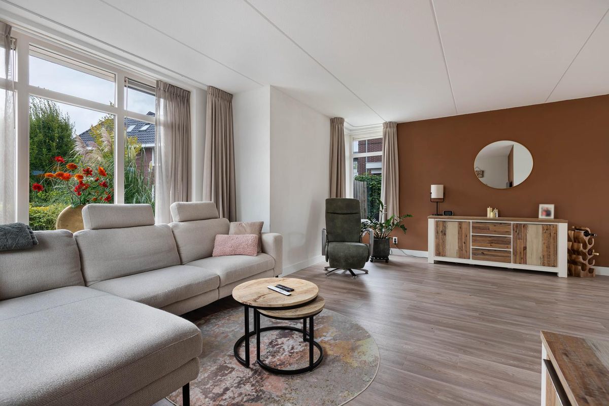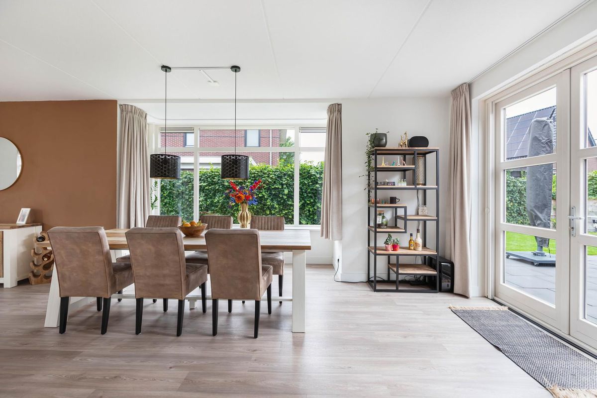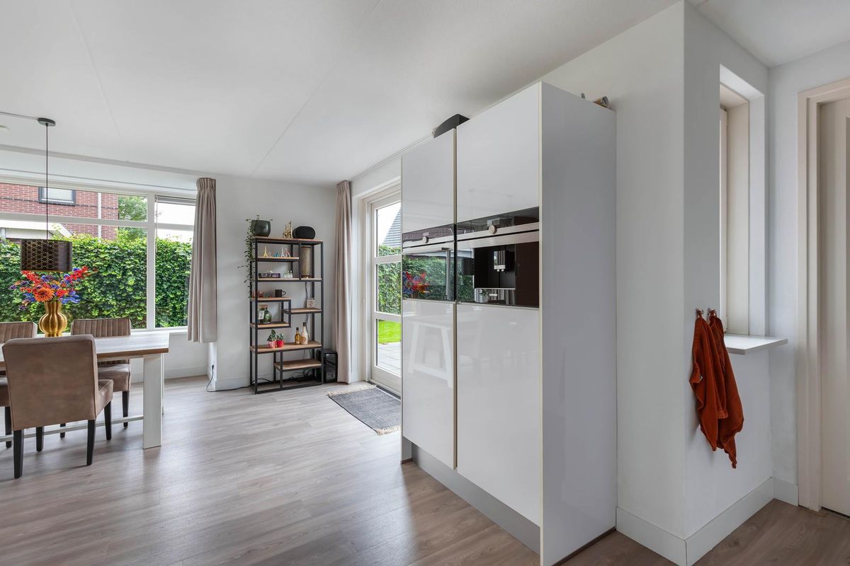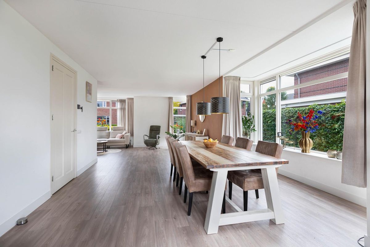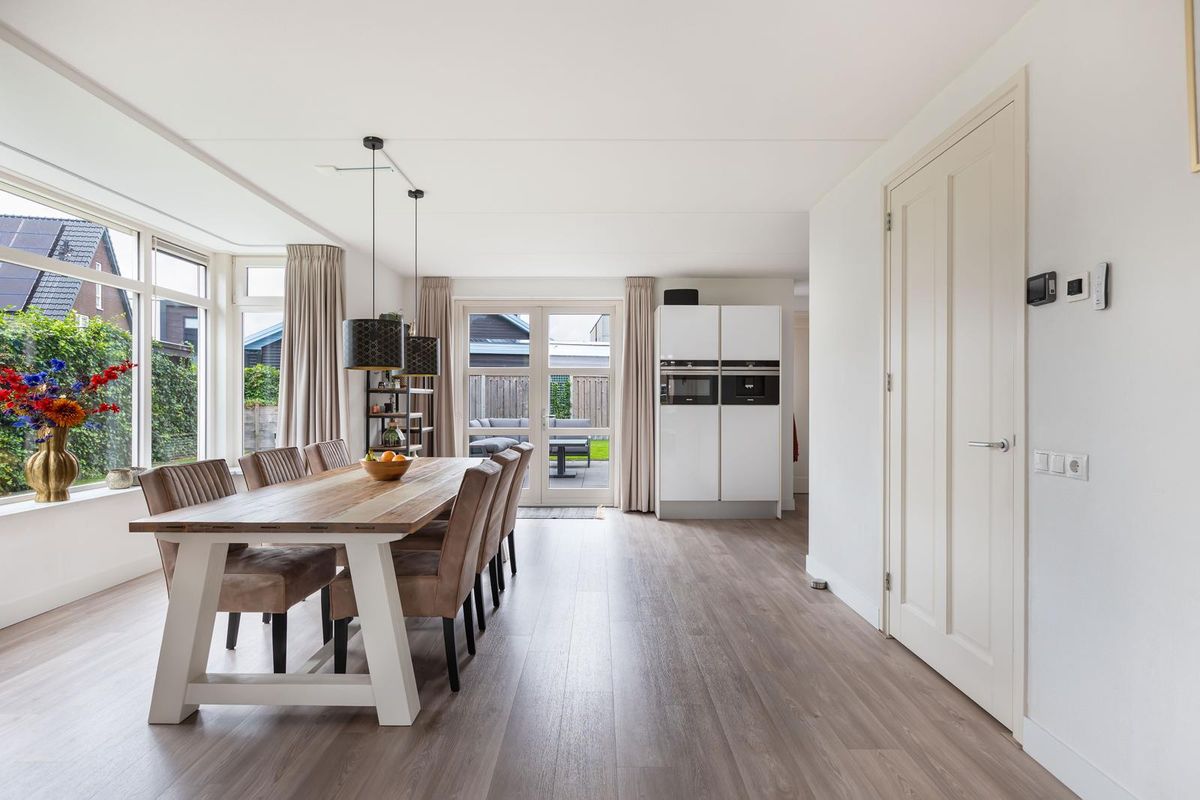Via de overdekte entree kom je binnen in een ruime hal met garderoberuimte en modern toilet. De sfeervolle u-vormige woonkamer is licht en ruim, mede dankzij de twee uitgebouwde erkers en de openslaande deuren naar de tuin. De vloer is in 2024 volledig vernieuwd met een hoogwaardige PVC-vloer inclusief 7-groeps vloerverwarming wat veel comfort biedt.