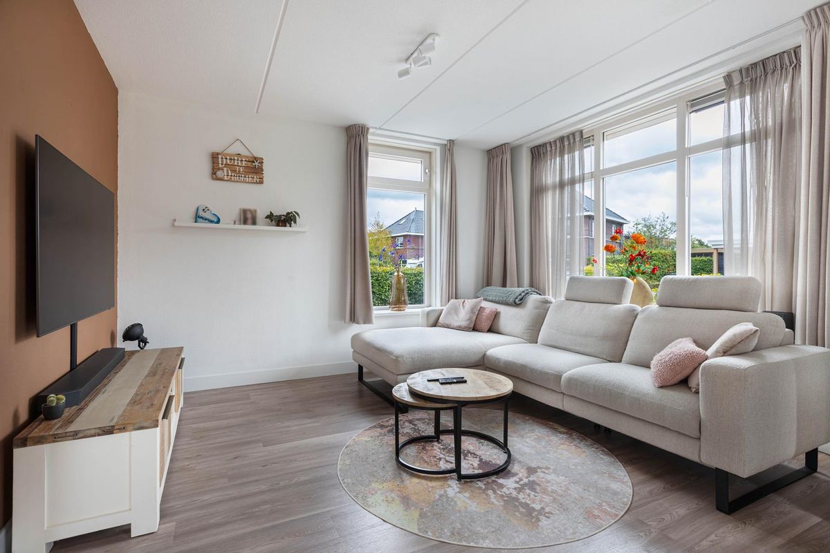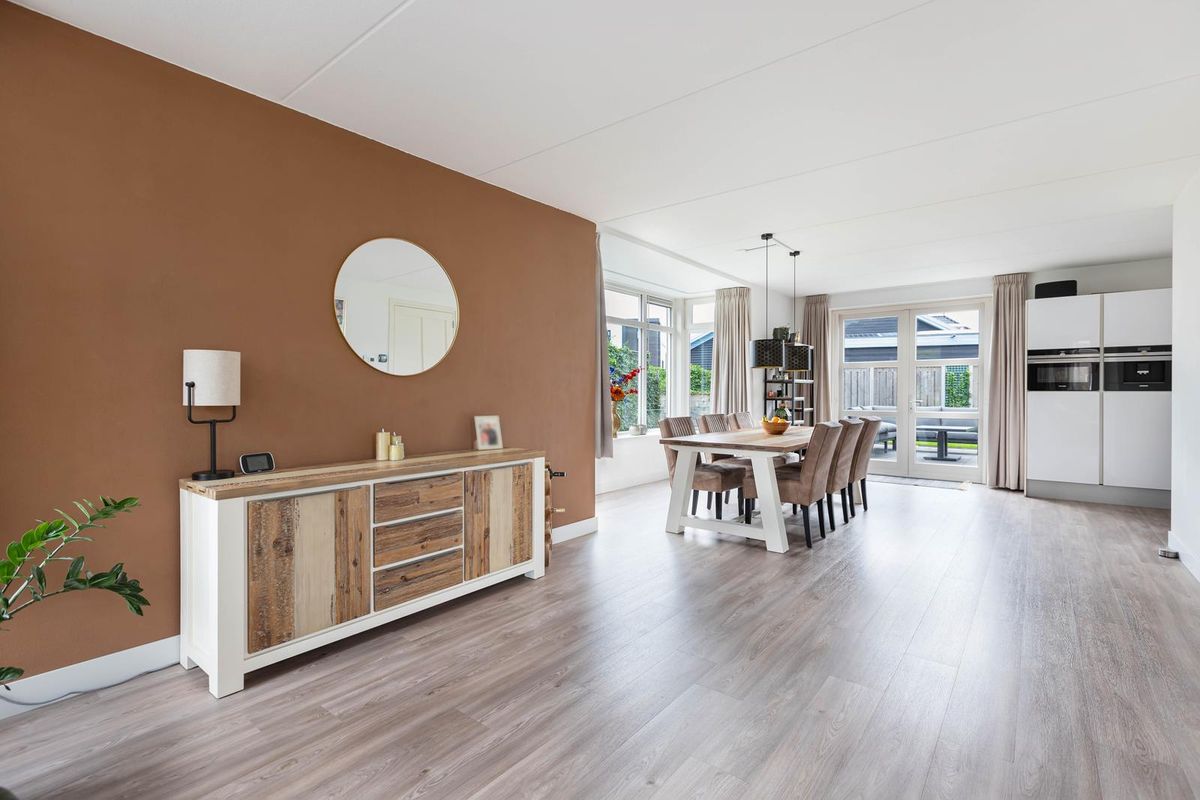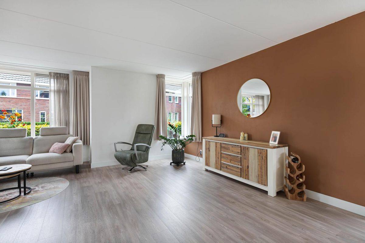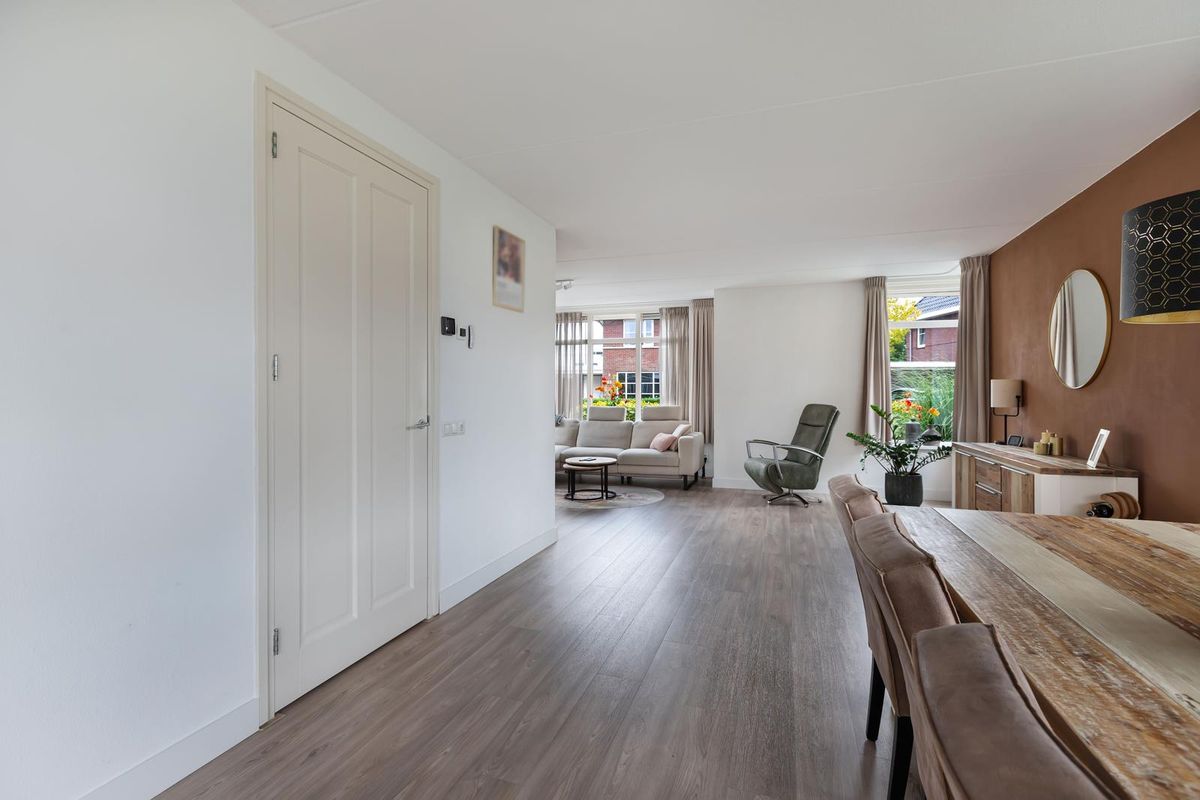 Via de overdekte entree kom je binnen in een ruime hal met garderoberuimte en modern toilet. De sfeervolle u-vormige woonkamer is licht en ruim, mede dankzij de twee uitgebouwde erkers en de openslaande deuren naar de tuin. De vloer is in 2024 volledig vernieuwd met een hoogwaardige PVC-vloer inclusief 7-groeps vloerverwarming wat veel comfort biedt.