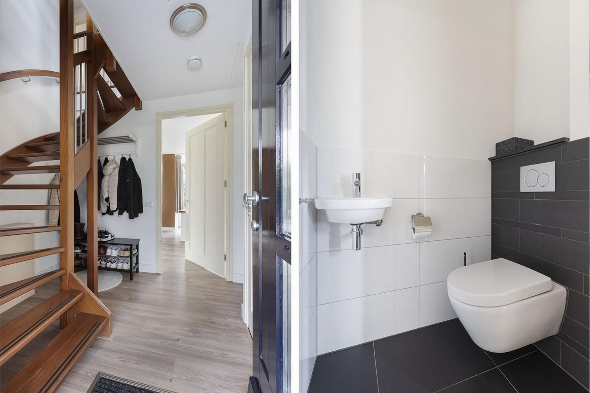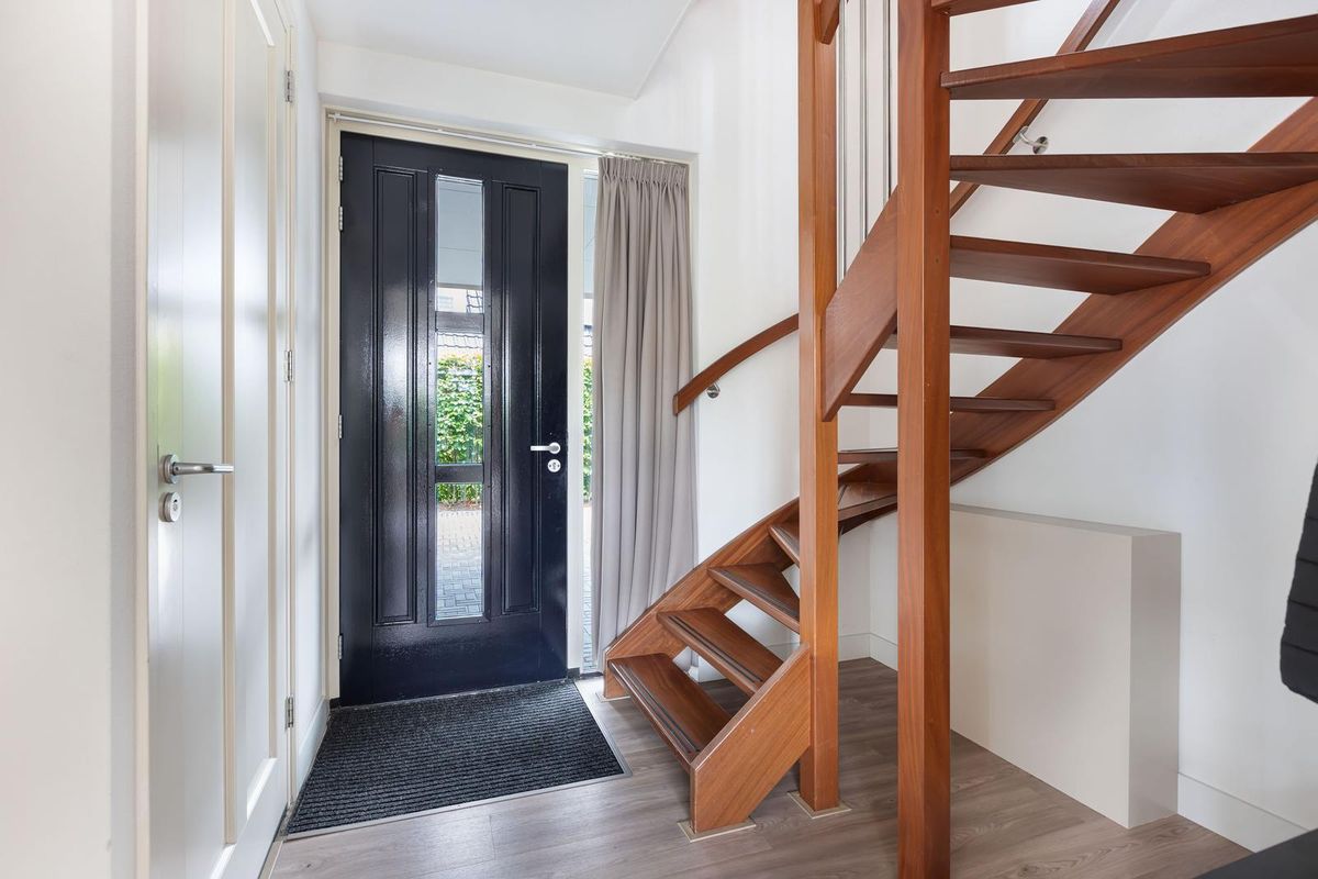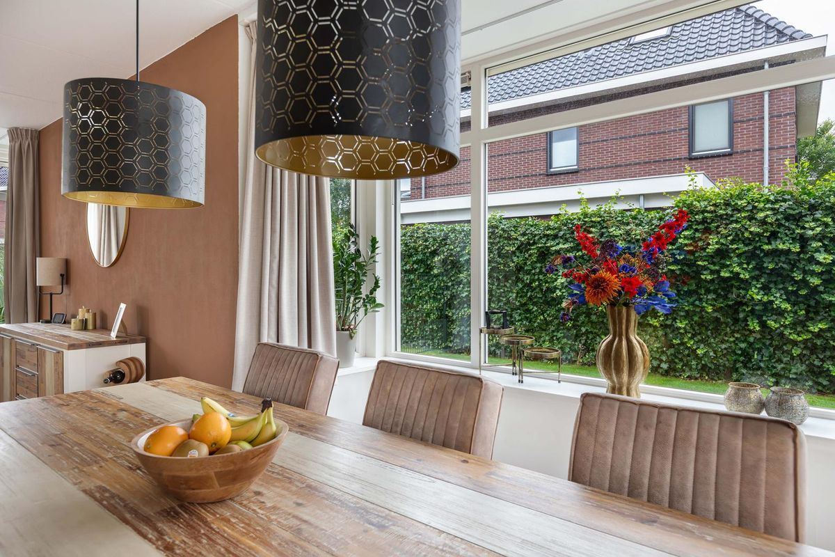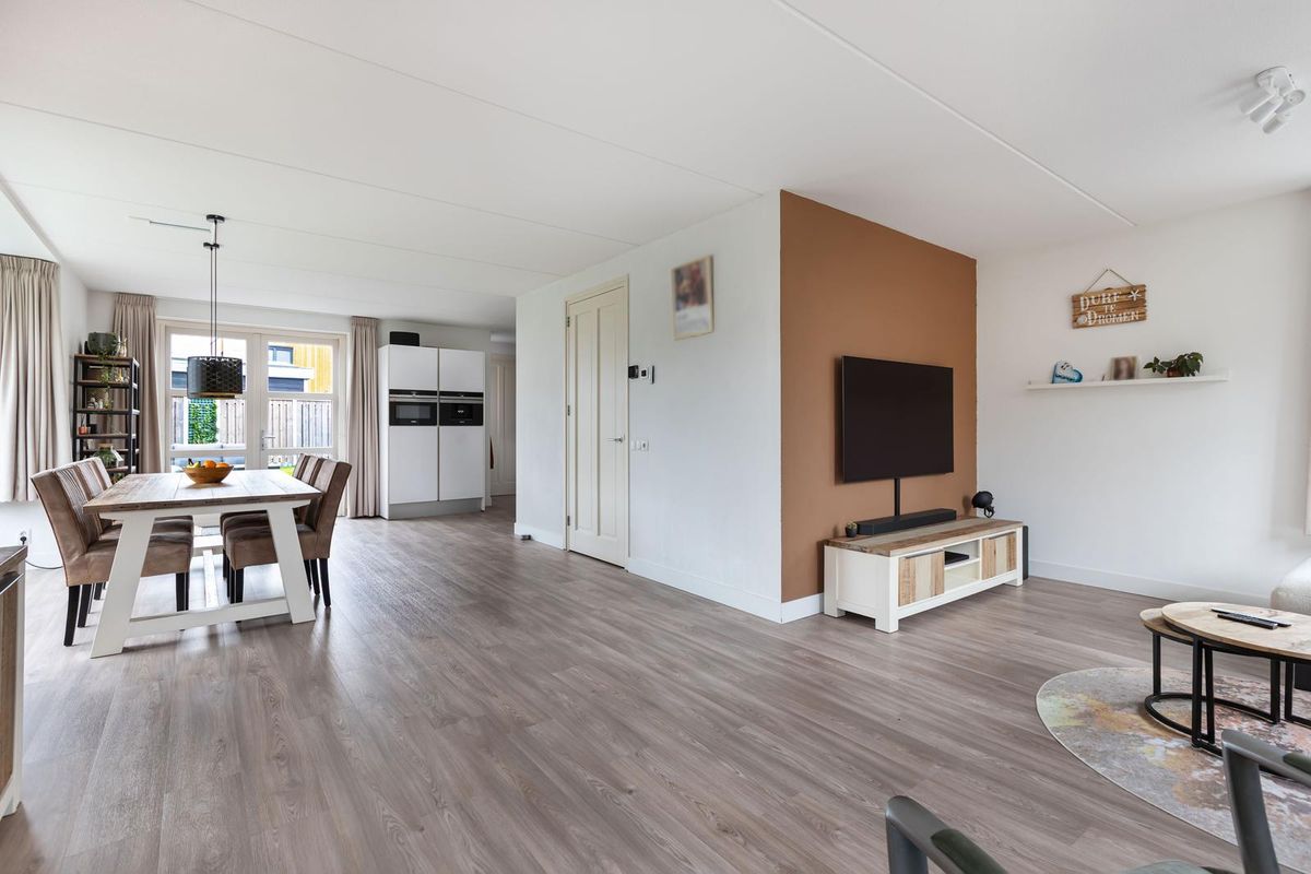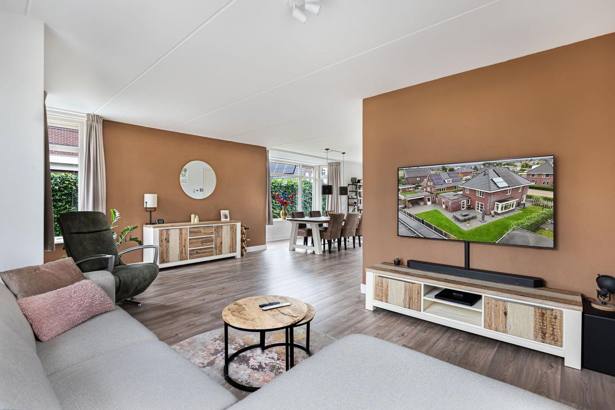 Via de overdekte entree kom je binnen in een ruime hal met garderoberuimte en modern toilet. De sfeervolle u-vormige woonkamer is licht en ruim, mede dankzij de twee uitgebouwde erkers en de openslaande deuren naar de tuin. De vloer is in 2024 volledig vernieuwd met een hoogwaardige PVC-vloer inclusief 7-groeps vloerverwarming wat veel comfort biedt.
