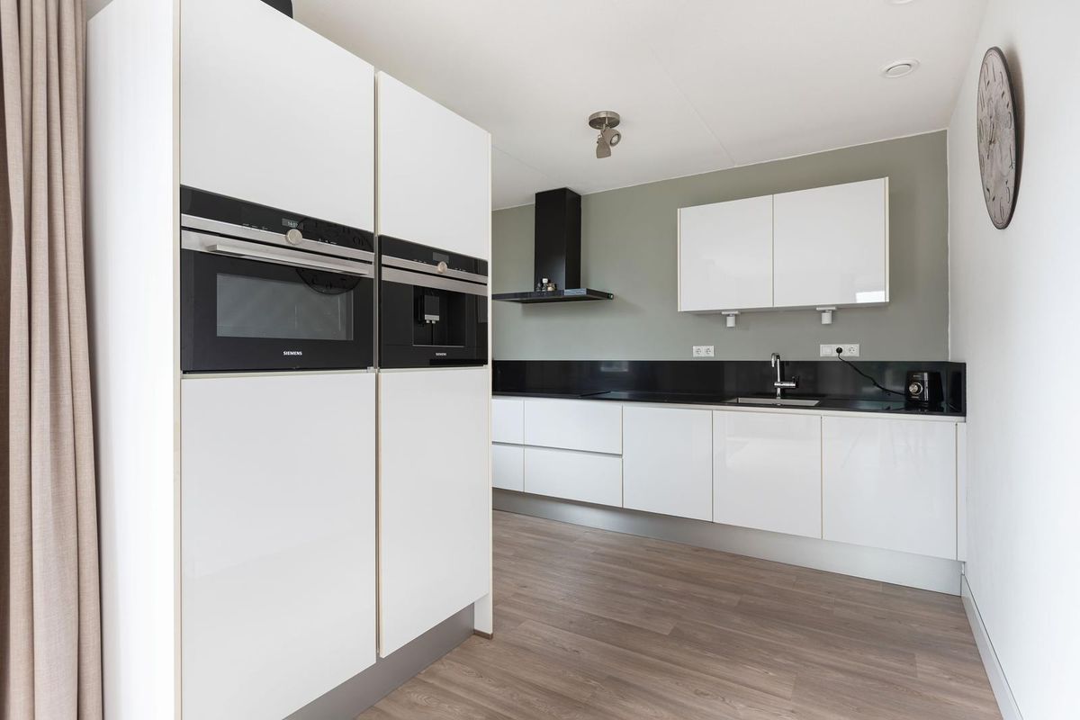 De halfopen keuken heeft een moderne uitstraling met hoogglans witte, greep loze kasten, een natuurstenen werkblad en luxe inbouwapparatuur, waaronder een 5-pits inductiekookplaat (2022), afzuigkap met Ledverlichting, koelkast, vriezer, oven, vaatwasser en ingebouwd koffiezetapparaat. Via de keuken bereik je de geïsoleerde bijkeuken waar ruimte is voor witgoed en de aangebouwde stenen garage.