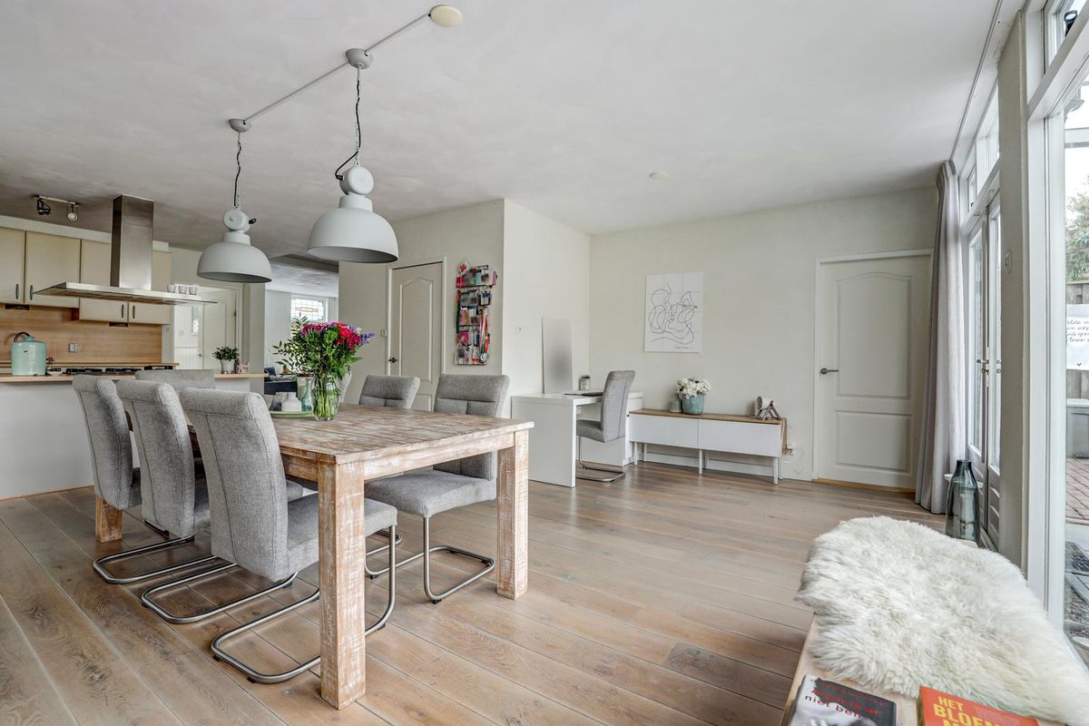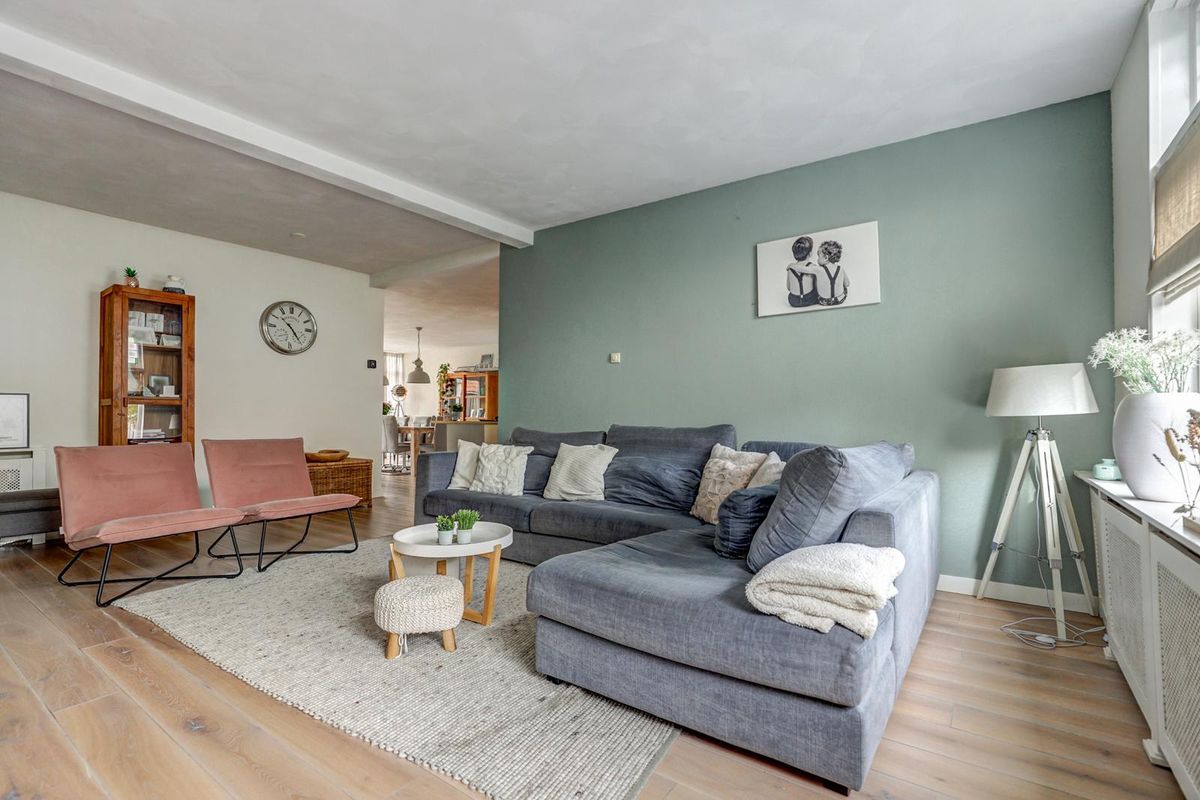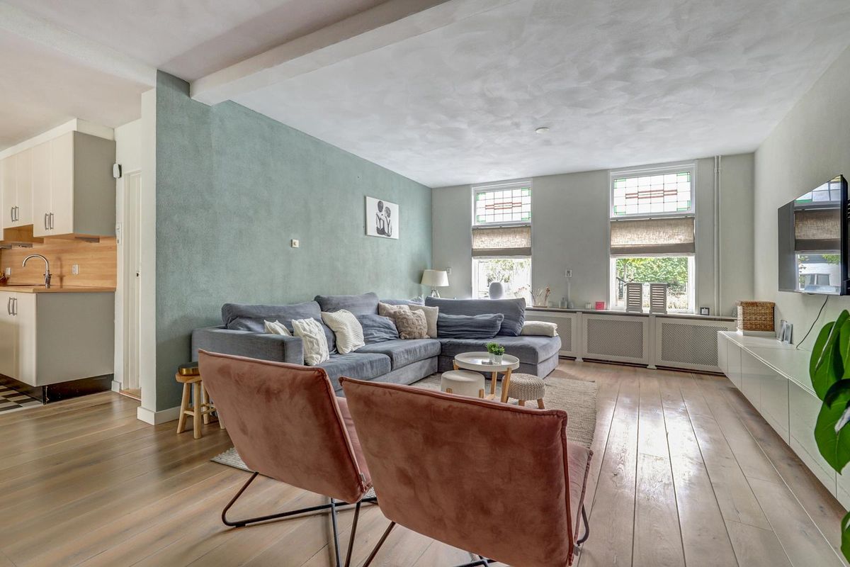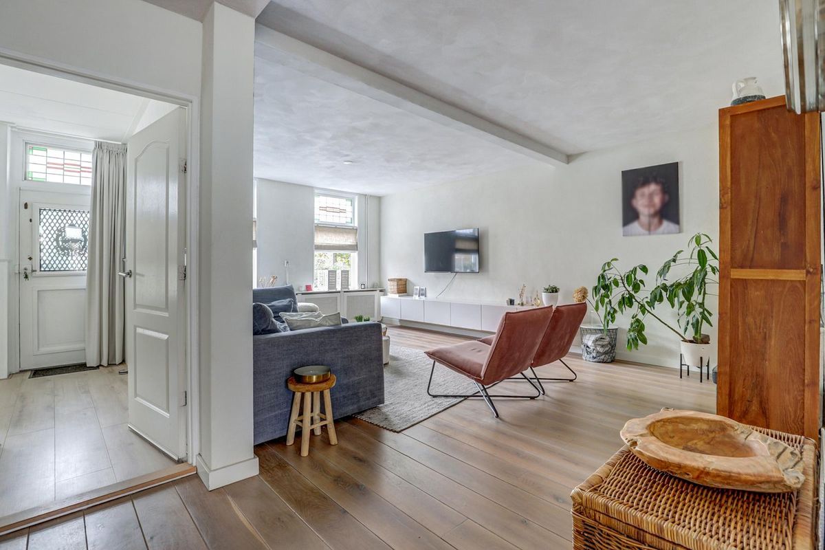 Via de verzorgde voortuin bereikt u de entree. De hal biedt toegang tot het toilet, de trapopgang en de ruime woonkamer. De woonkamer is licht en sfeervol dankzij de grote raampartijen met glas-in-looddetails en de warme houten vloer. Er is volop ruimte voor een gezellige zithoek en een grote eettafel, perfect voor lange avonden met familie en vrienden.