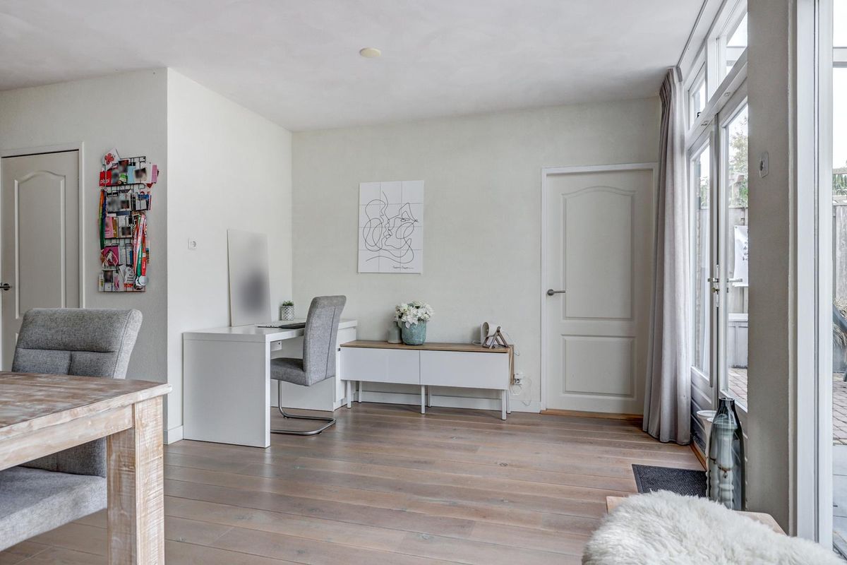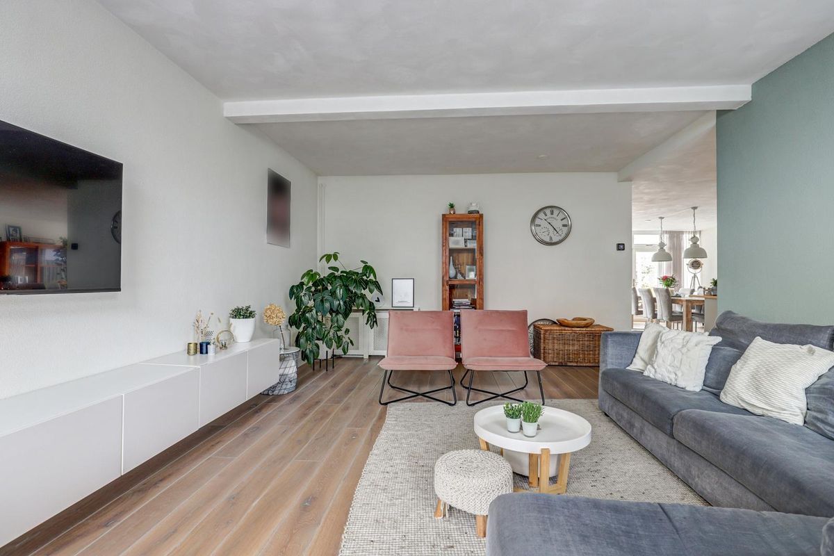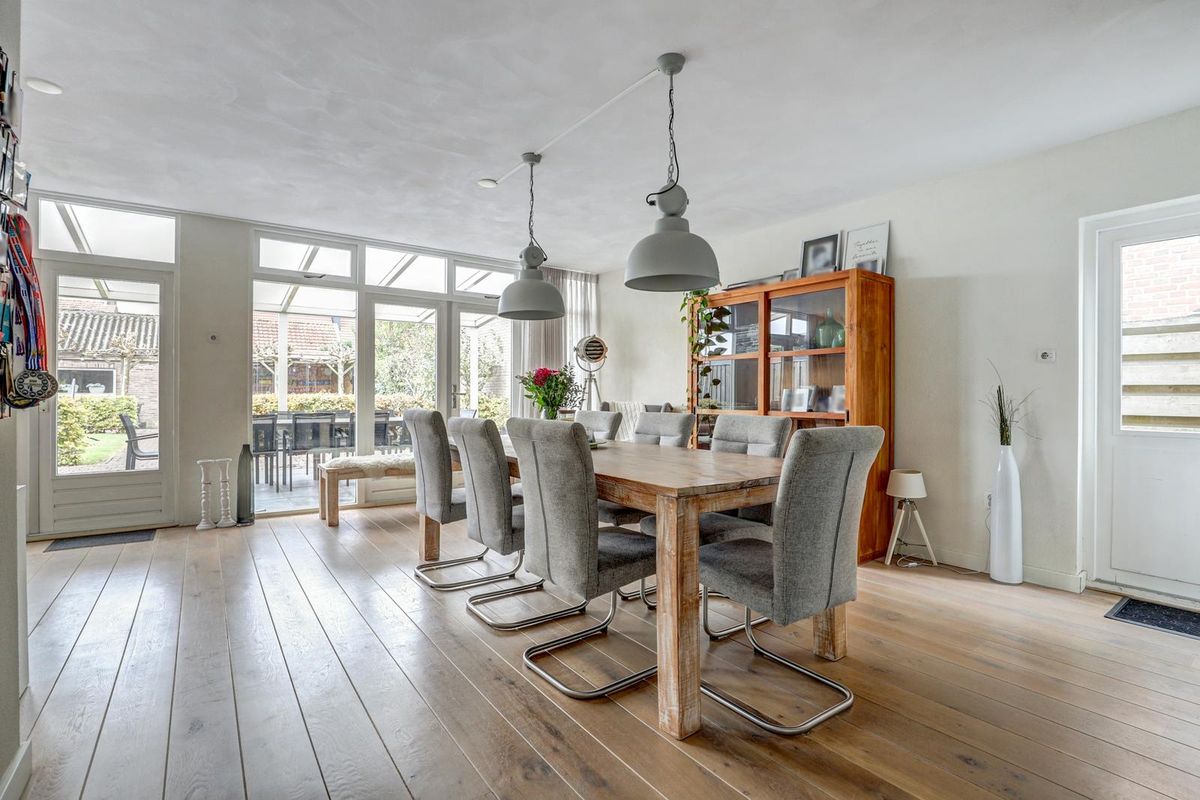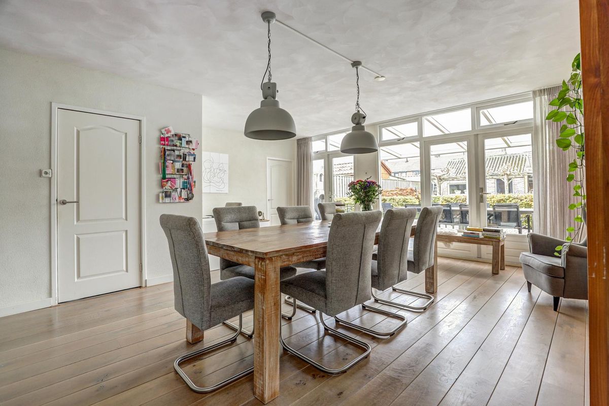 Via de verzorgde voortuin bereikt u de entree. De hal biedt toegang tot het toilet, de trapopgang en de ruime woonkamer. De woonkamer is licht en sfeervol dankzij de grote raampartijen met glas-in-looddetails en de warme houten vloer. Er is volop ruimte voor een gezellige zithoek en een grote eettafel, perfect voor lange avonden met familie en vrienden.