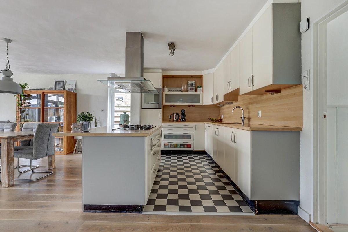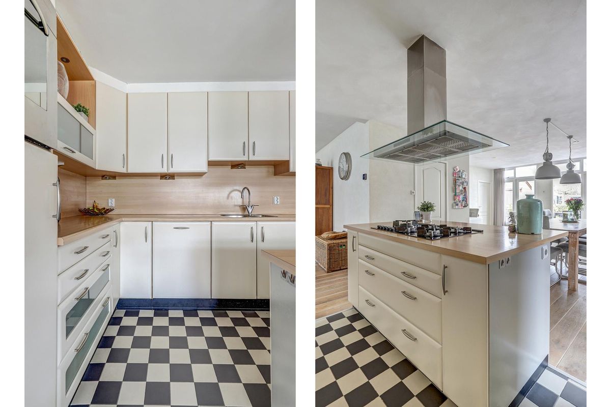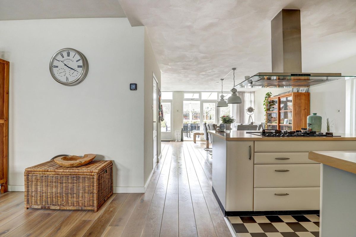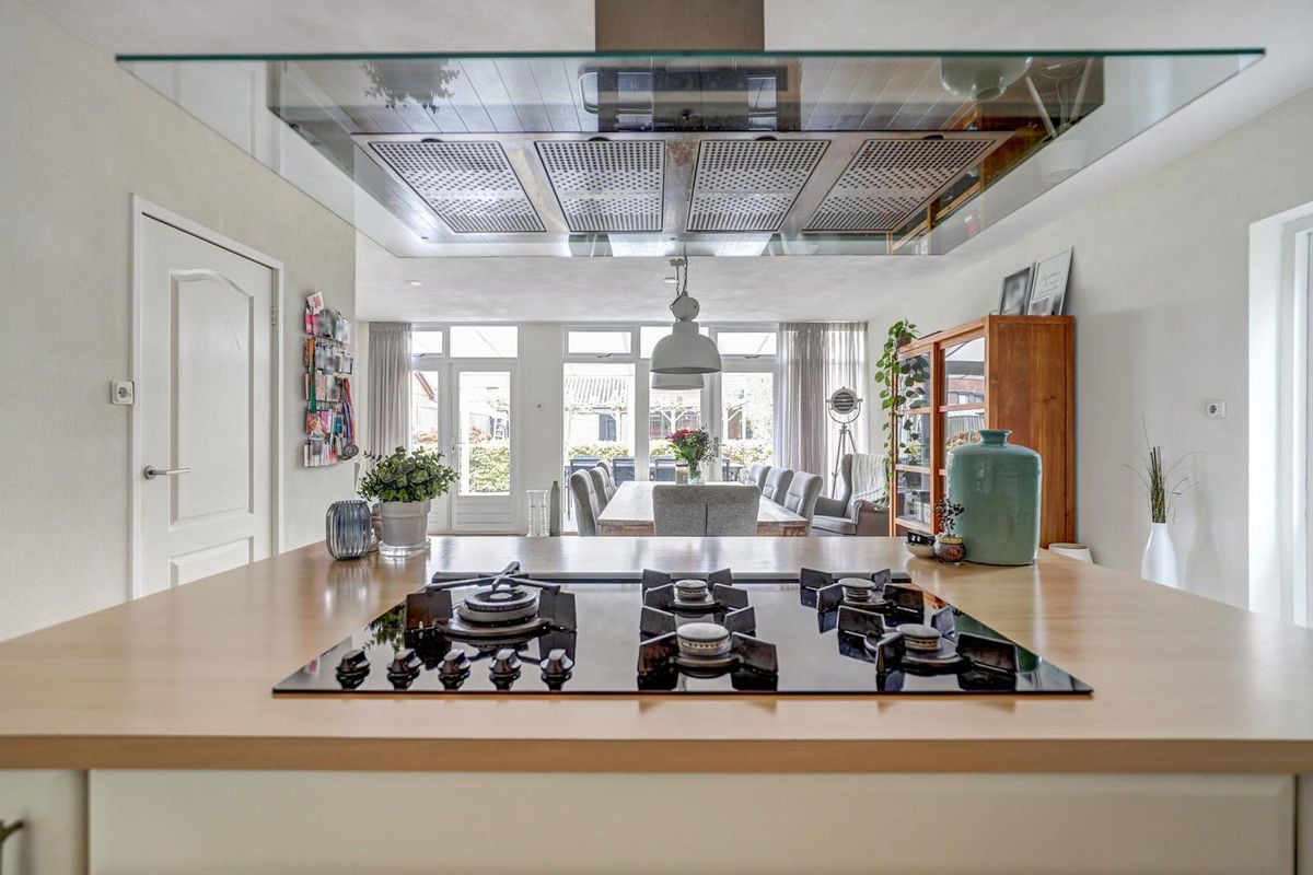 De open keuken vormt het hart van het huis. De lichte kleurstelling in combinatie met het houten werkblad en de stijlvolle vloer zorgen voor een tijdloze uitstraling. Het kookeiland met afzuigkap maakt het geheel compleet. Ideaal voor wie graag kookt en tegelijkertijd in contact blijft met gezelschap. De keuken is voorzien van diverse inbouwapparatuur, waaronder