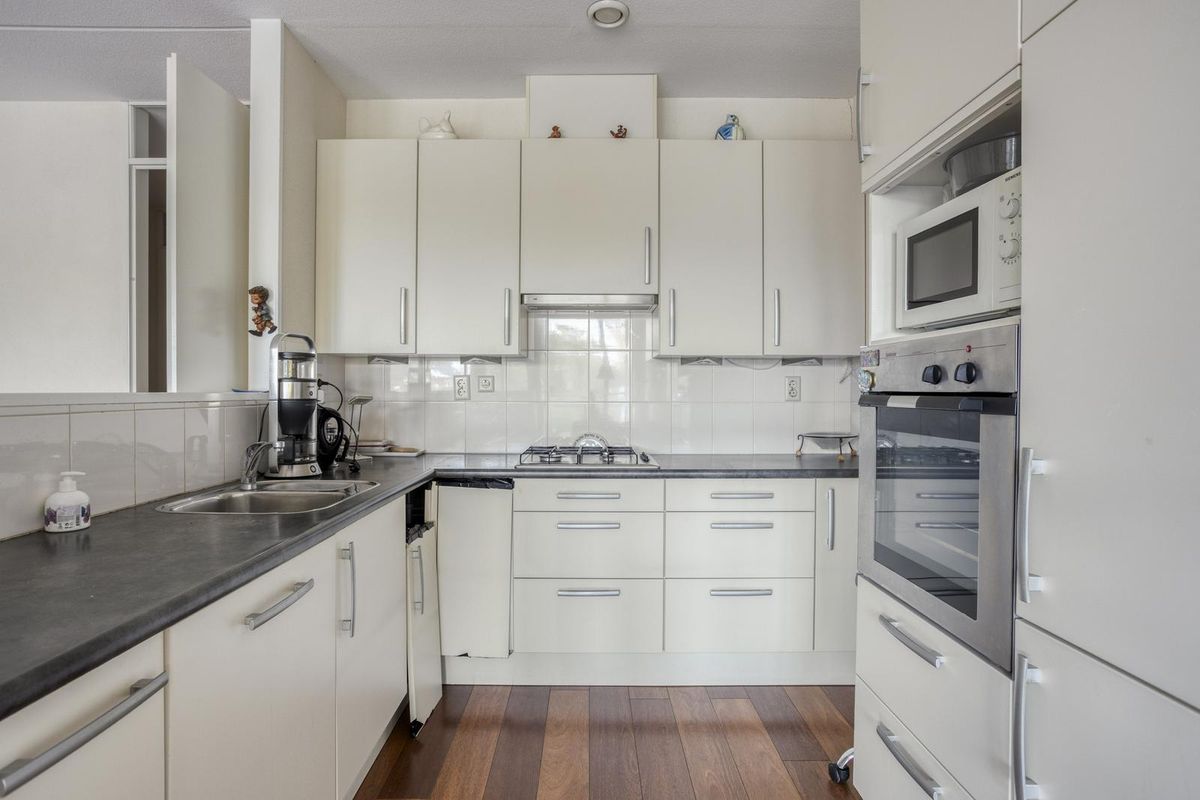 De keuken is praktisch ingedeeld en voorzien van inbouwapparatuur zoals gasfornuis, combi oven, afzuigkap, dubbele spoelbak, koel-/vriescombinatie en vaatwasser.