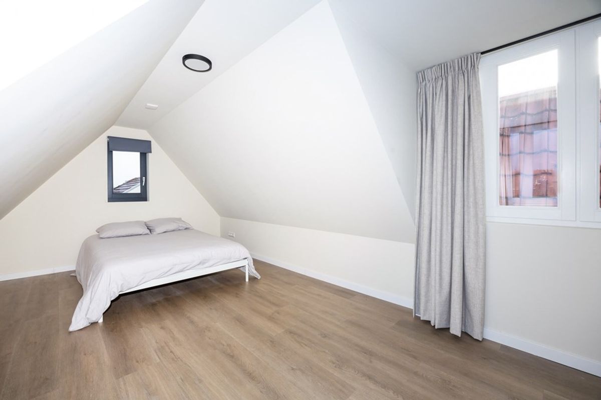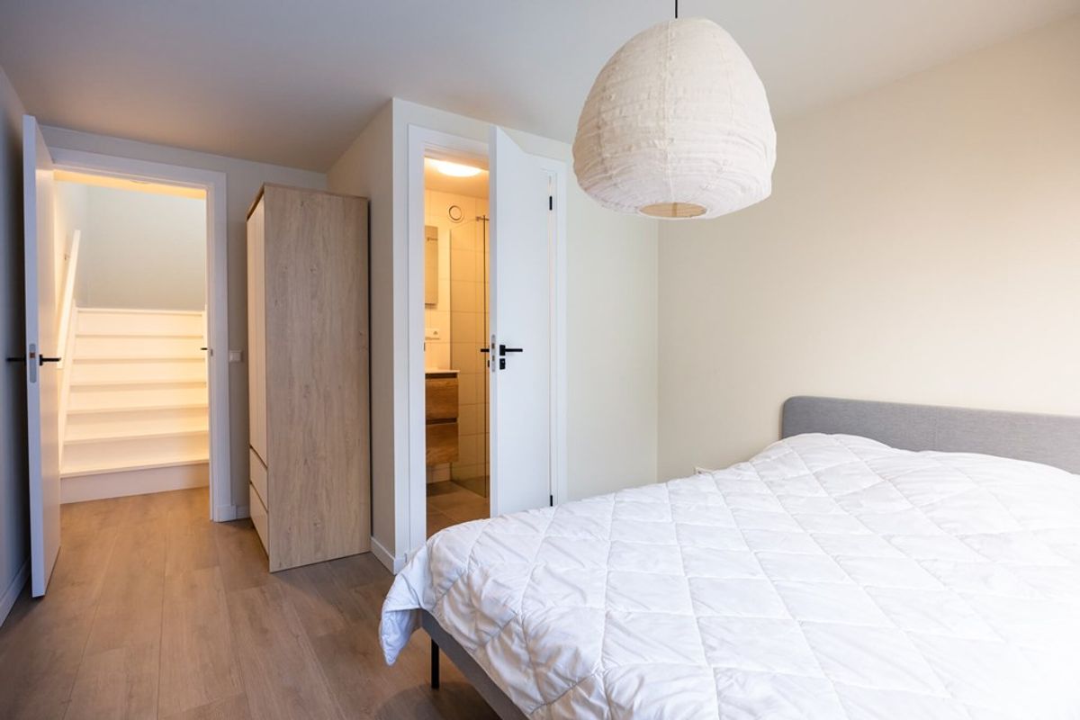 2e Slaapkamer - voor deze slaapkamer loop je een paar treden naar “beneden” naar een ruime slaapkamer met recht opgetrokken wanden en-suite badkamer. Ook deze kamer heeft een pvc-vloer met vloerverwarming en HR++ glas in de raampartij.