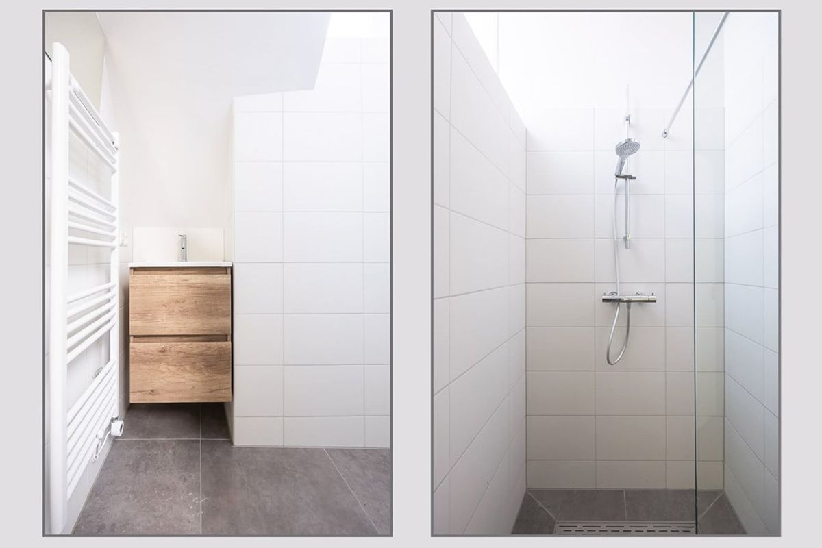 Beide badkamers hebben modern betegelde wanden en dito vloer, wastafelmeubel en 2 laden, spiegel met verlichting, een inloopdouche met thermostaatkraan en drainafvoer, een elektrische sierradiator en een stopcontact voor bijvoorbeeld het opladen van de elektrische tandenborstel.