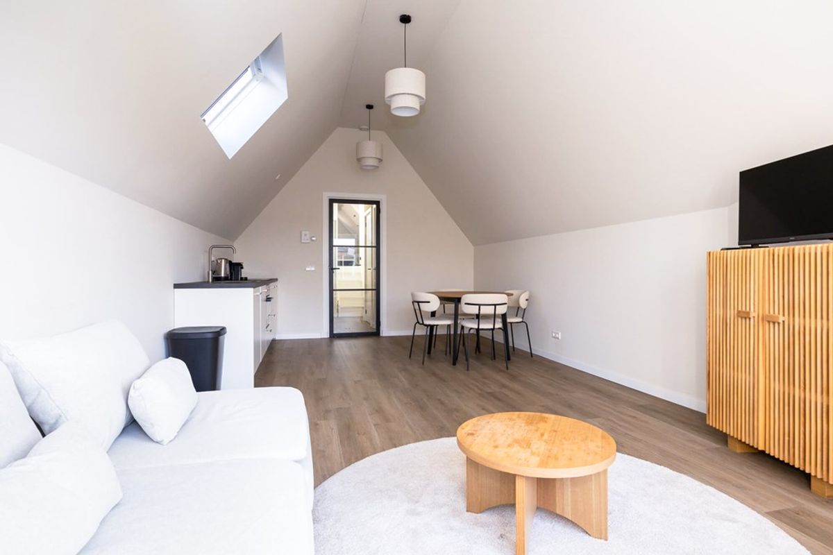 Ruime living met licht schuine wanden en hoog plafond onder het geïsoleerde dak en draai/kiepramen met zicht op de Grote Noord. Een dakraam geeft extra lichtinval en mogelijkheid om te ventileren. Op de vloer ligt pvc met vloerverwarming wat als hoofdverwarming in het gehele appartement is gelegd.