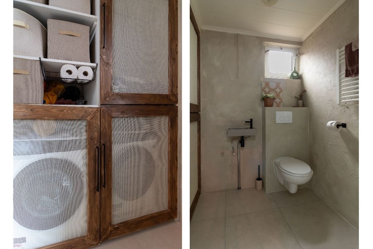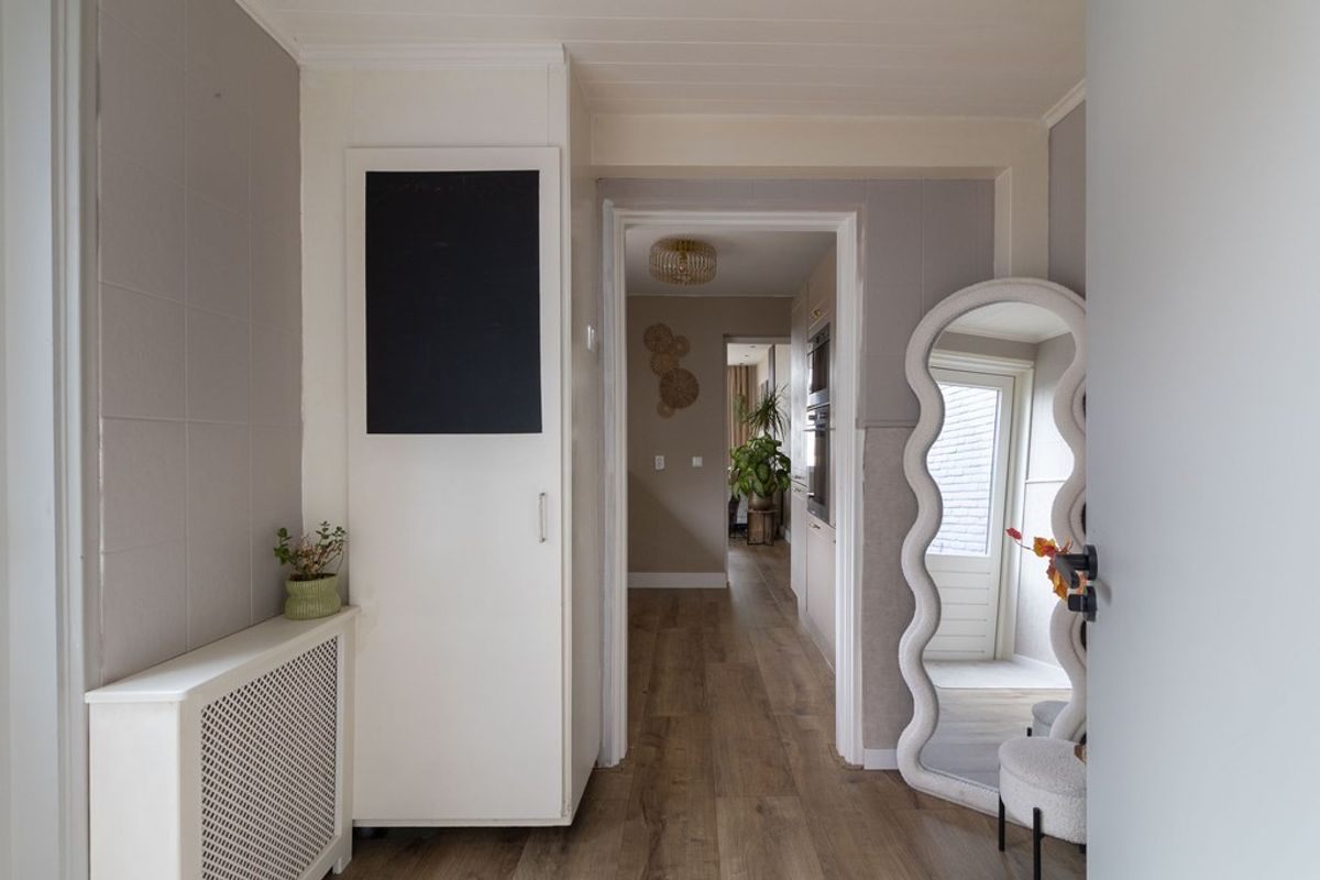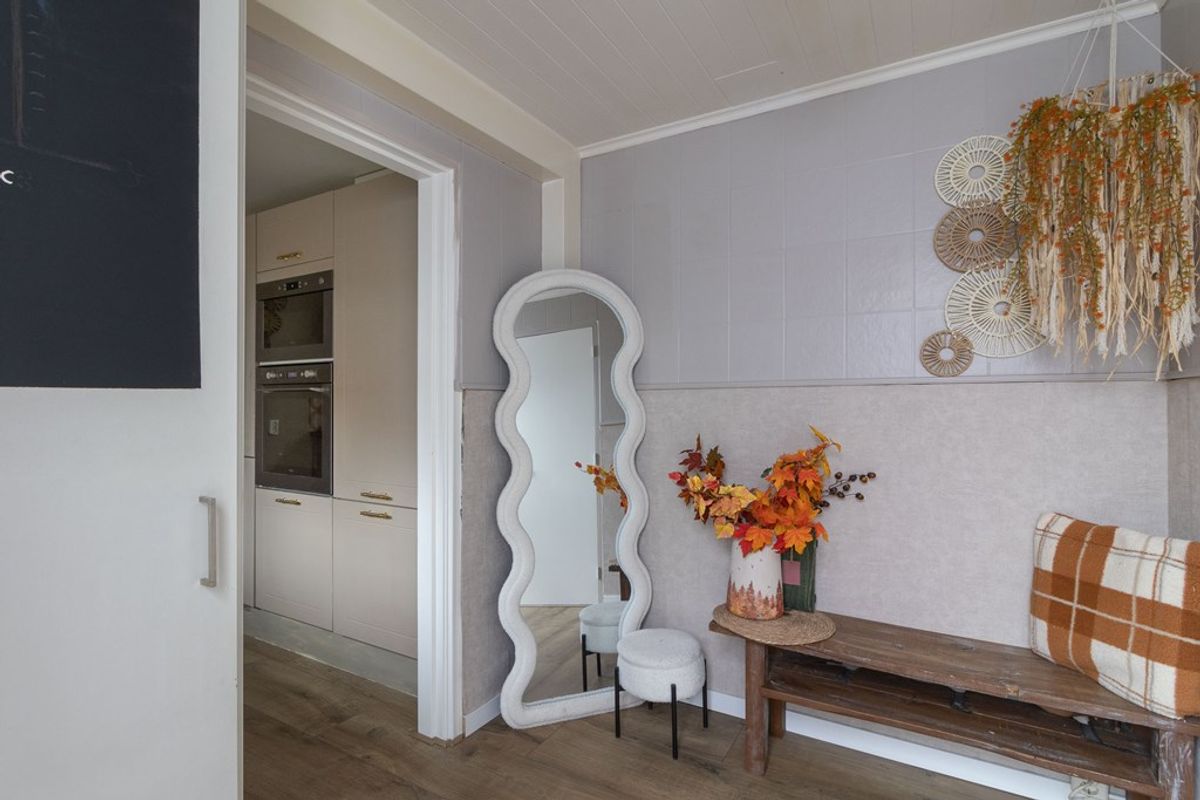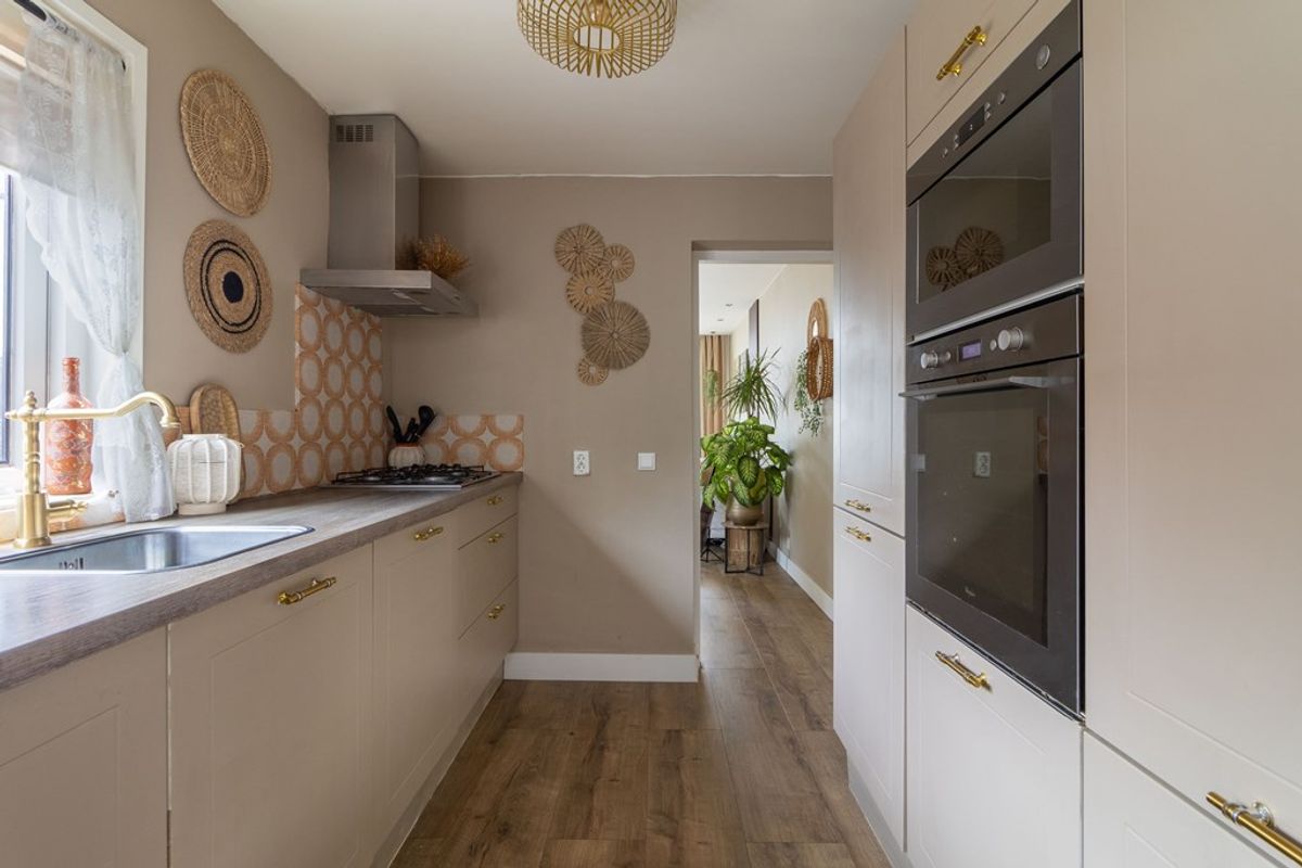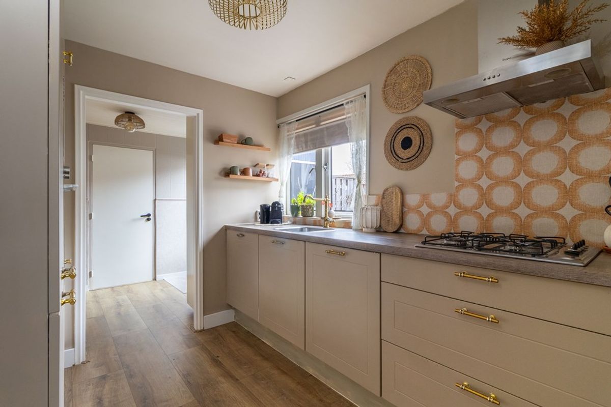 Aansluitend aan de woonkamer bevindt zich de keuken, praktisch opgesteld en direct verbonden met de leefruimte. Vanuit de keuken is de achtergelegen hal bereikbaar, waar zich het toilet bevindt. In de vaste kast bij het toilet zijn de aansluitingen voor wasmachine en droger geplaatst, netjes uit het zicht maar praktisch in gebruik.