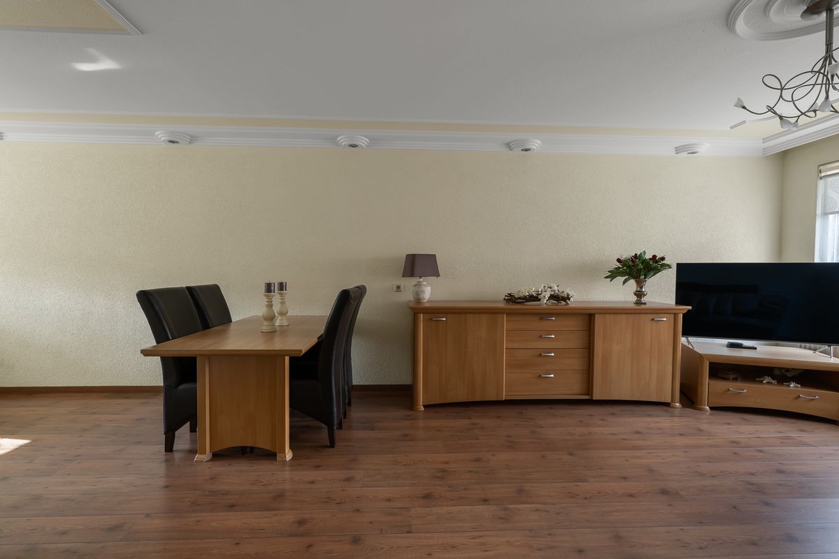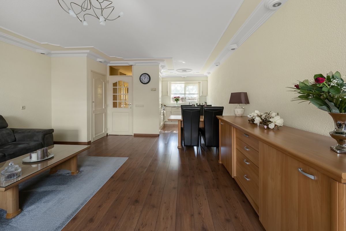 De tuingerichte woonkamer heeft een laminaatvloer met een groot raam en een deur aan de zonnige noordwestkant. Onder de trap is een handige bergkast De open keuken staat in hoekopstelling aan de straatkant is rond 2005 geplaatst, met een graniet kleurig aanrechtblad en diverse inbouwapparatuur: een inductiekookplaat, afzuigkap, oven, koelkast met vriezer en een vaatwasser.