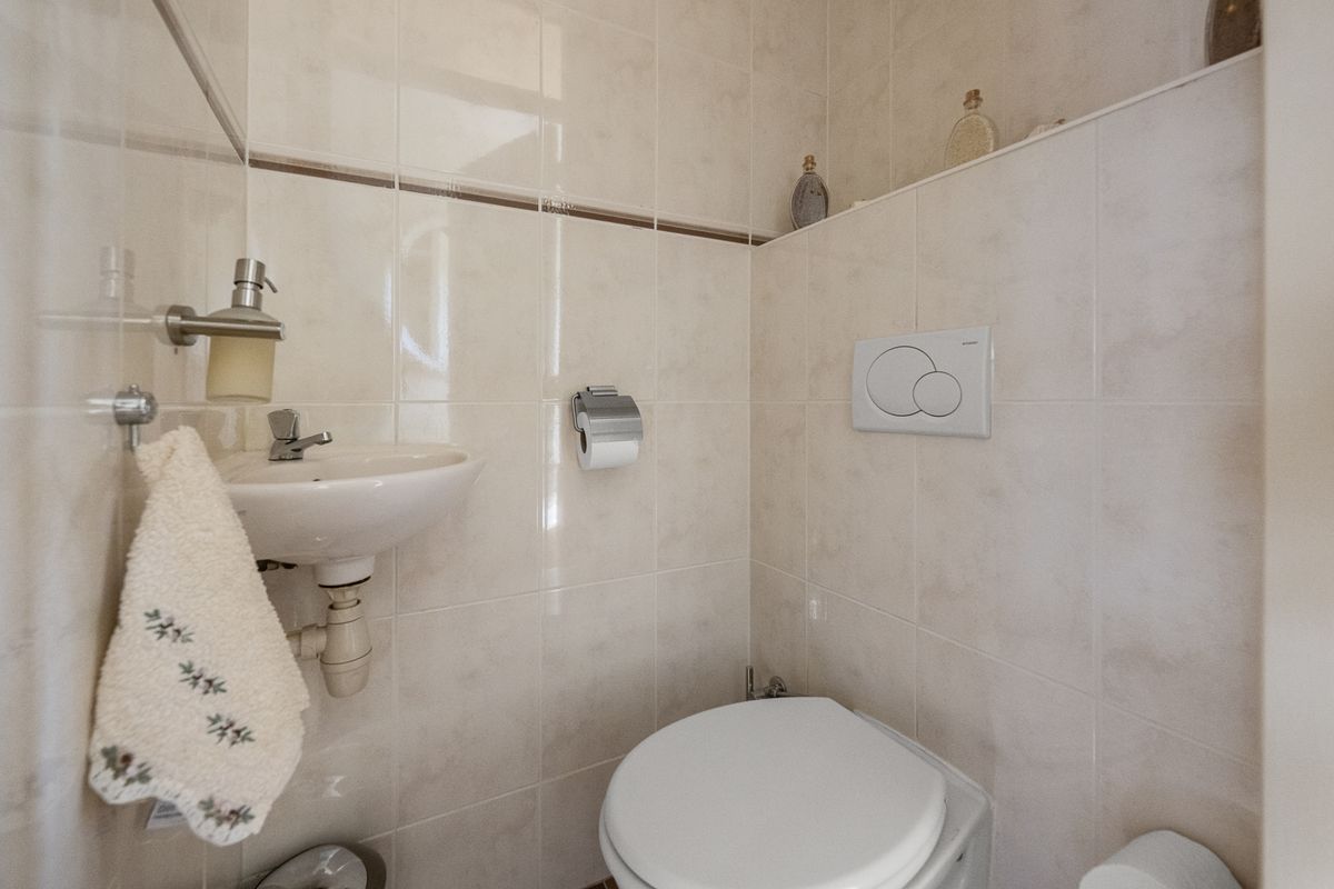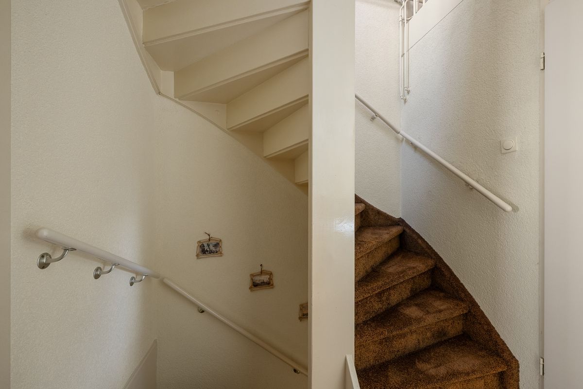 Via de voortuin naar de voordeur loop je de hal in, met een lichte plavuizen vloer en stucwerk op de lange muur. Aan de rechterzijde zijn de meterkast, de toiletruimte met fonteintje en de trap naar de eerste verdieping.