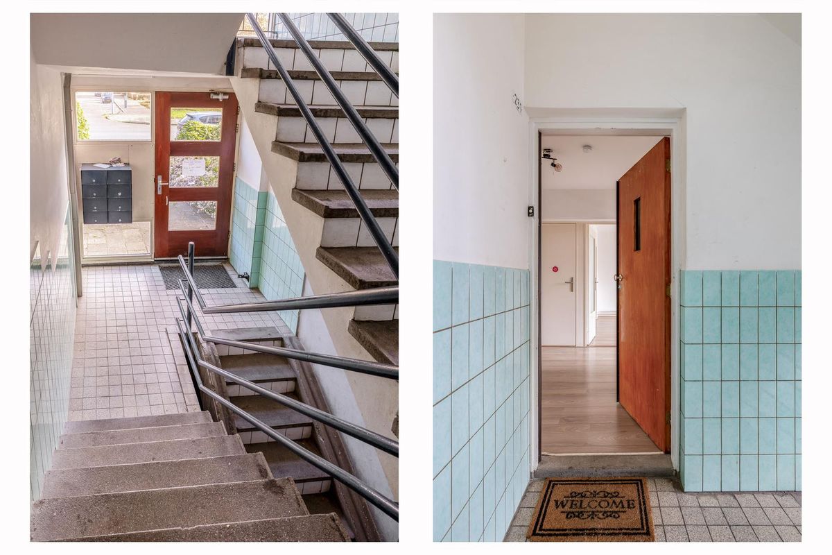 Begane grond: entree met de brievenbussen, toegang tot de berging en het trappenhuis naar de verdiepingen.