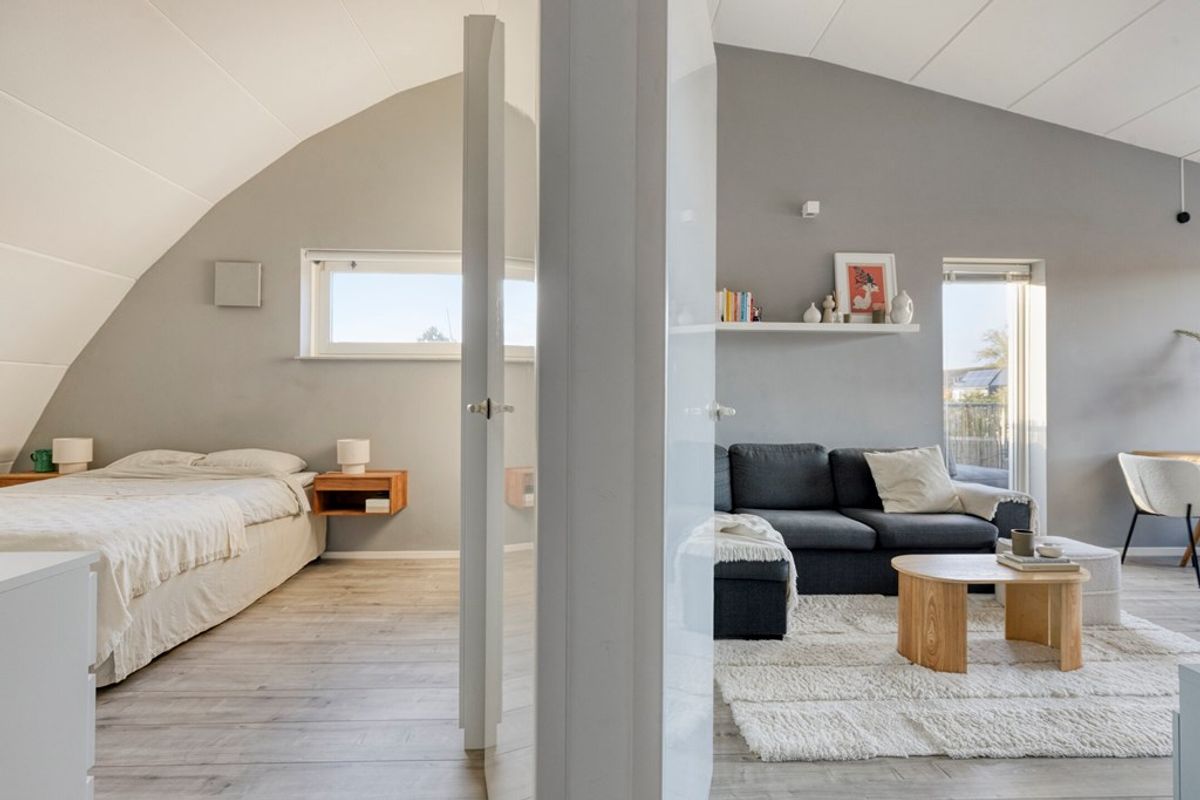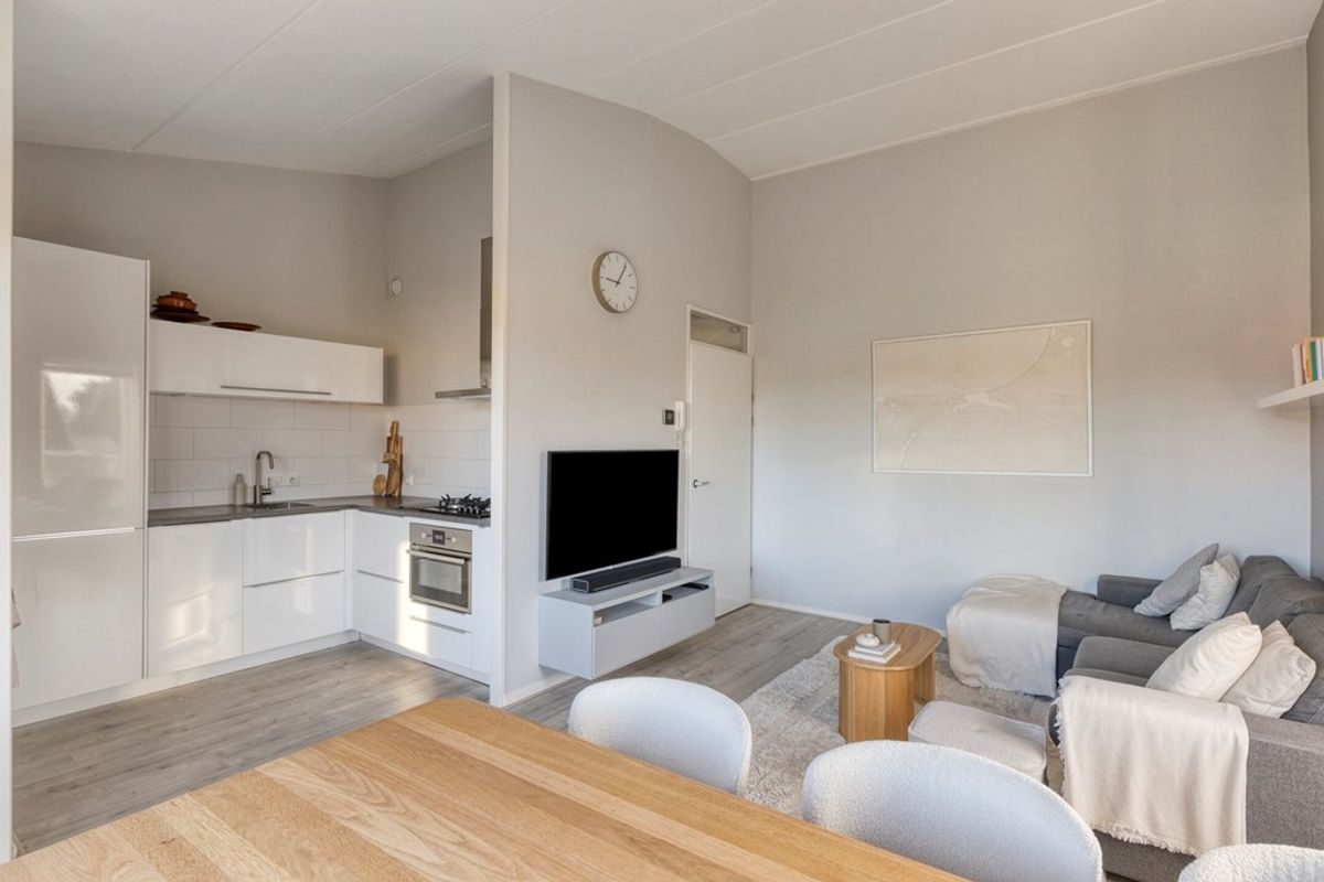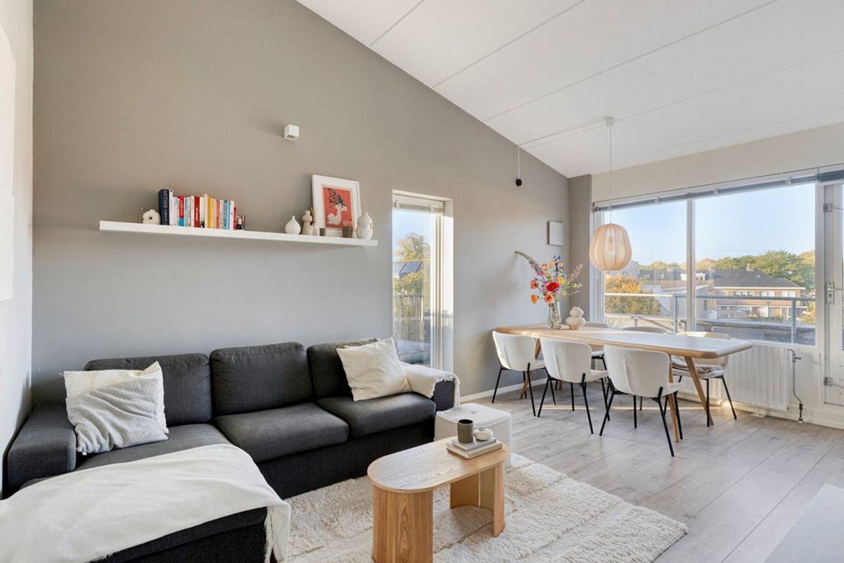 Bij binnenkomst in het appartement valt meteen de aangename lichtinval op. De woonkamer strekt zich uit over de volle breedte en heeft een eigentijdse uitstraling met strakke wanden, een lichte laminaatvloer en de toegang tot het balkon. Dankzij de grote raampartijen baadt de ruimte in daglicht, waardoor het interieur uitnodigend en warm aanvoelt.