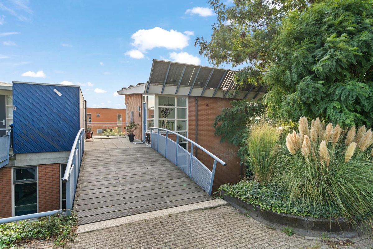 Het speelse effect van de Nieuwlandsedreef 175 ervaar je al voor de voordeur! Zo is de woning toegankelijk via een brug, waar ook ruimte is voor het parkeren van de auto. Je stapt de woning binnen in de hal op de tweede verdieping van de woning.