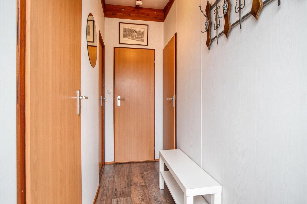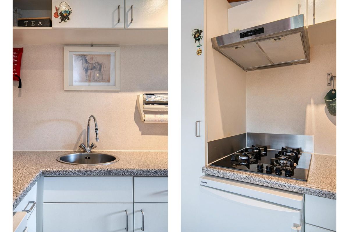 Bij binnenkomst via de hal word je verwelkomd in de lichte en sfeervolle woonkamer met gezellige gashaard en openslaande deuren naar de veranda en de zonnige tuin. De open woonkeuken is voorzien van diverse inbouwapparatuur en een airco, en biedt voldoende ruimte voor een gezellige eethoek. De woning beschikt over twee slaapkamers, geschikt voor vier personen. De badkamer is netjes afgewerkt en voorzien van een douche, toilet en wastafelmeubel.