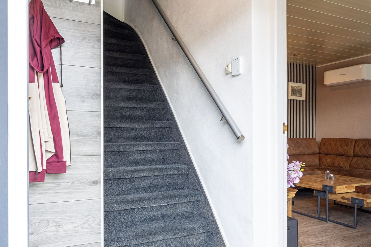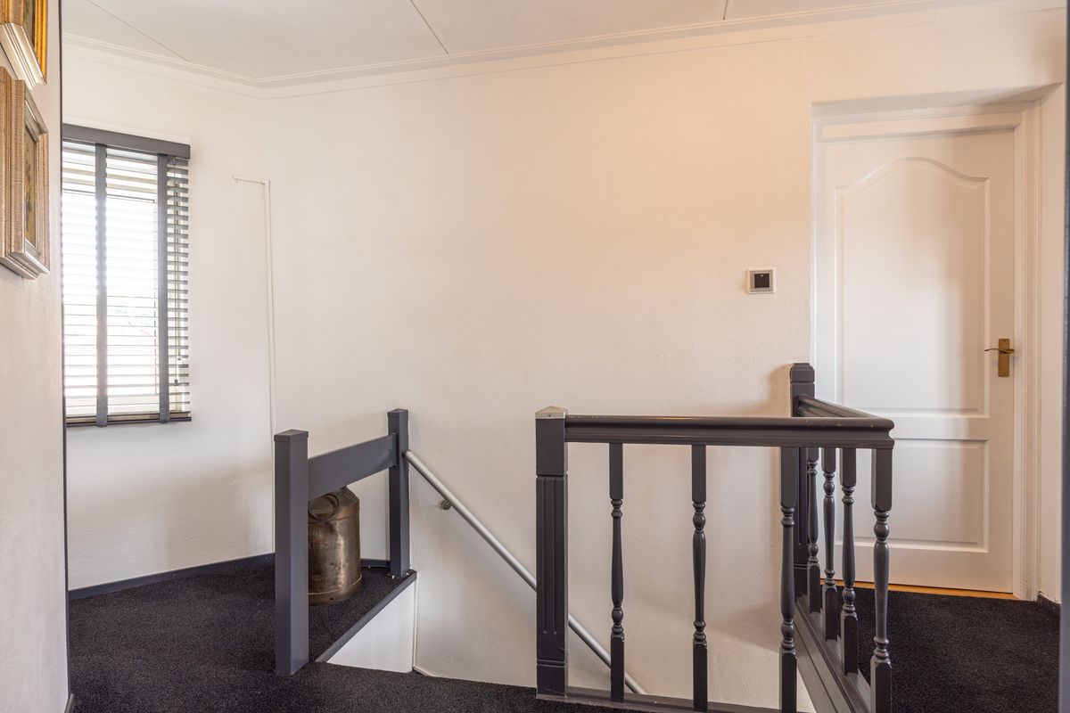 De trap vanuit de ontvangsthal brengt je naar de eerste verdieping. De overloop is afgewerkt met tapijt en beschikt over ramen aan de voor- en achterzijde, beide voorzien van rolluiken.