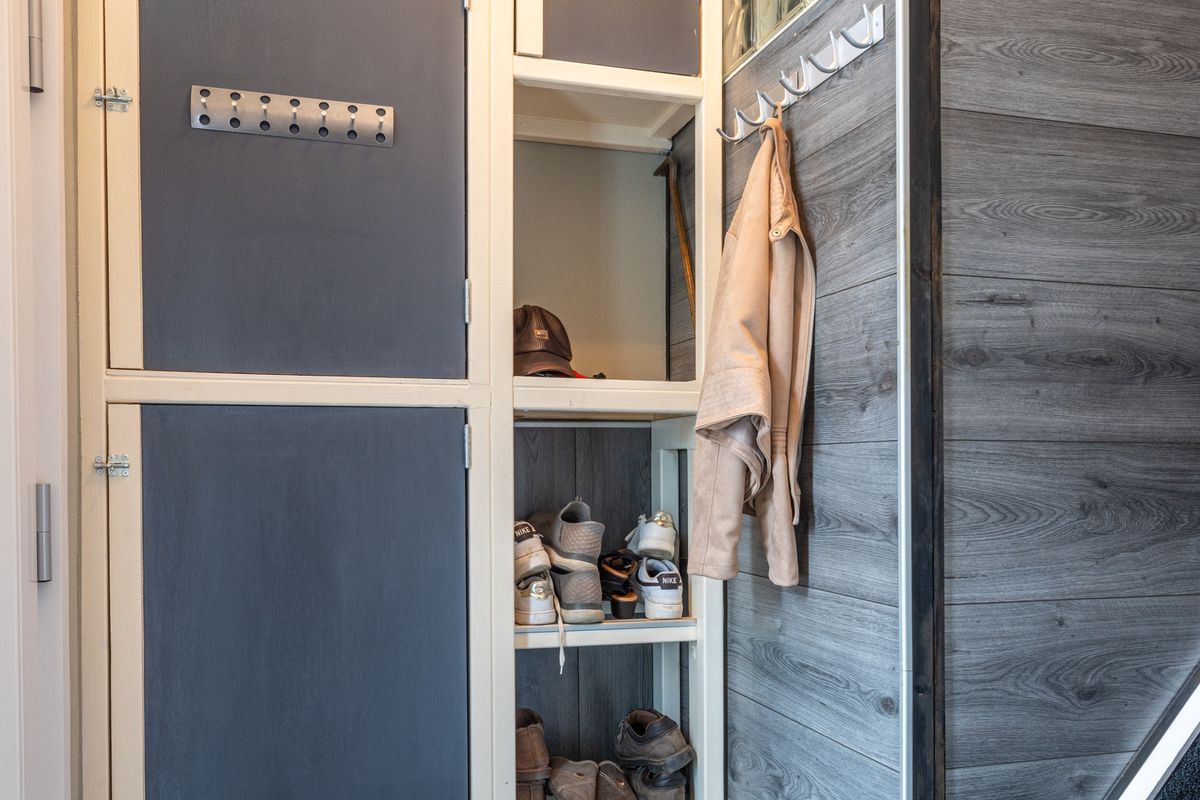 De achtertuin is verzorgd aangelegd met borders en bestrating. Achterin bevindt zich een overkapping met een kleine schuur en een praktische vliering. Deze ruimte is ideaal voor het stallen van fietsen of opbergen van gereedschap. De tuin beschikt daarnaast over een eigen achterom.