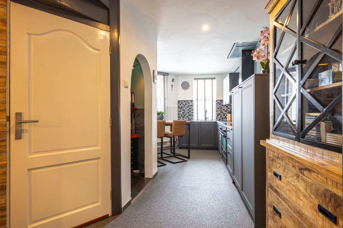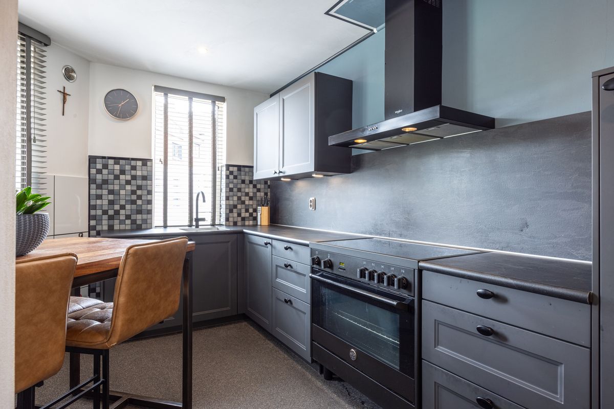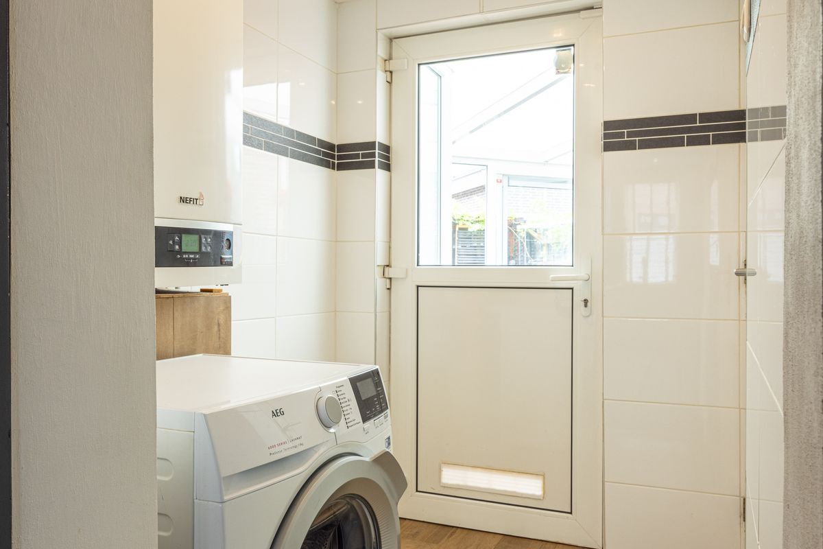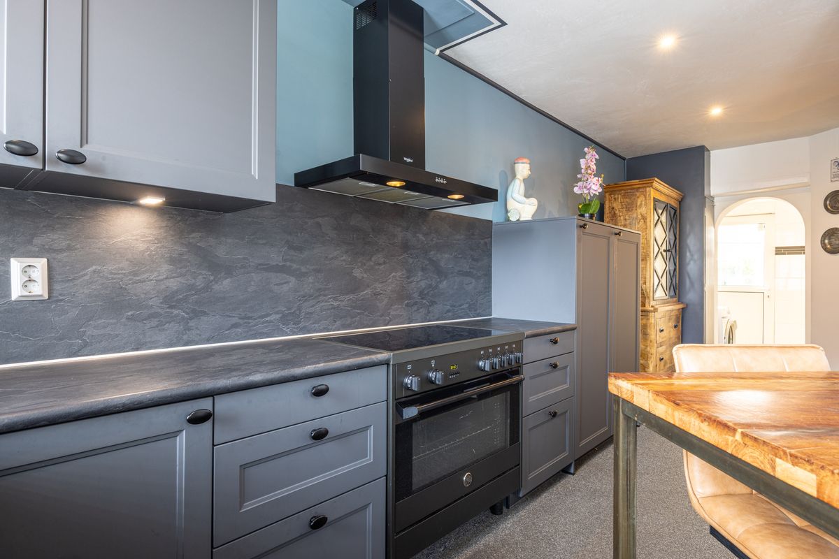 Dankzij de hoekopstelling is er veel werk- en kastruimte. De keuken is uitgerust met een 5-pits inductiekookplaat, afzuigkap, heteluchtoven met grillfunctie, koelkast, vriezer en vaatwasser. Extra praktisch is de inloopkast voor voorraadopslag. Vanuit de keuken heb je bovendien toegang tot de provisiekelder. Aansluitend aan de keuken ligt de bijkeuken met cv-installatie, witgoedaansluitingen en toegang tot zowel de badkamer als de tuinkamer. De badkamer is in 2024 volledig vernieuwd en modern uitgevoerd met een badkamermeubel met dubbele wasbak, spiegel met verlichting, inloopdouche, zwevend toilet en een designradiator.