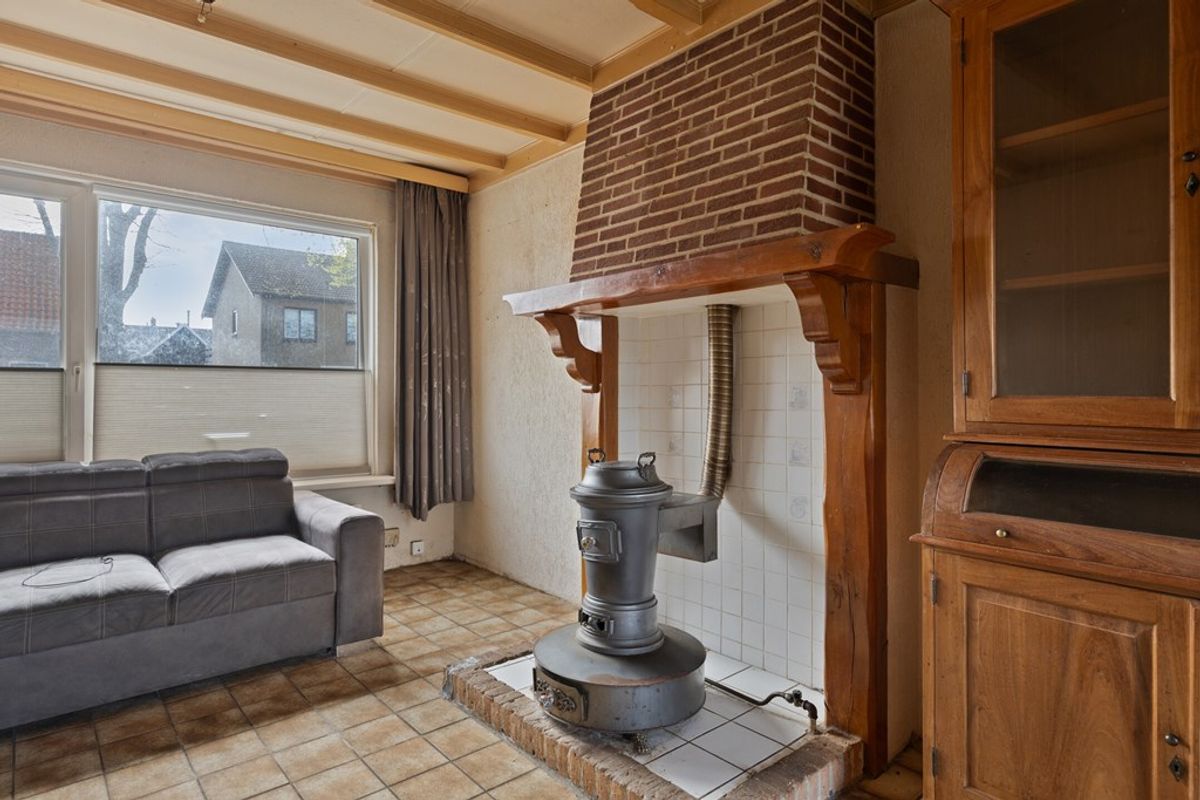 • Woonkamer met semi-open keuken: Een woonkamer met het zitgedeelte aan de voorzijde met een gaskachel en het eetgedeelte in de uitbouw aan de achterzijde van de woning. De keuken heeft extra lichtinval door de lichtkoepel. Vanuit de keuken is de bijkeuken te bereiken.