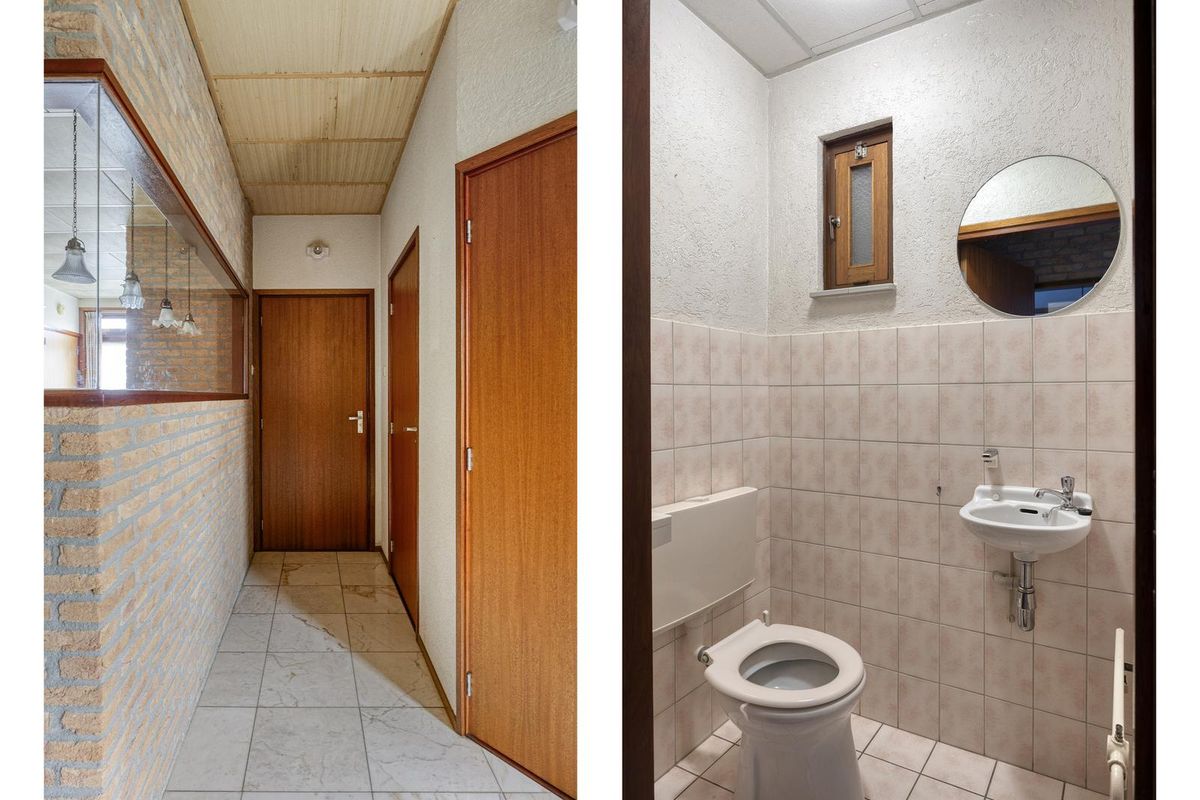 Het toilet is afgewerkt met een tegelvloer, tegels met daarboven spachtelputz als wandafwerking en een systeemplafond. Het toilet is voorzien van een staand closet en een fonteintje.