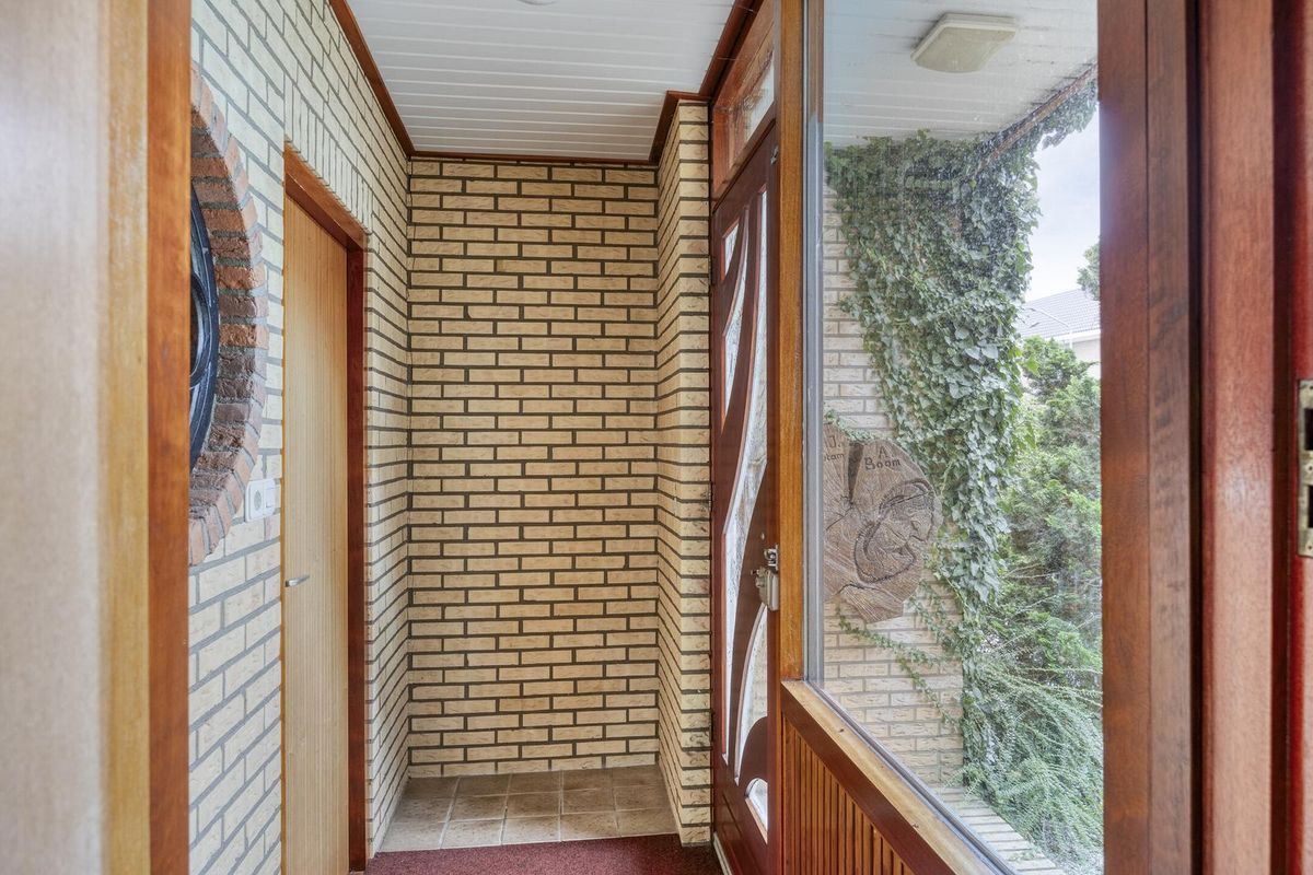 De entree aan de zijkant van de woning, middels de luifel bereikbaar, is afgewerkt met een tegelvloer, schoonmetselwerk als wandafwerking en een schrootjes plafond. De entree geeft toegang tot de hal en de bijkeuken.