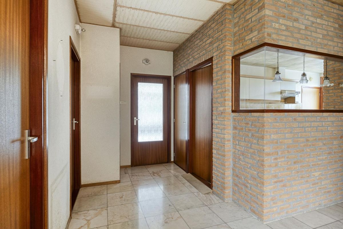 De hal is afgewerkt met een tegelvloer, deels schoonmetselwerk deels spachtelputz als wandafwerking en een systeemplafond. De lichte ruime hal is voorzien van een raam wat uitkijkt op de keuken. De hal is voorzien van twee bergkasten en geeft toegang tot het toilet, de badkamer, de keuken, de meterkast (8x 220V en 2 aardlekschakelaars), de woonkamer en twee slaapkamers.
