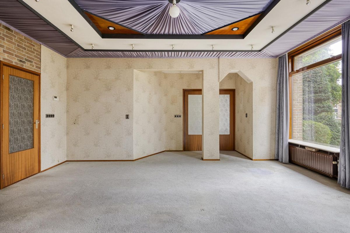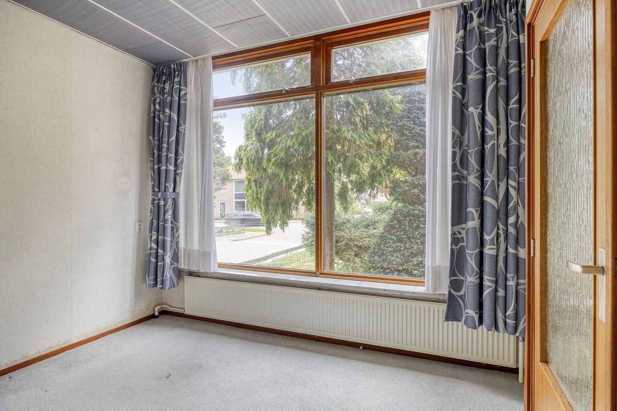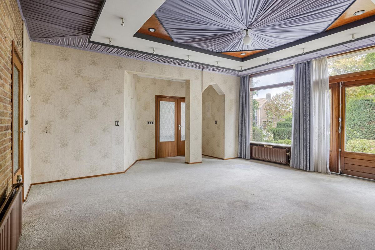 De woonkamer is afgewerkt met vloerbedekking, deels schoonmetselwerk en deels behang als wandafwerking en een beweegbaar sierplafond met spotverlichting. De royale raampartijen zorgen voor veel daglichttoetreding. De woonkamer geeft toegang tot de slaapkamer/werkkamer aan de voorkant van de woning en middels een openslaande deur tot de voortuin.