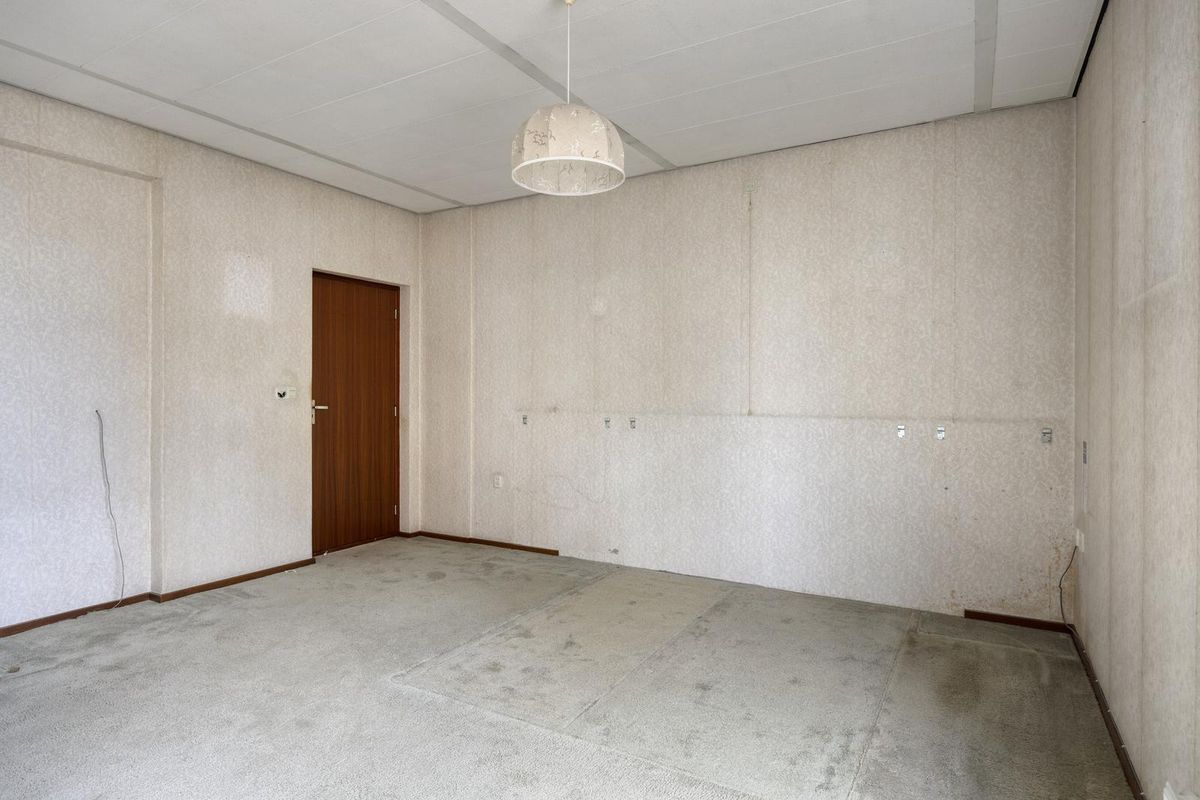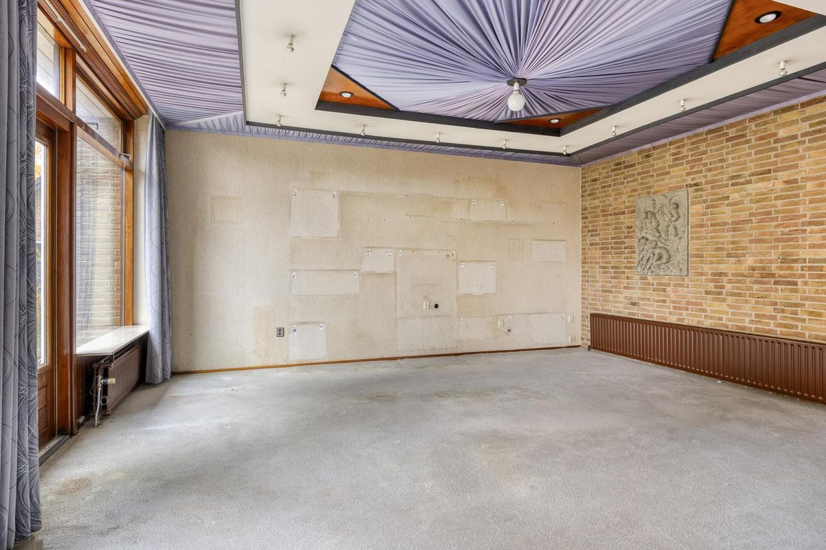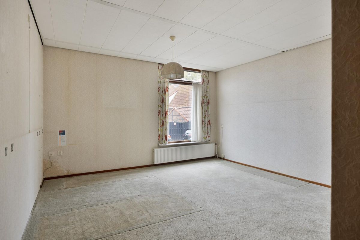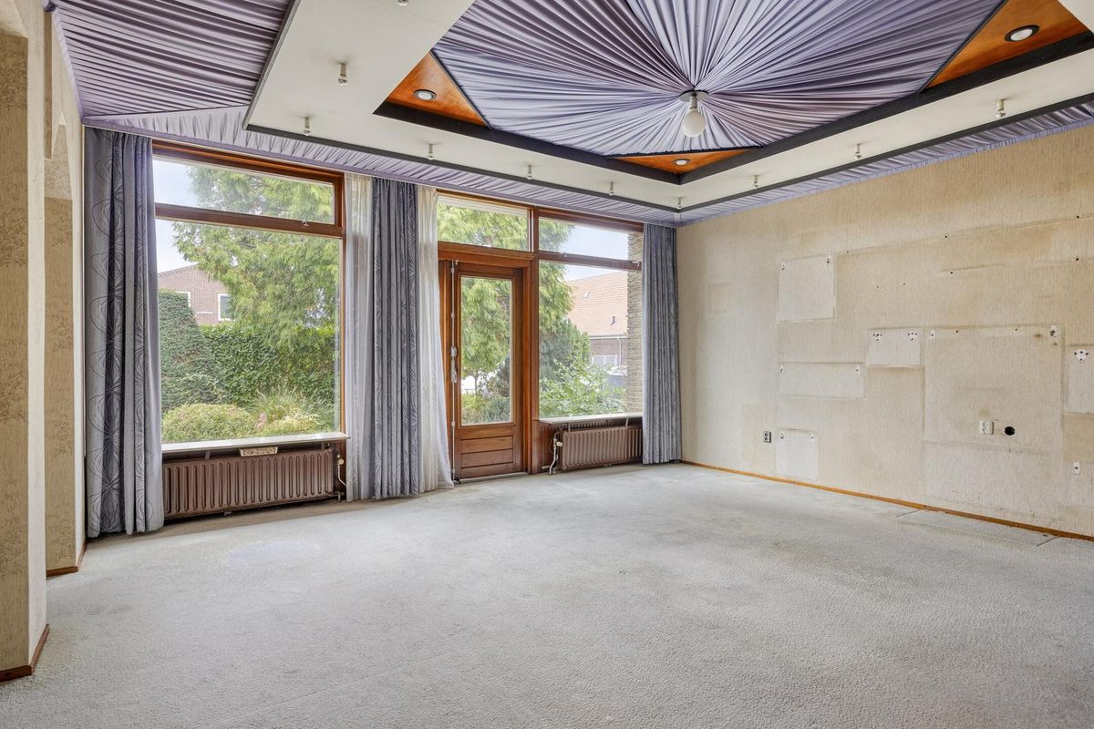 De woonkamer is afgewerkt met vloerbedekking, deels schoonmetselwerk en deels behang als wandafwerking en een beweegbaar sierplafond met spotverlichting. De royale raampartijen zorgen voor veel daglichttoetreding. De woonkamer geeft toegang tot de slaapkamer/werkkamer aan de voorkant van de woning en middels een openslaande deur tot de voortuin.