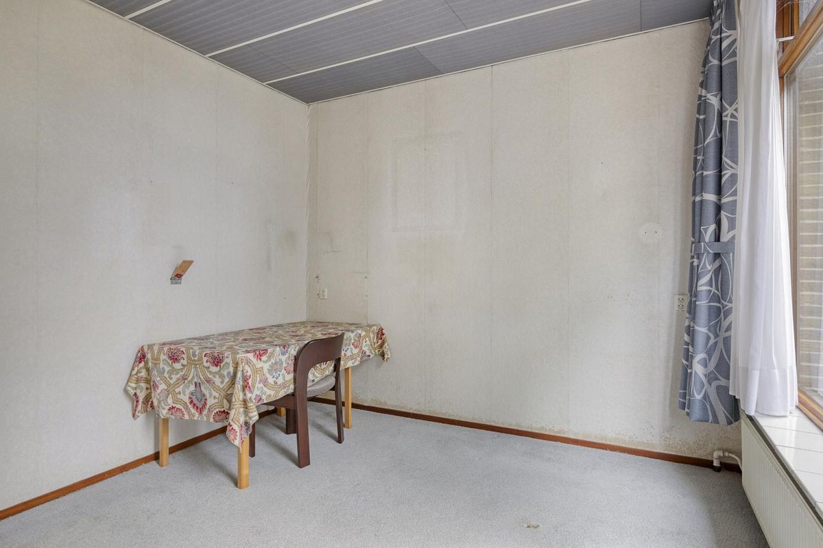 De slaapkamer/werkkamer aan de voorkant van de woning is afgewerkt met vloerbedekking, behang als wandafwerking en een systeemplafond. De slaapkamer is voorzien van een bergkast.