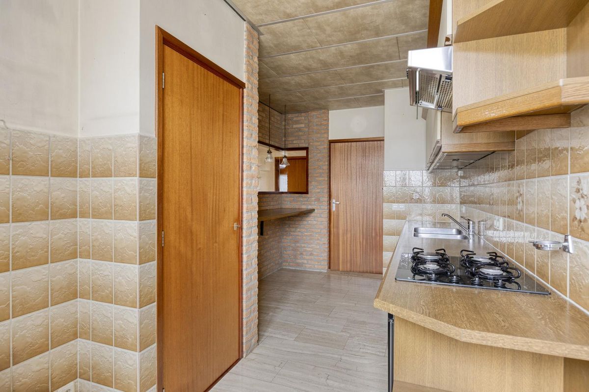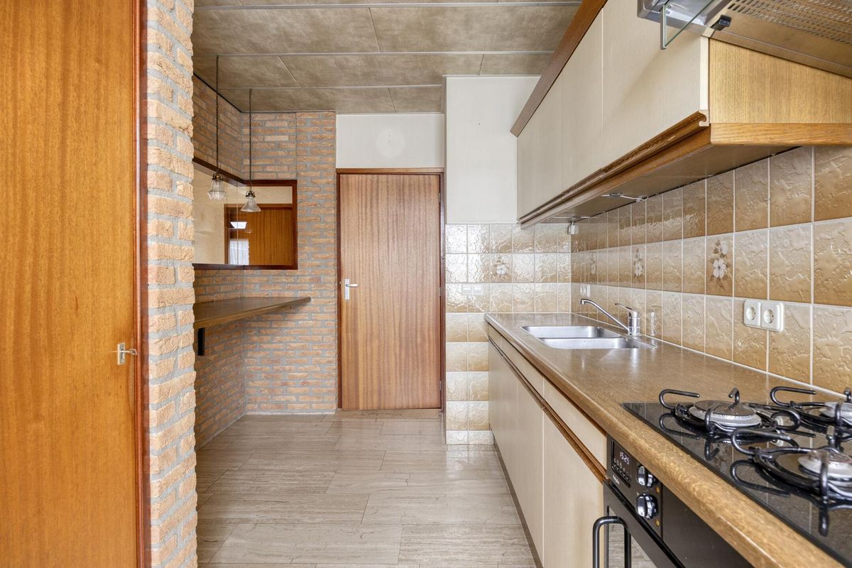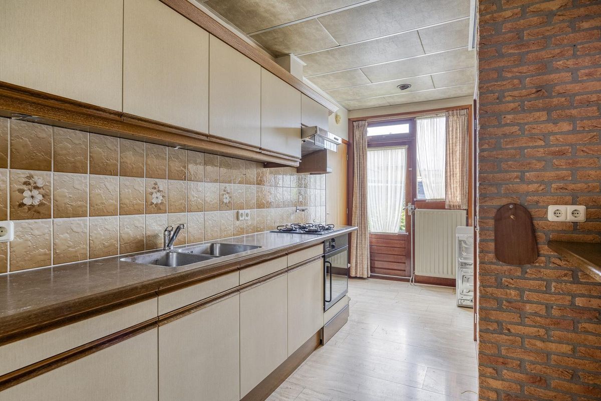 De keuken is afgewerkt met een tegelvloer, deels schoonmetselwerk, tegels als wandafwerking en een systeemplafond. De keuken in rechte opstelling is voorzien van een kunststof aanrechtblad, een 4-pits gasfornuis, oven, afzuigkap (Pelgrim), een dubbele spoelbak en wasmachine-aansluiting. De keuken is voorzien van een bergkast en geeft toegang tot de kruipruimte onder de woning, technische ruimte waar zich de opstelplaats voor de Nefit Excellent cv-combiketel bevindt en middels een openslaande deur tot de zijtuin.