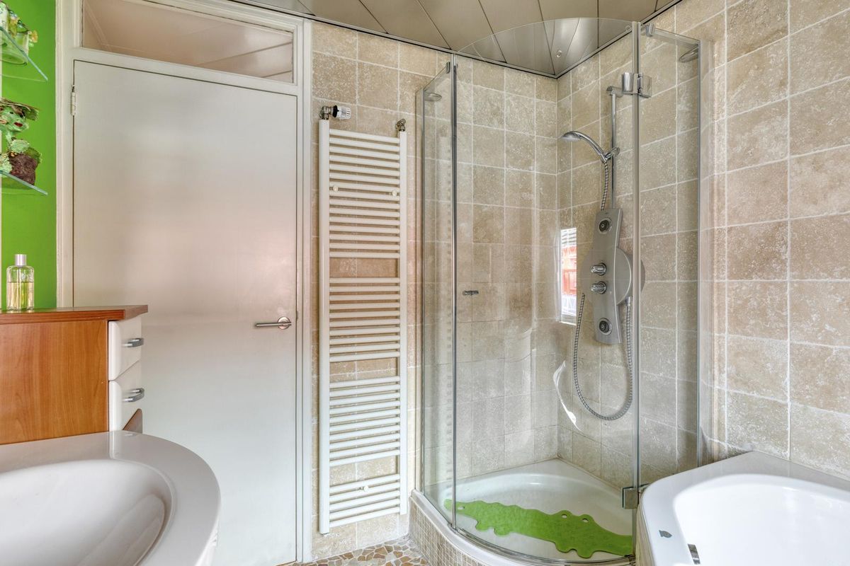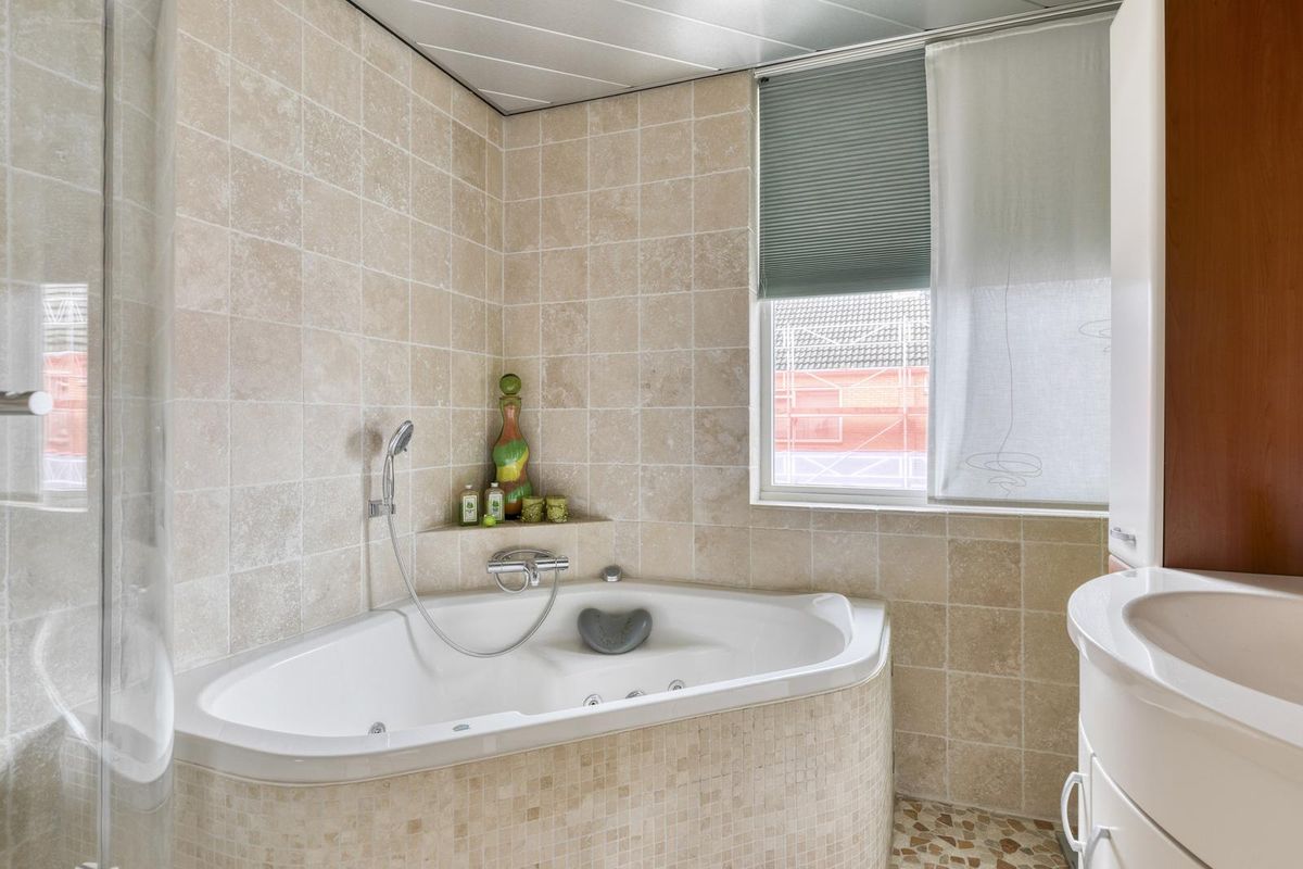 De badkamer is volledig betegeld en uitgerust met een hoekbad, een douche en een wastafelmeubel – een fijne plek om je dag ontspannen te beginnen of af te sluiten.