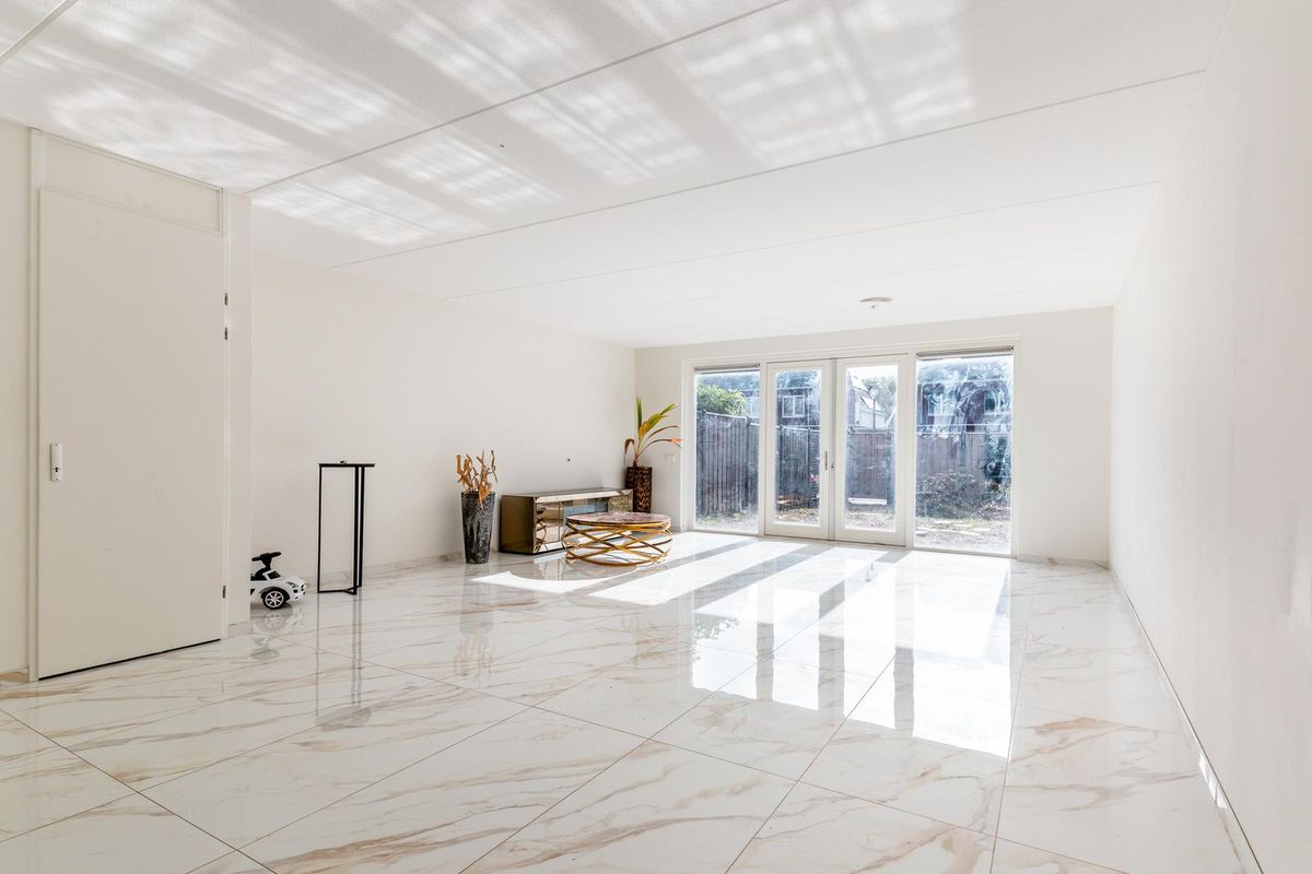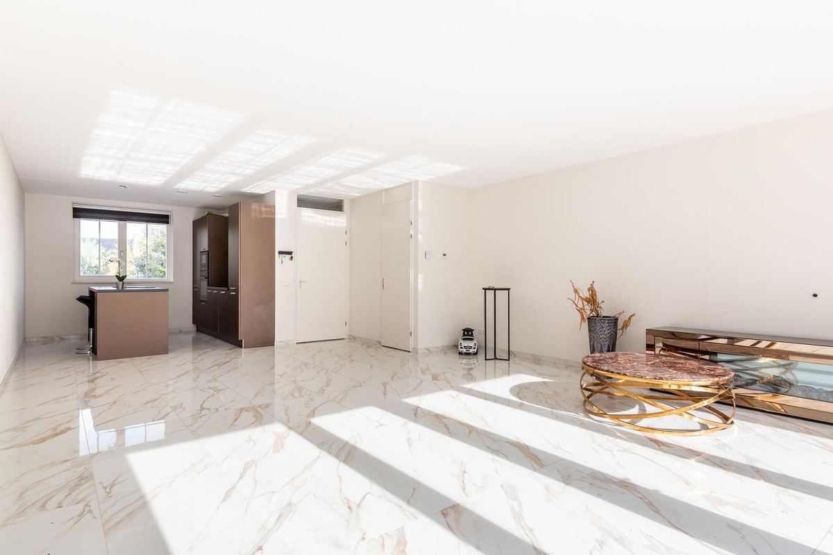 De gehele begane grond is voorzien van een nette marmeren tegelvloer met vloerverwarming, wat zorgt voor een luxe uitstraling en optimaal comfort. De woonkamer maakt direct indruk: door de uitbouw vanuit de bouw is de living maar liefst 11 meter diep. Er is ruimte genoeg voor een grote zithoek, een royale eettafel en zelfs een speel- of werkhoek. De grote raampartijen zorgen voor veel licht en via de dubbele openslaande deuren loop je zo de tuin in.
