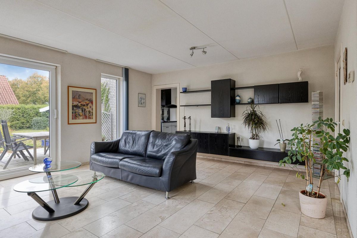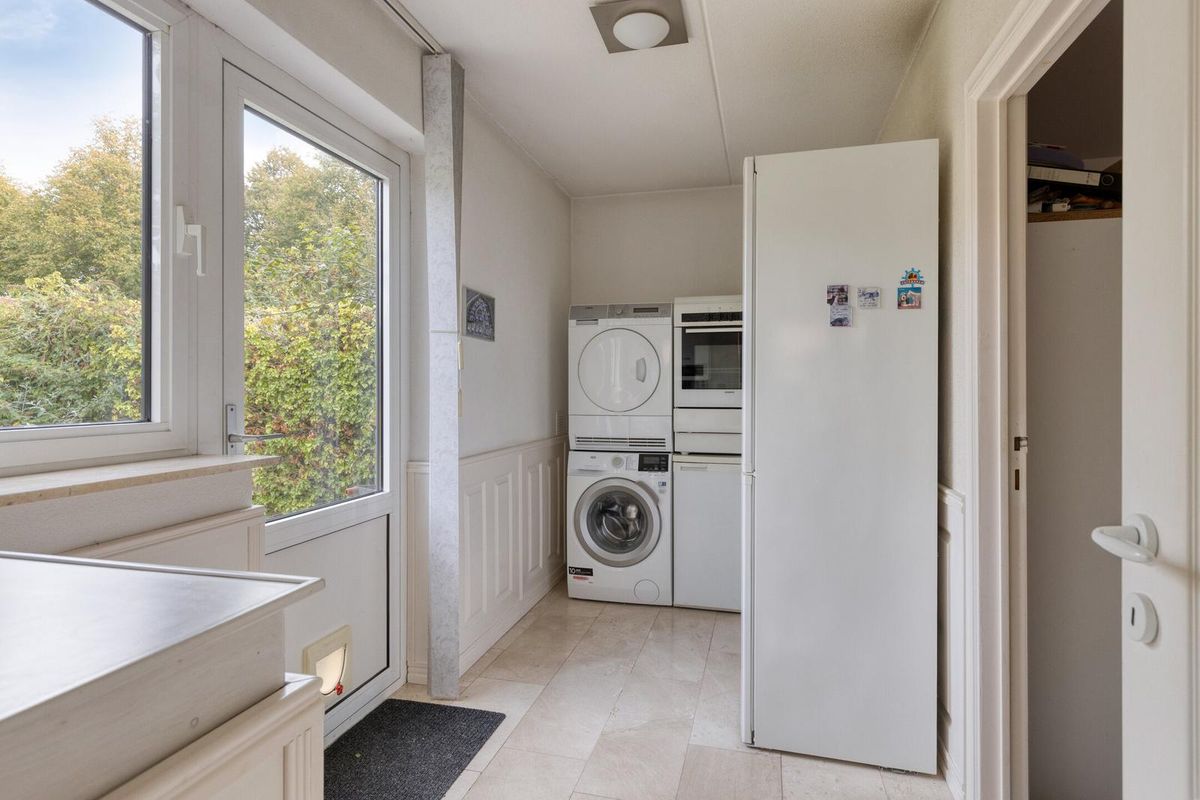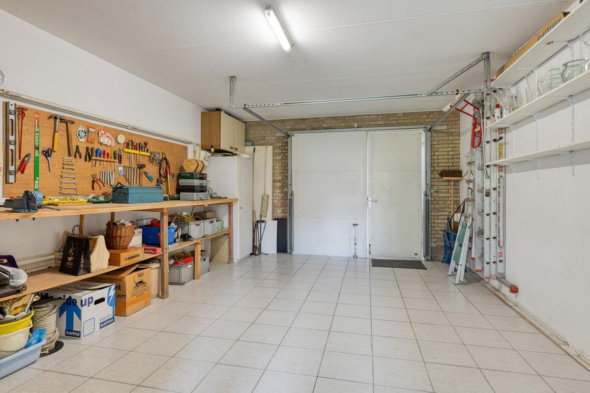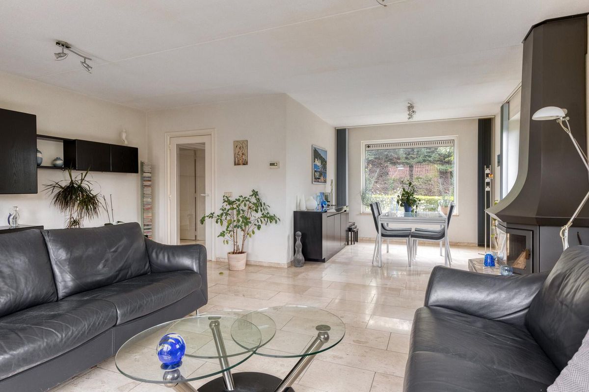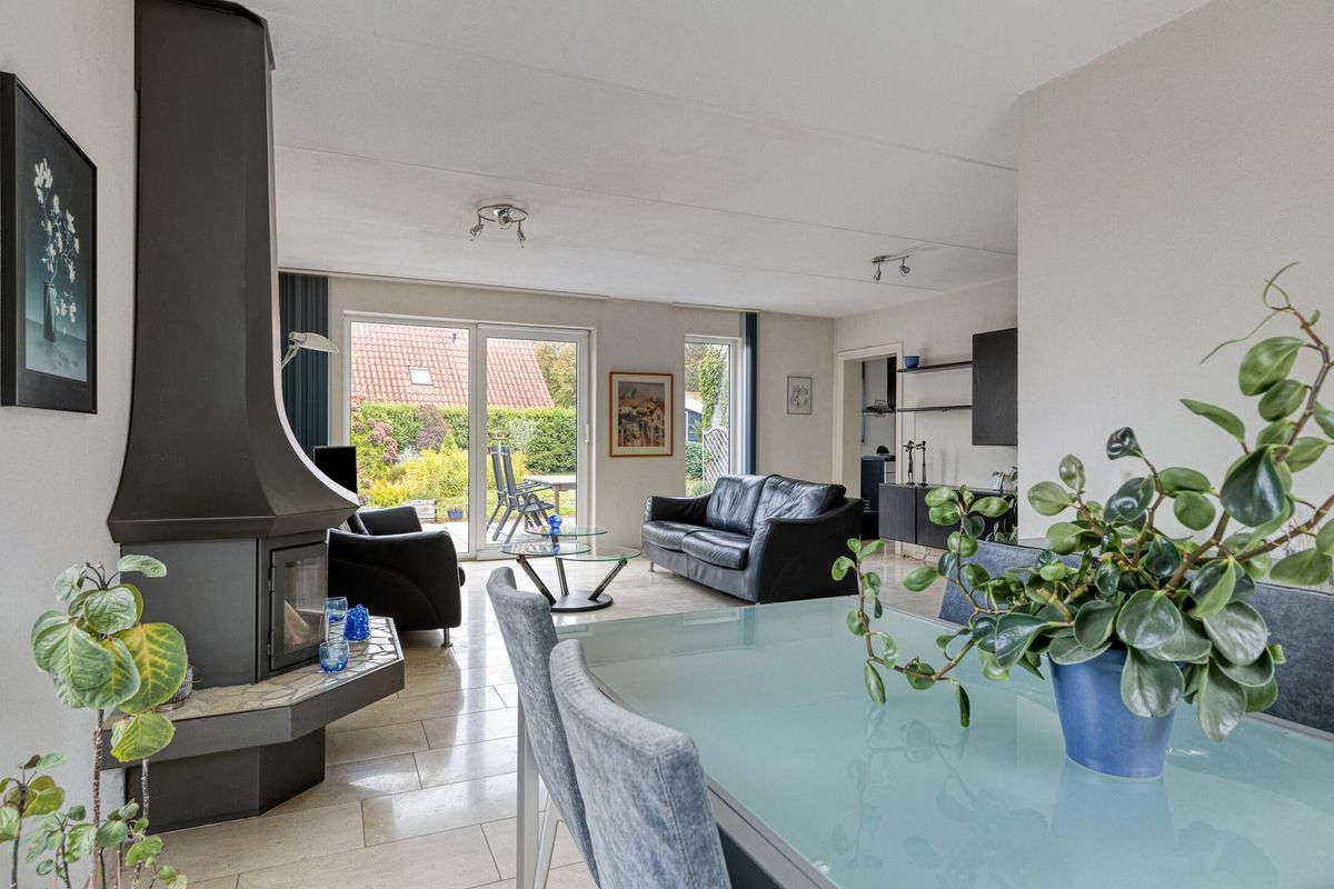 Vanuit de hal stap je de lichte woonkamer binnen met schuifpui naar de tuin, veel lichtinval en een gezellige haard. De keuken staat in een halfopen verbinding met de woonkamer, is praktisch ingericht met diverse apparatuur en grenst aan de bijkeuken (met witgoedaansluitingen), die toegang geeft tot de tuin en de ruime inpandige garage.
