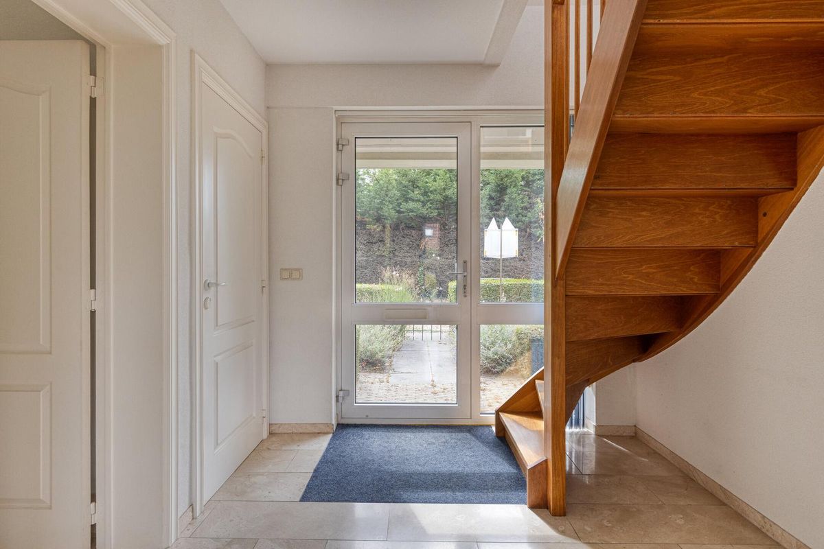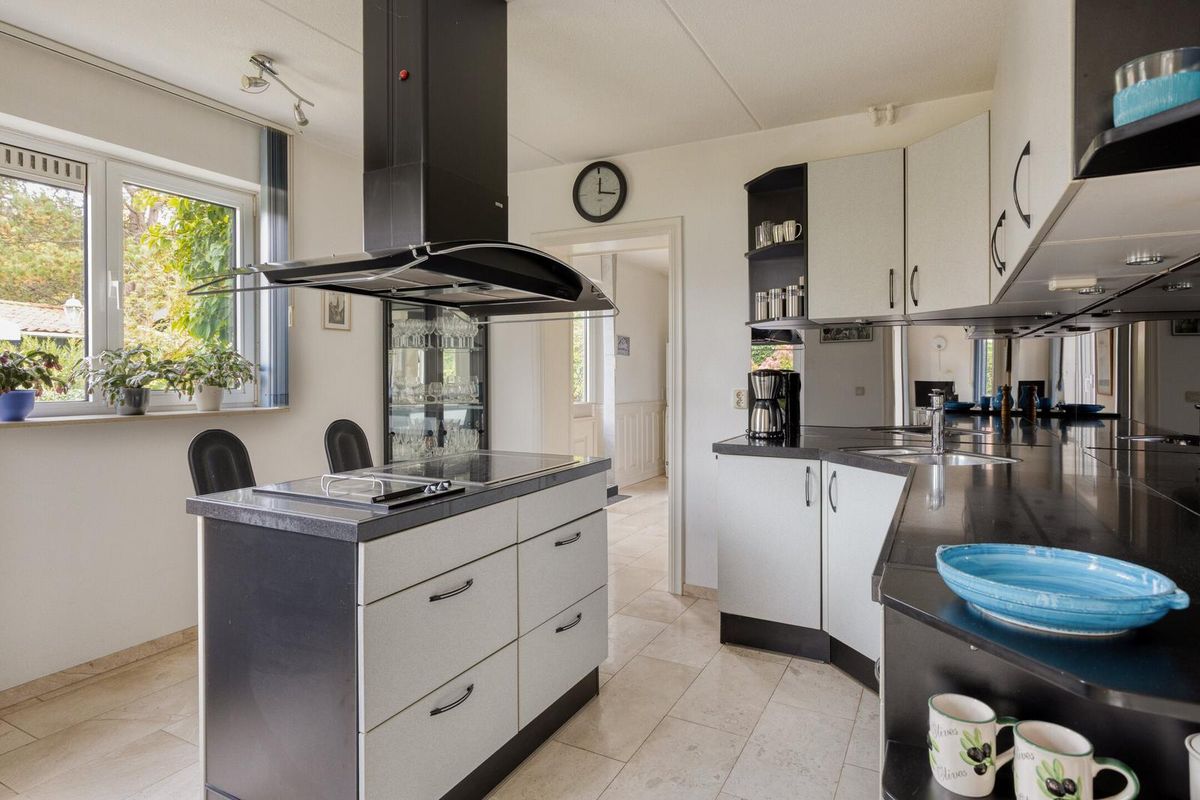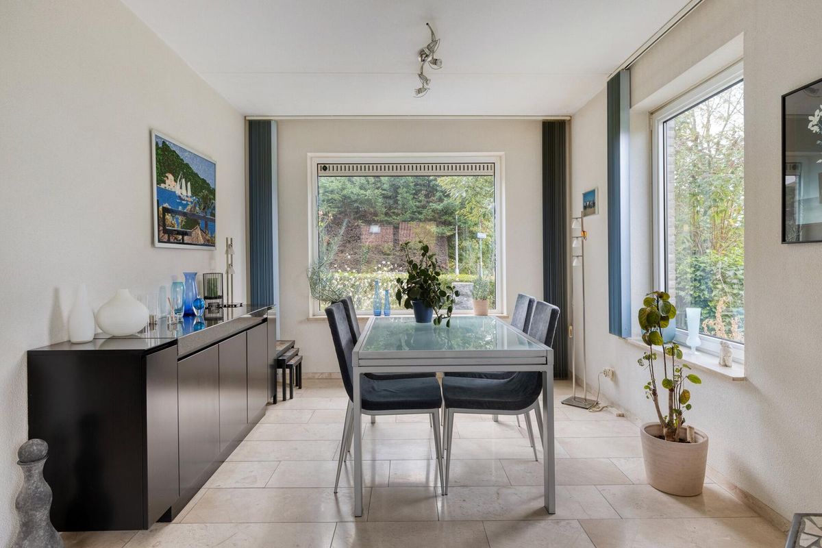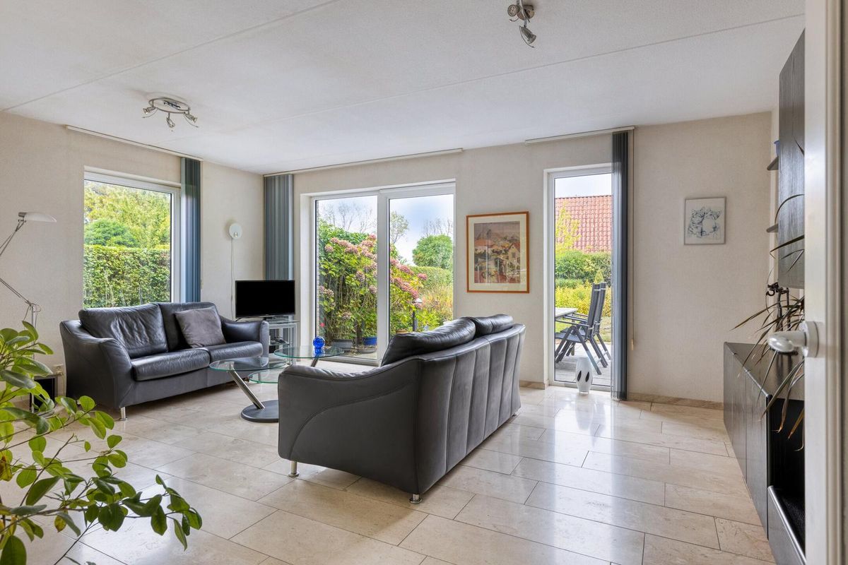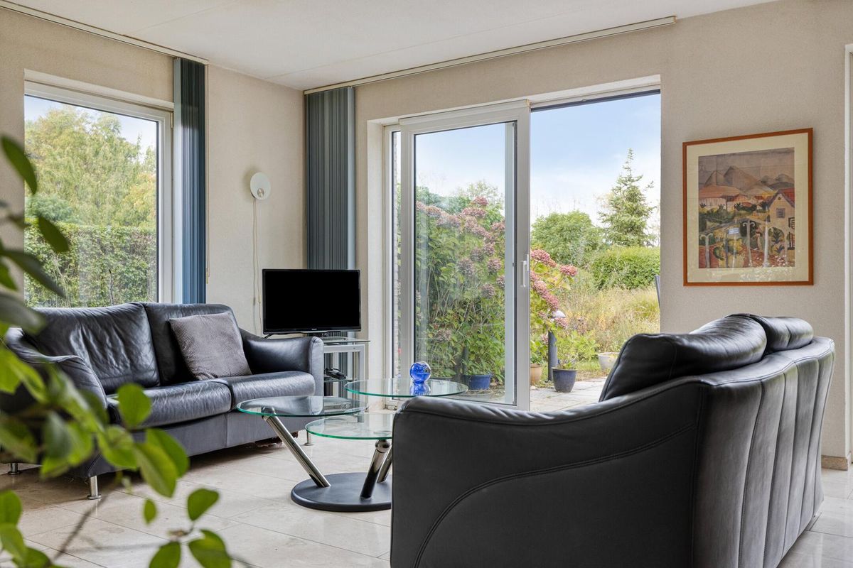 Vanuit de hal stap je de lichte woonkamer binnen met schuifpui naar de tuin, veel lichtinval en een gezellige haard. De keuken staat in een halfopen verbinding met de woonkamer, is praktisch ingericht met diverse apparatuur en grenst aan de bijkeuken (met witgoedaansluitingen), die toegang geeft tot de tuin en de ruime inpandige garage.