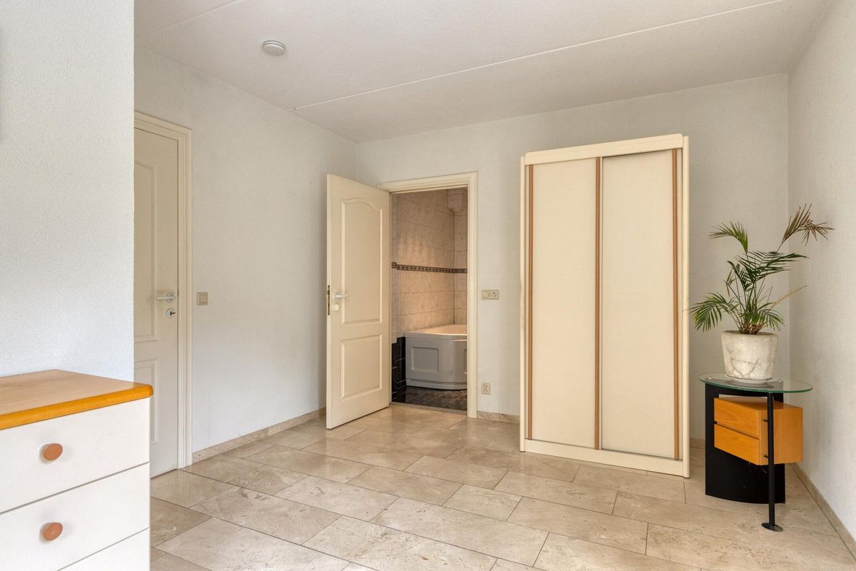 Wanneer je thuiskomt, parkeer je je auto op eigen terrein. Via de verzorgde voortuin bereik je de hal, voorzien van een meterkast en toilet. De hal grenst aan een ruime slaapkamer met eigen badkamer, voorzien van een douche, ligbad, badmeubel (met wastafel) en een toilet.