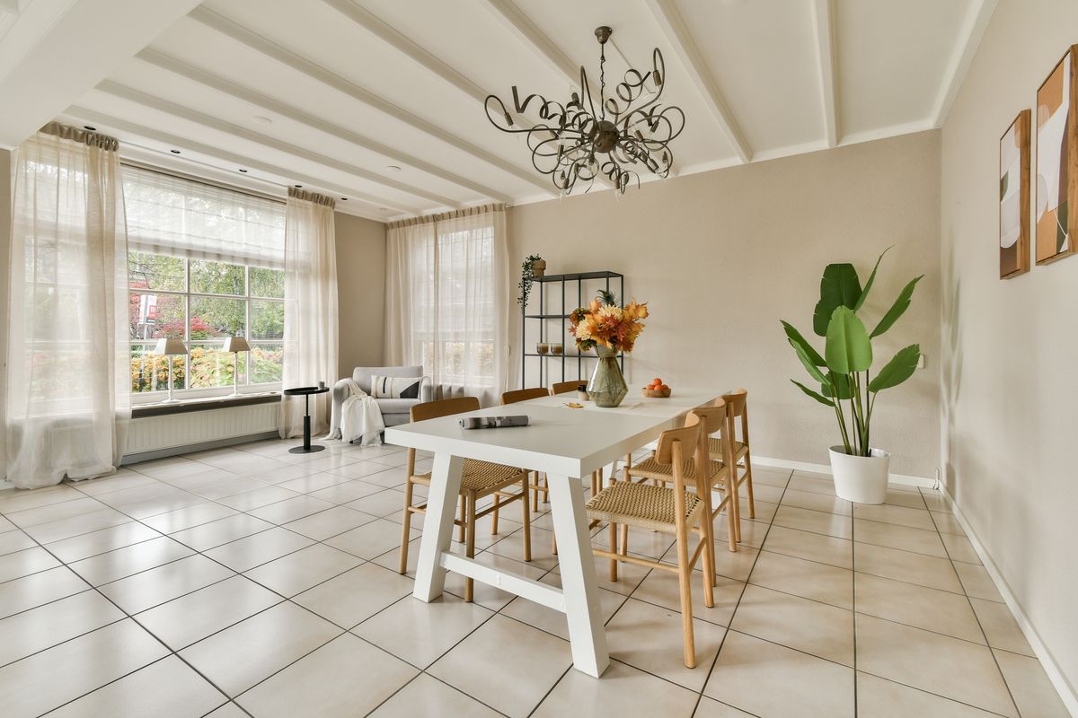 De ruime woonkamer is aan de voorzijde gelegen en heeft een fijne woonsfeer, mede dankzij de sfeervolle open haard. De grote raampartijen zorgen voor veel natuurlijk licht in de woning.