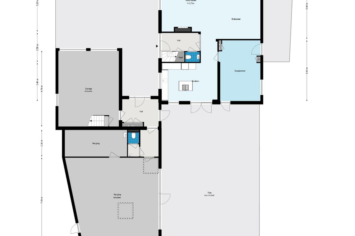 Het grote bijgebouw heeft een eigen entree aan de voorzijde en bestaat op de begane grond uit een hal met een uitgebreide meterkast en een moderne toiletruimte met vrijhangend toilet en fonteintje. Daarnaast biedt het toegang tot de bedrijfs-/praktijkruimte met magazijn en de dubbele garage aan de voorzijde. Het bijgebouw biedt een scala aan mogelijkheden voor een kantoor, praktijk of bedrijf aan huis en is tevens uitermate geschikt als extra woonruimte voor kinderen en/of ouders.