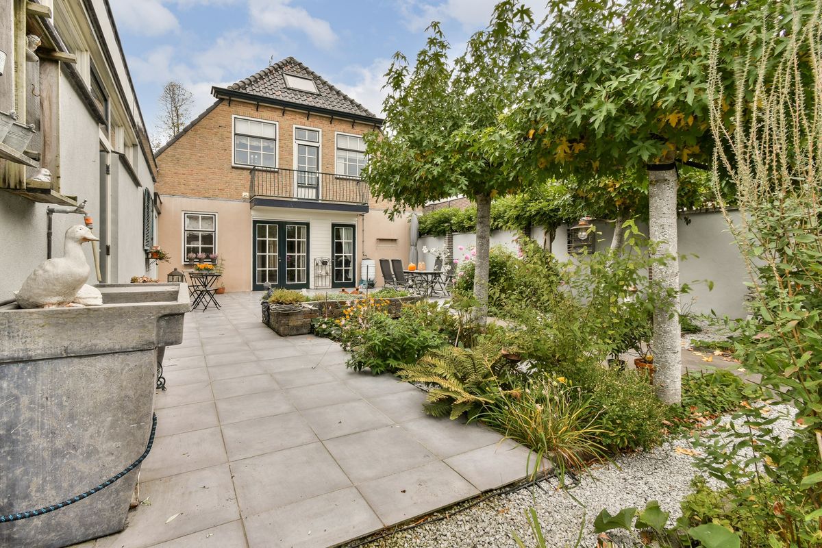 De halfopen keuken is aan de tuinzijde gelegen en voorzien van een moderne L-vormige opstelling met een hardstenen werkblad en diverse inbouwapparatuur. Het aanwezige kookeiland beschikt over een 5-pits gaskookplaat en een RVS-afzuigkap en wordt tevens gebruikt als zitbar. Vanuit de keuken bieden openslaande deuren toegang tot de grote, zonnige tuin met sierbestrating, borders en diverse terrassen. Vanuit de tuin is er toegang tot het grote bijgebouw en de vrijstaande garage aan de achterzijde.