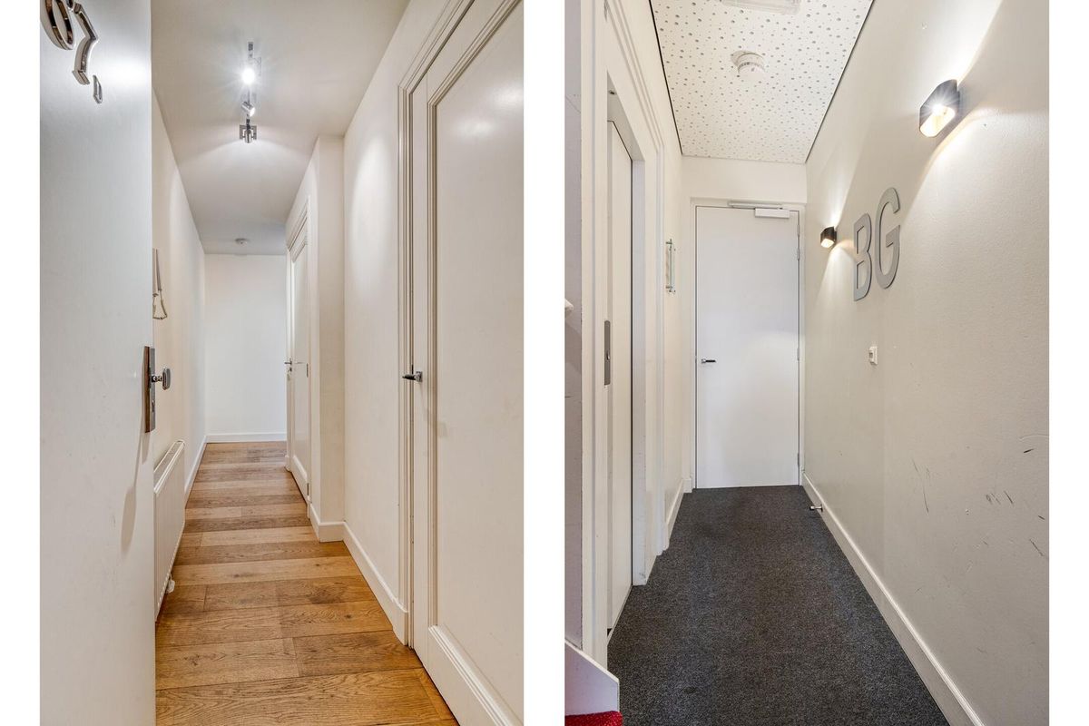 Via de gezamenlijke entree op de begane grond bereik je de woning per trap of lift. De entree van het appartement bevindt zich op de tweede verdieping. Een ruime, L-vormige hal geeft toegang tot de verschillende vertrekken, waaronder een separaat toilet en een vaste kast met opstelplaats voor de wasmachine- en wasdroger.