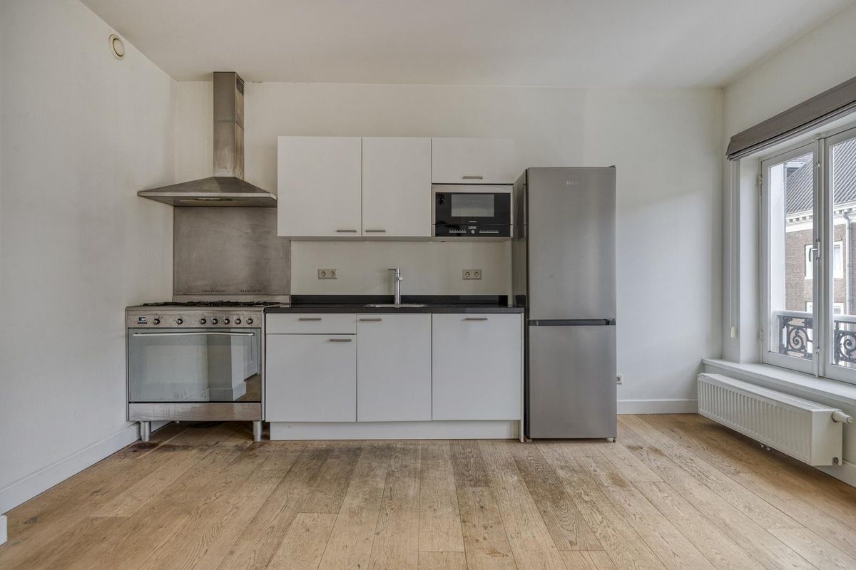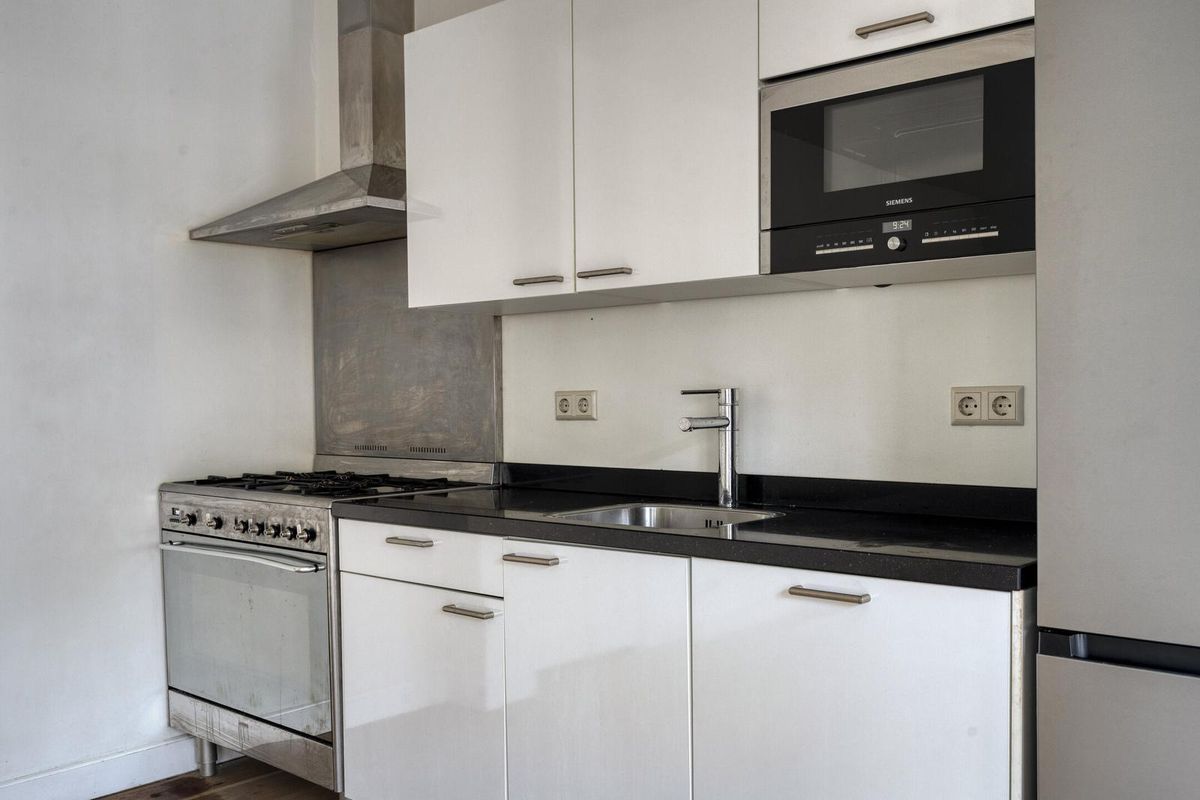 De lichte woonkamer met open keuken (ca. 4,19/3,03 x 6,54 m) is gesitueerd aan de voorzijde van het gebouw en biedt dankzij de grote ramen een prettige lichtinval. De karakteristieke schouw en het frans balkon voegen extra sfeer toe. De keuken is voorzien van diverse pparatuur, waaronder een vaatwasser, magnetron, oven en fornuis.