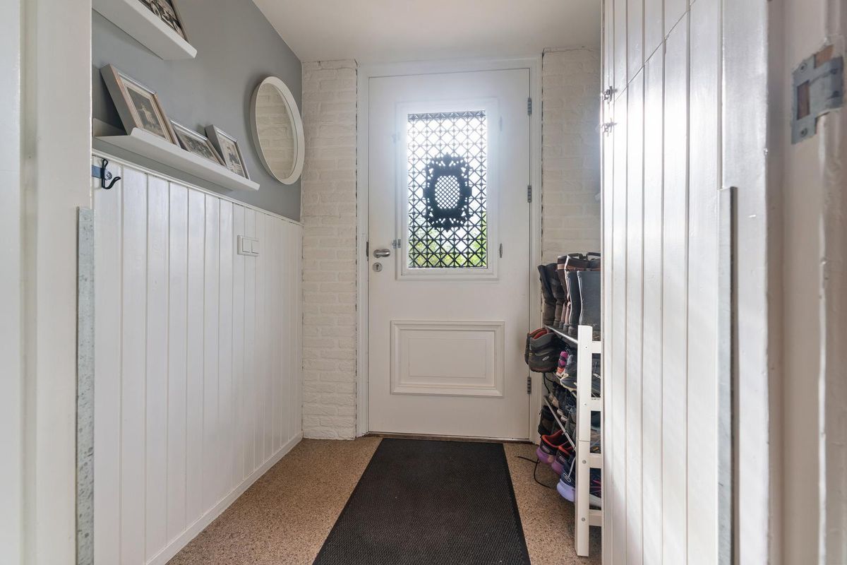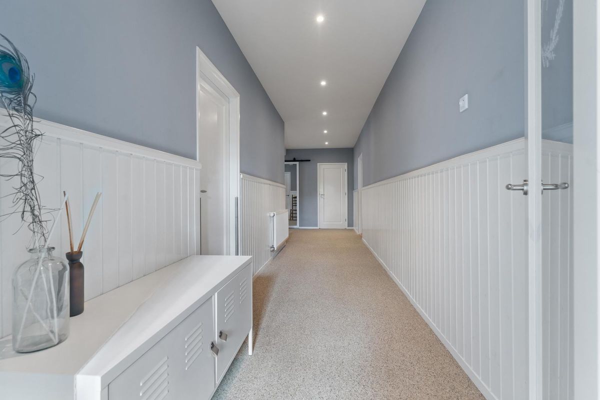 Via de voordeur met sierlijk roosterwerk stap je binnen in een lange hal, afgewerkt met halfhoge lambrisering en moderne spotverlichting. De ruimte is ruim en licht aan en biedt voldoende plaats voor een garderobe. Achter een schuifdeur met spiegel bevindt zich bovendien een praktische technische ruimte met opbergmogelijkheid. Verder vind je hier het toilet met een karakteristiek boerderijraampje, voorzien van een fonteintje. De grindvloer loopt vanuit de hal naadloos door naar de woonkamer en keuken, waardoor een rustige basis is gecreëerd. Op de begane grond zijn de woonkamer, gang, toilet, bijkeuken, keuken en badkamer bovendien voorzien van vloerverwarming.