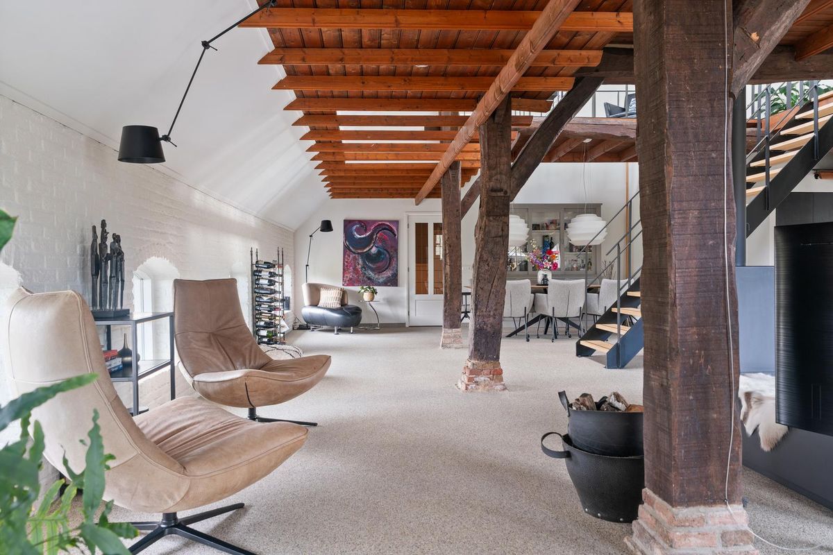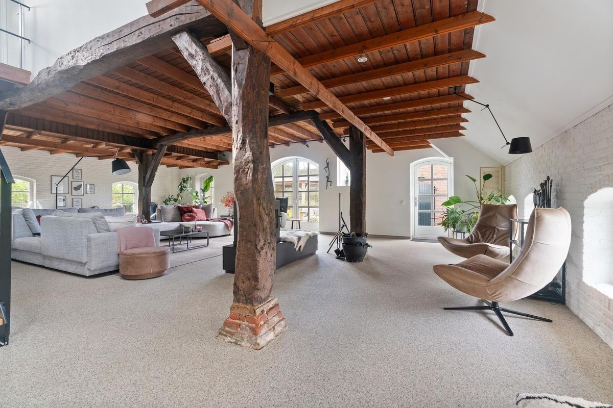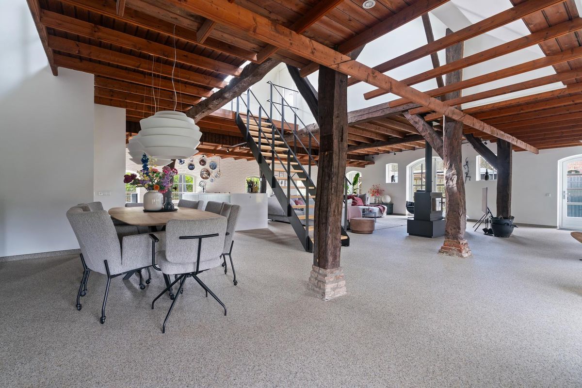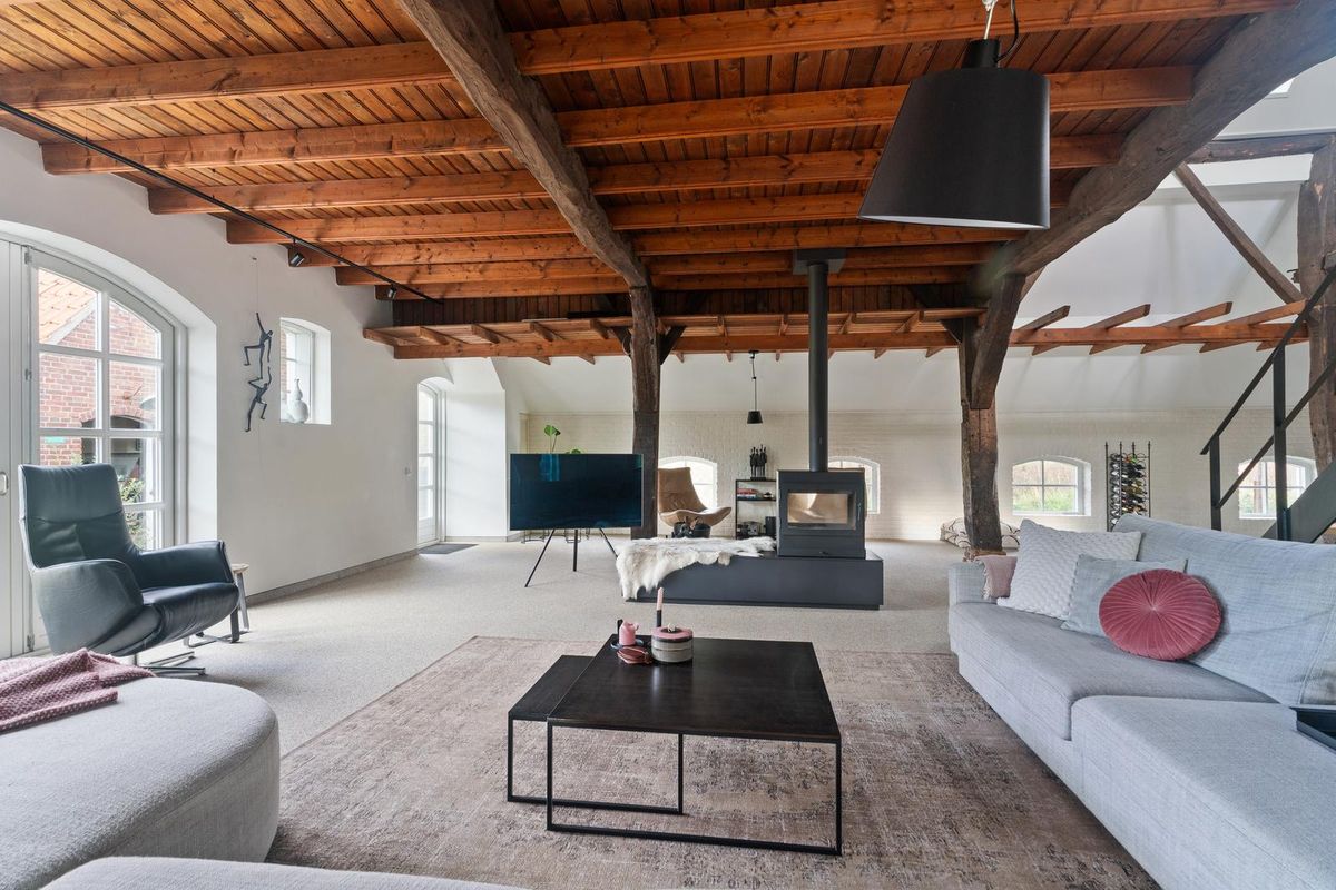 De woonkamer is ruim van opzet en straalt karakter uit. Houten gebinten en robuuste kolommen herinneren aan de historie van de boerderij, terwijl de typische boerderijramen zorgen voor extra sfeer en veel daglicht. De indeling maakt het mogelijk meerdere zithoeken én een royale eettafel te plaatsen. De houtkachel vormt het warme middelpunt van de ruimte.