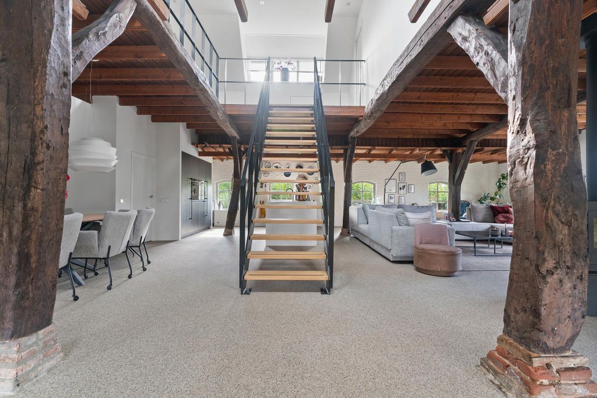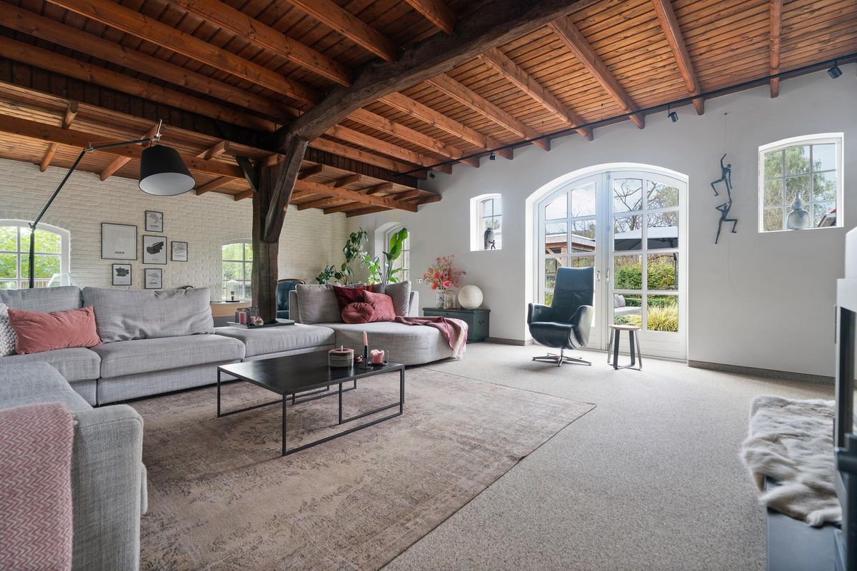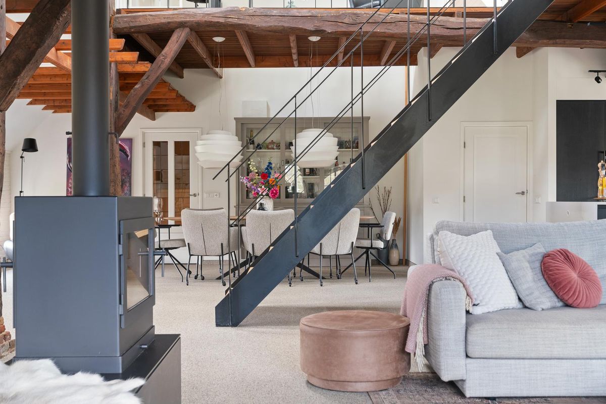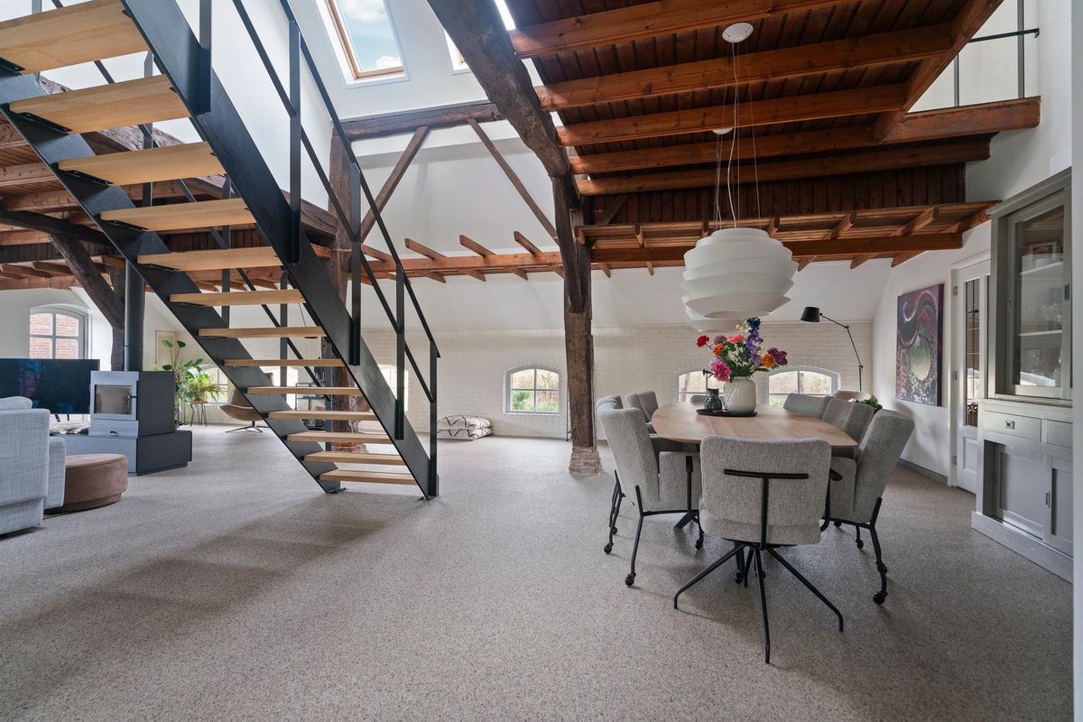 De woonkamer is ruim van opzet en straalt karakter uit. Houten gebinten en robuuste kolommen herinneren aan de historie van de boerderij, terwijl de typische boerderijramen zorgen voor extra sfeer en veel daglicht. De indeling maakt het mogelijk meerdere zithoeken én een royale eettafel te plaatsen. De houtkachel vormt het warme middelpunt van de ruimte.
