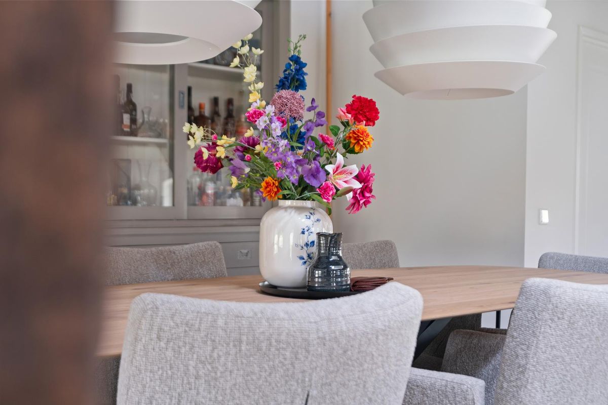 Aansluitend ligt de eethoek, met voldoende plaats voor een grote tafel en eventueel een tweede zithoek of werkruimte. De huidige indeling is doordacht en biedt volop mogelijkheden om de ruimte naar wens in te delen.